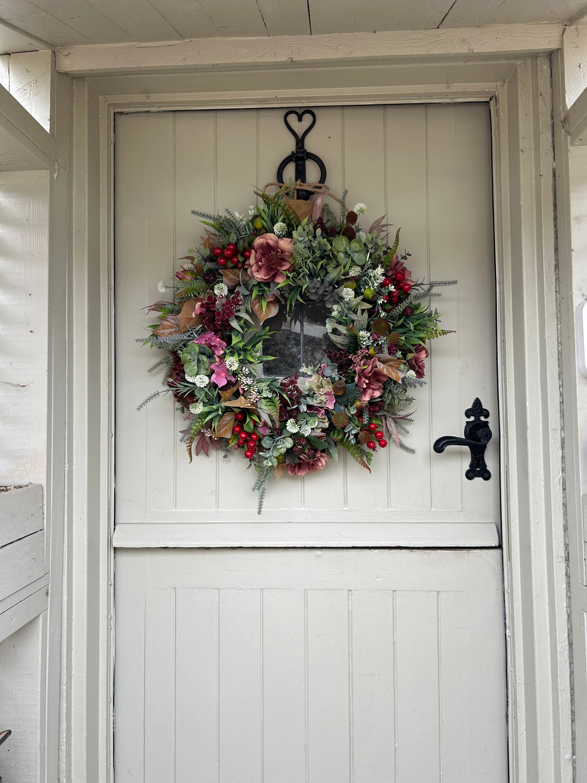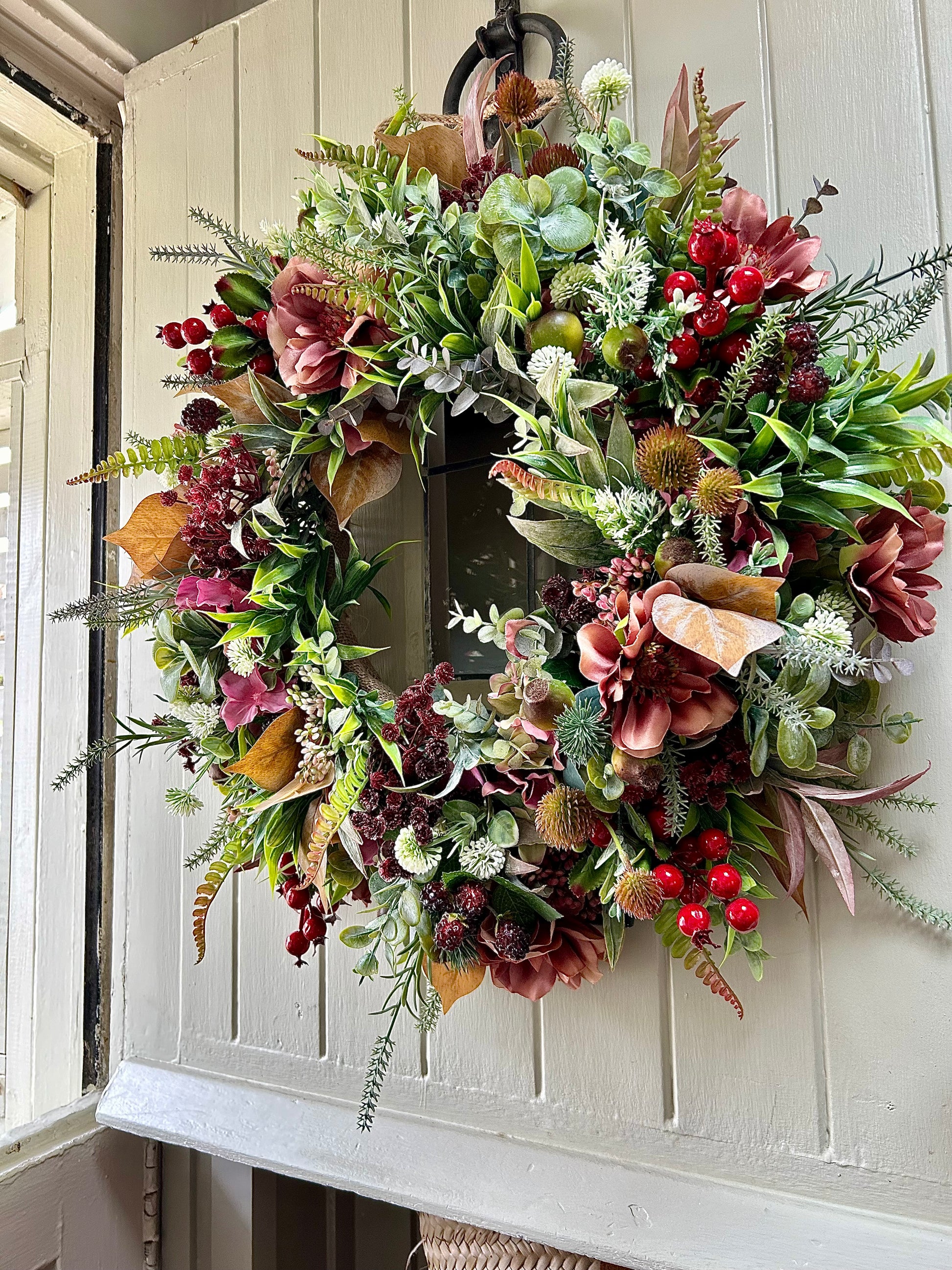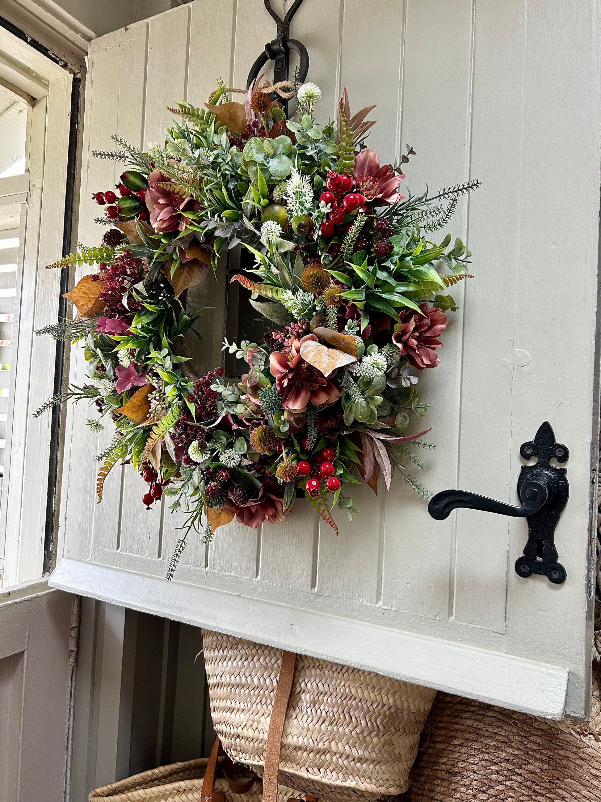 Introducing “BERRY” a sophisticated AUTUMN bloom artificial wreath. Crafted with roses plus dry touch roses and weather-protected, ensuring a beautiful display that will last for years. Plus, free shipping with purchase. Add a touch of elegance and beauty to your home.