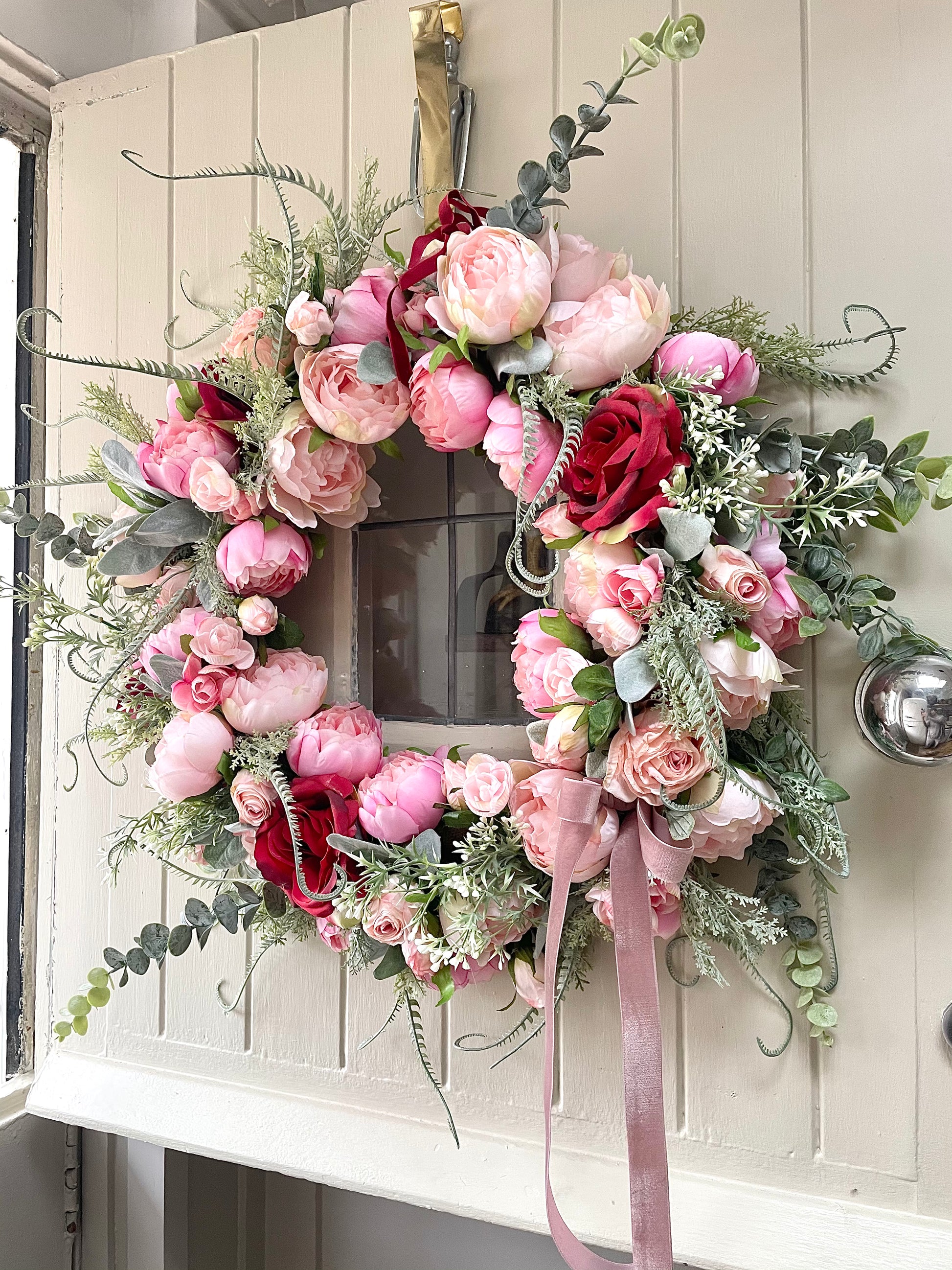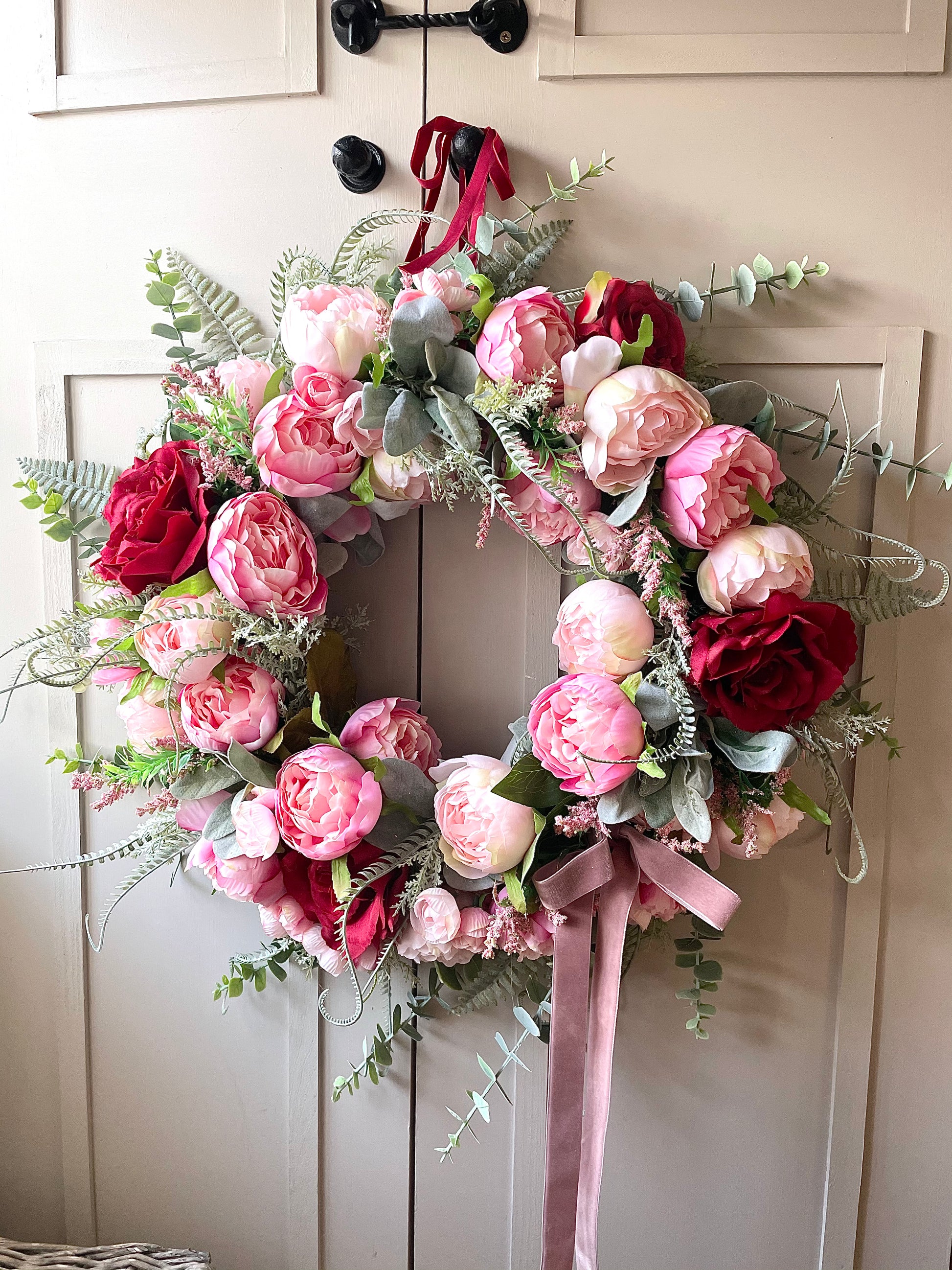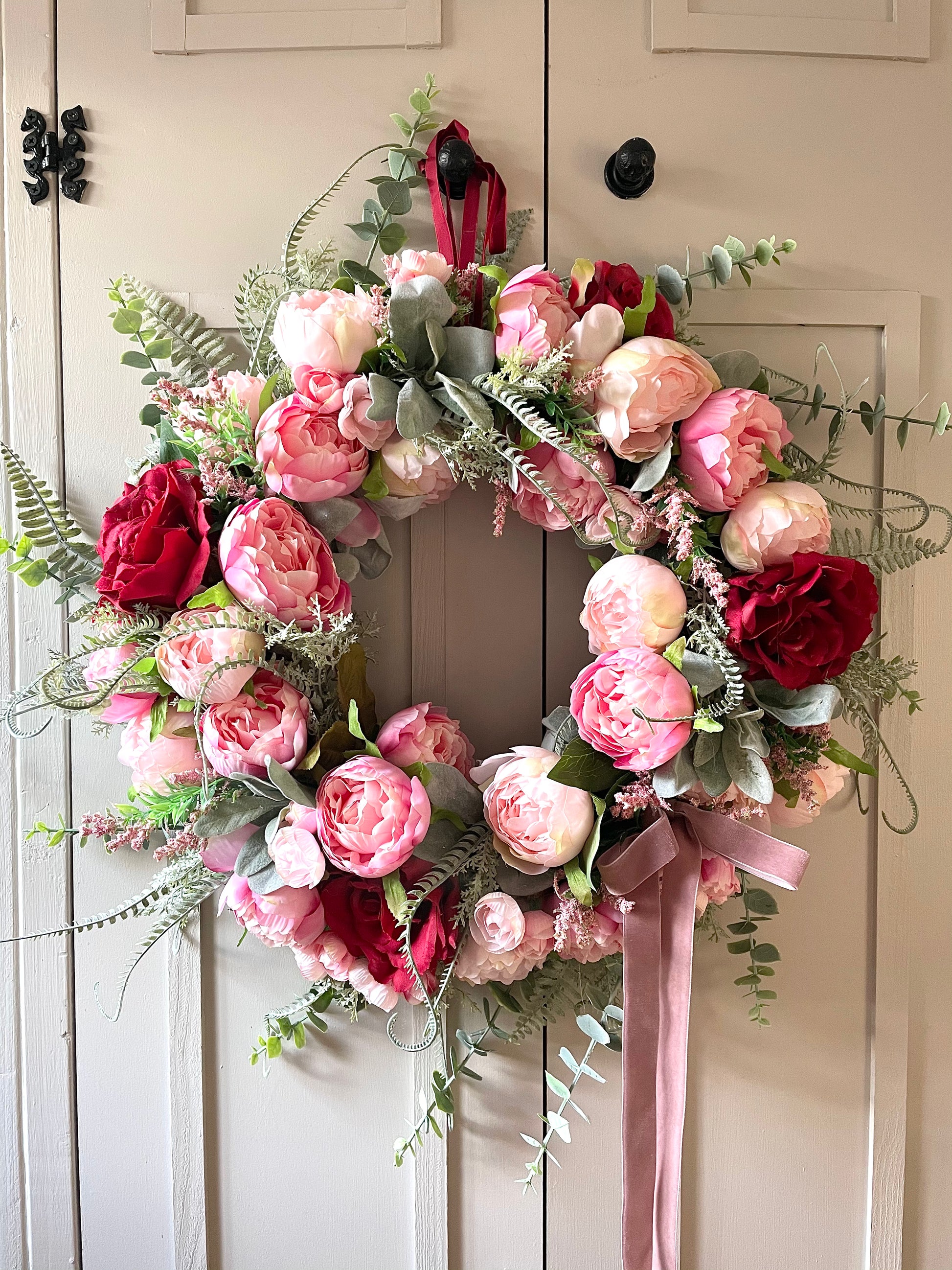 A beautiful and vibrant faux wreath named “HOPE” made using high quality silk flowers with velvet ribbon bow