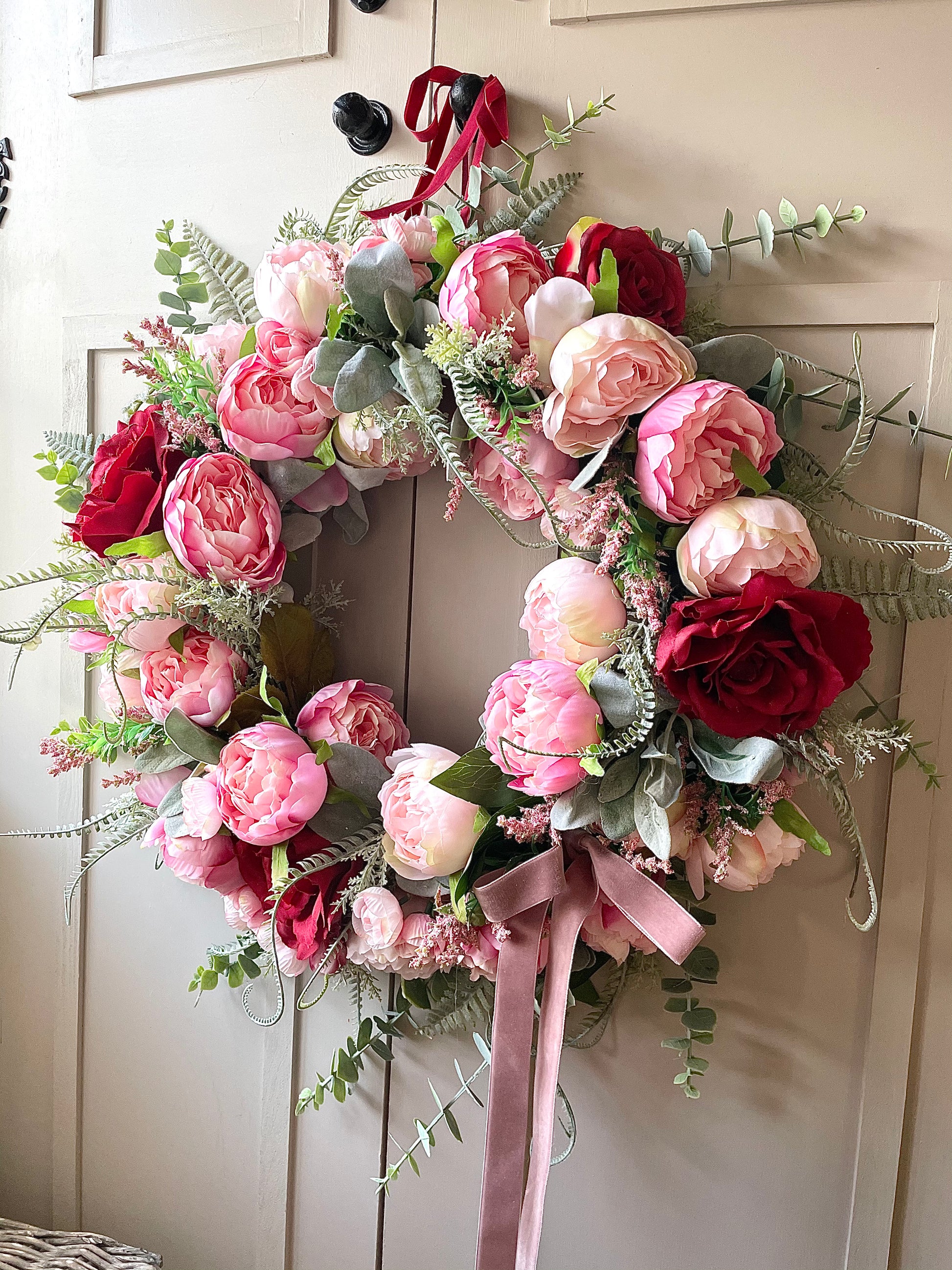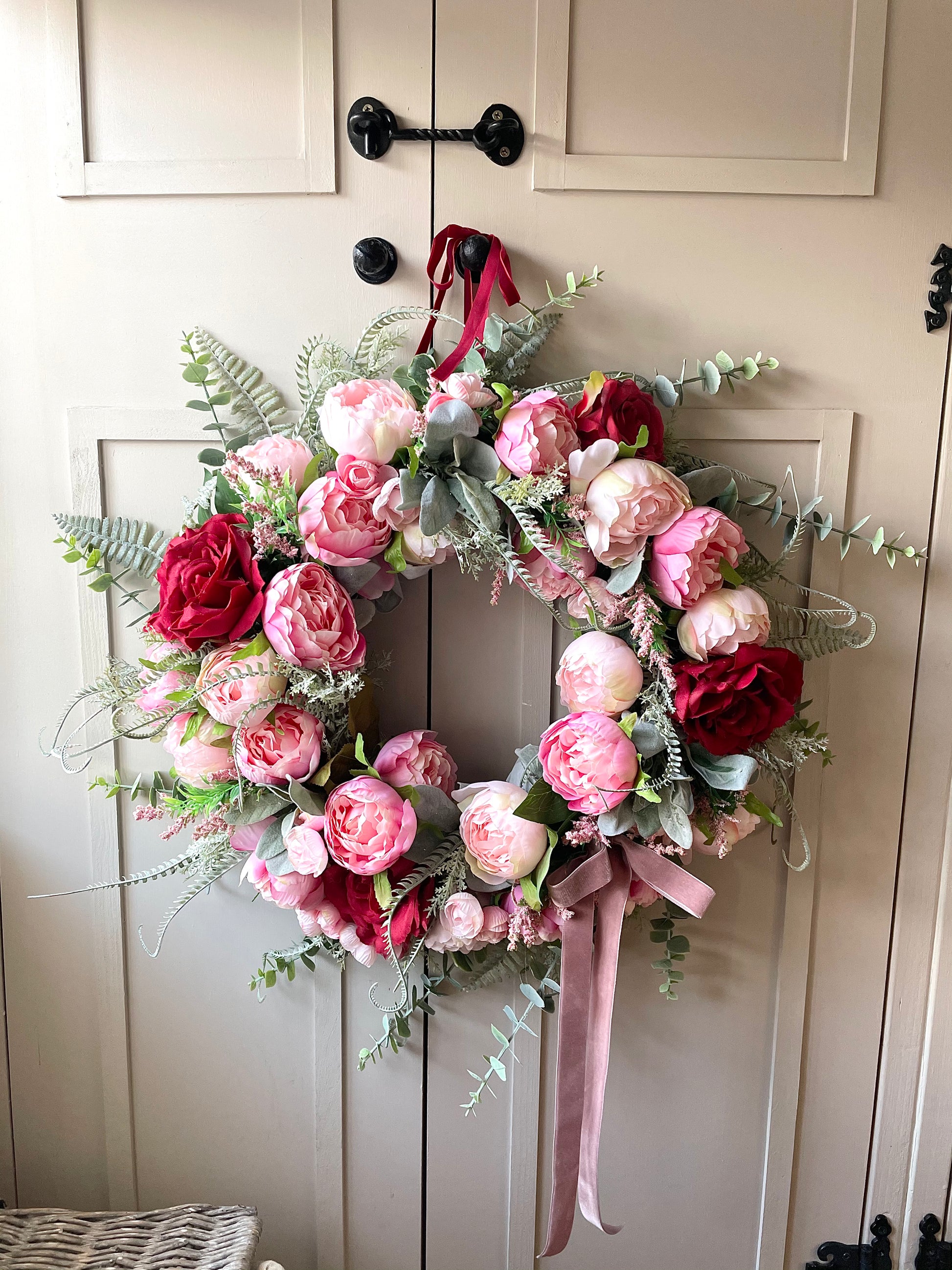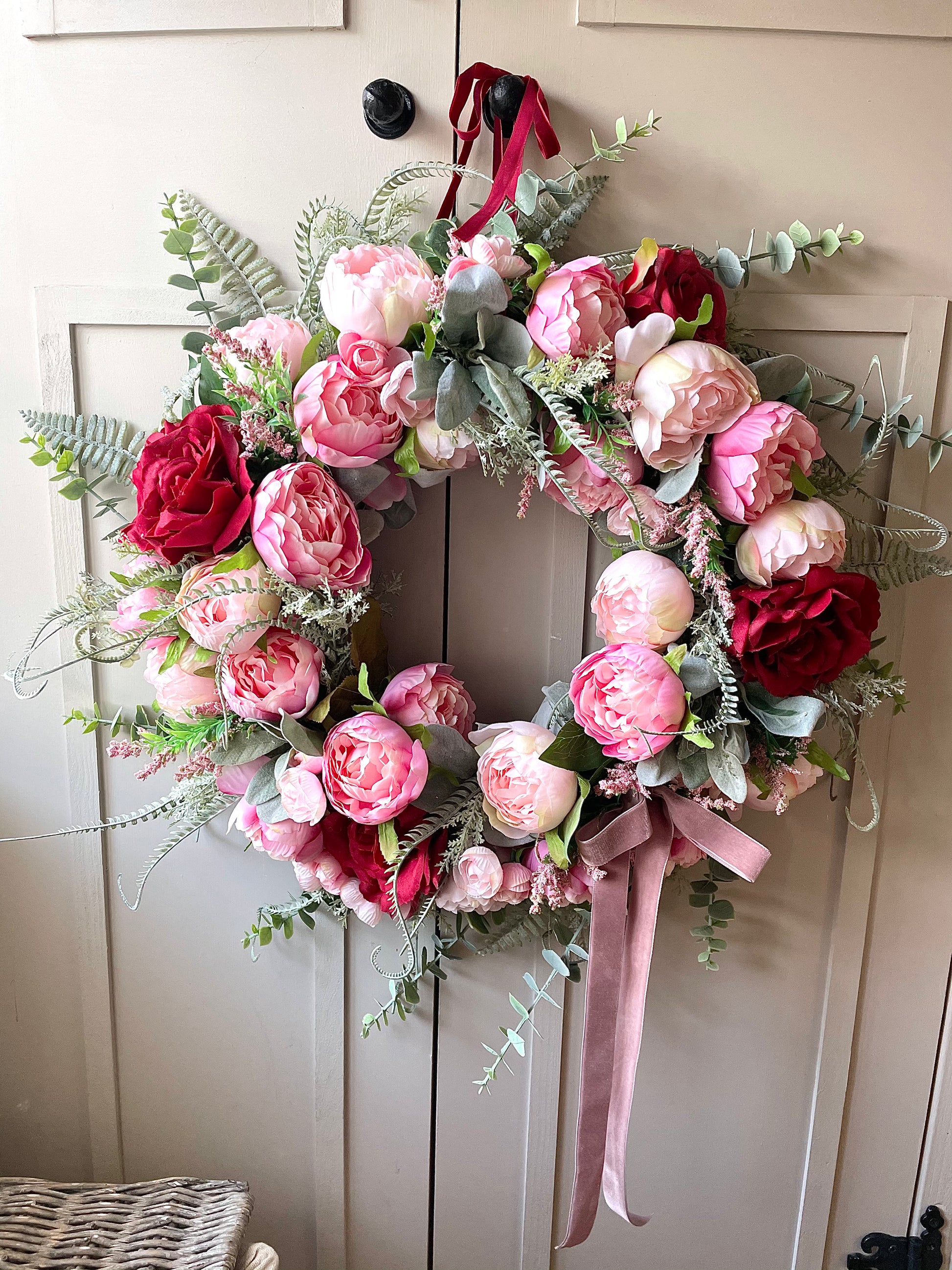 A beautiful and vibrant faux wreath named “HOPE” made using high quality silk flowers with velvet ribbon bow