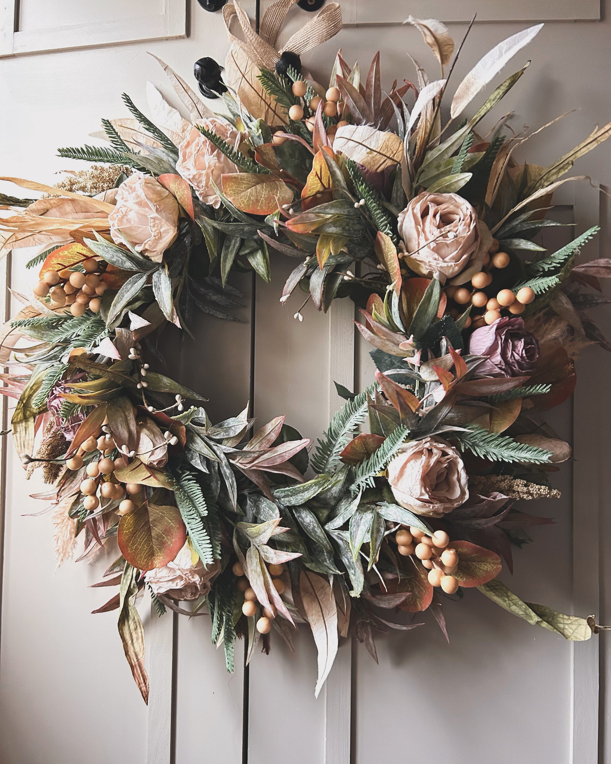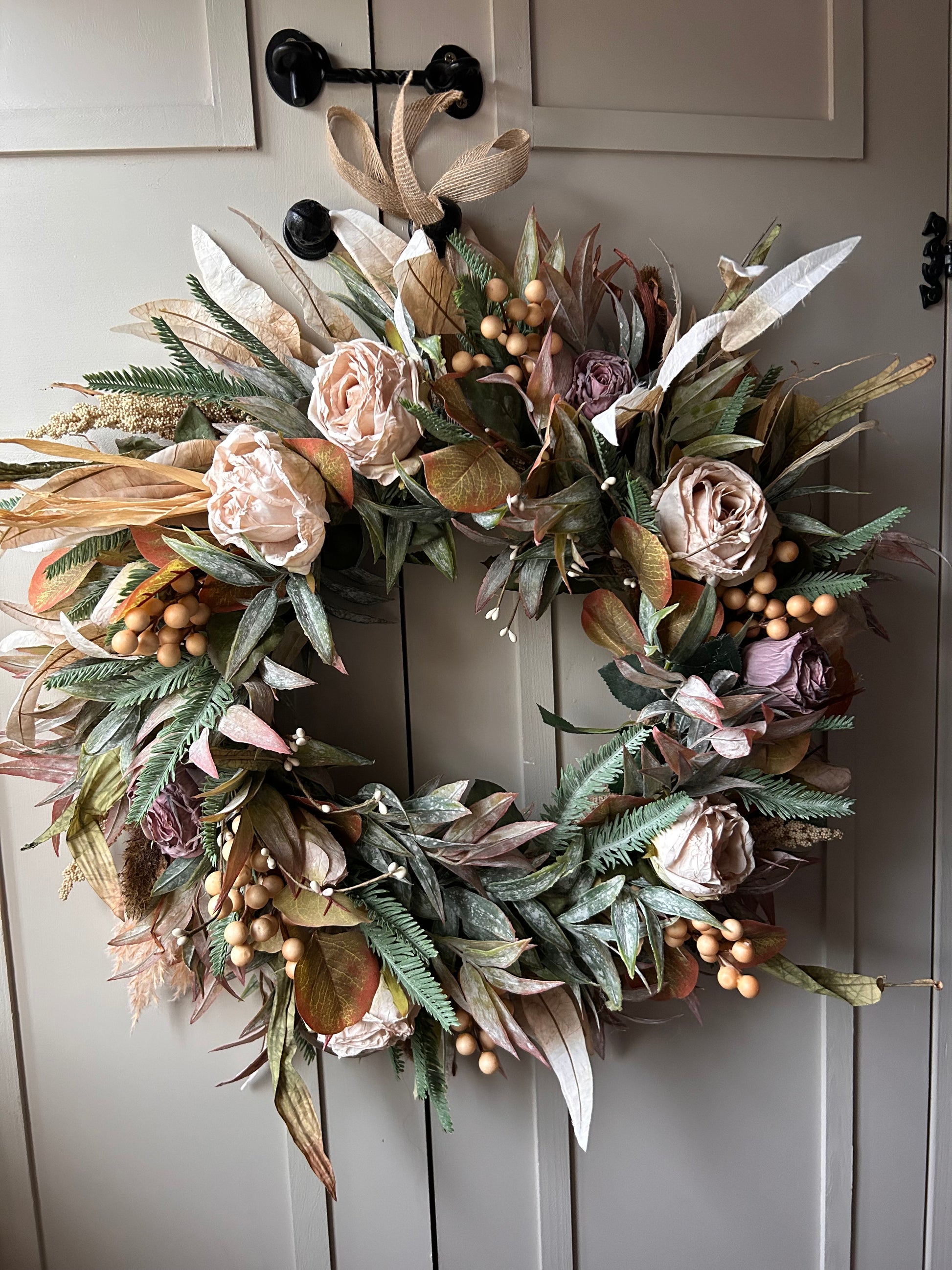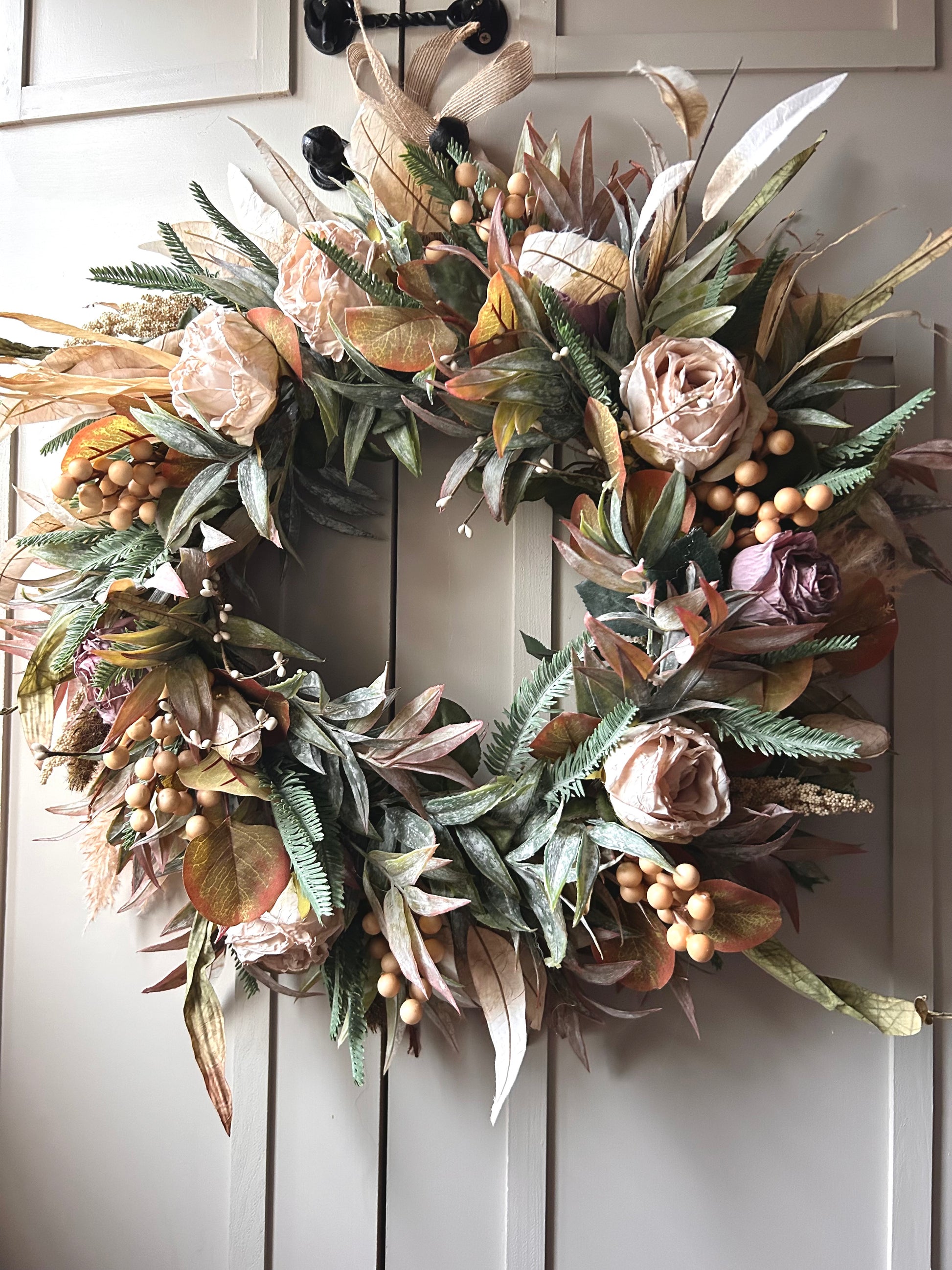 Add a touch of rustic charm to your door or wall with “JILLY” a lifelike faux flower wreath. Crafted with intricate details, this handmade wreath captures a natural look and feel without any of the maintenance of a real wreath. A perfect addition to any country-style decor.