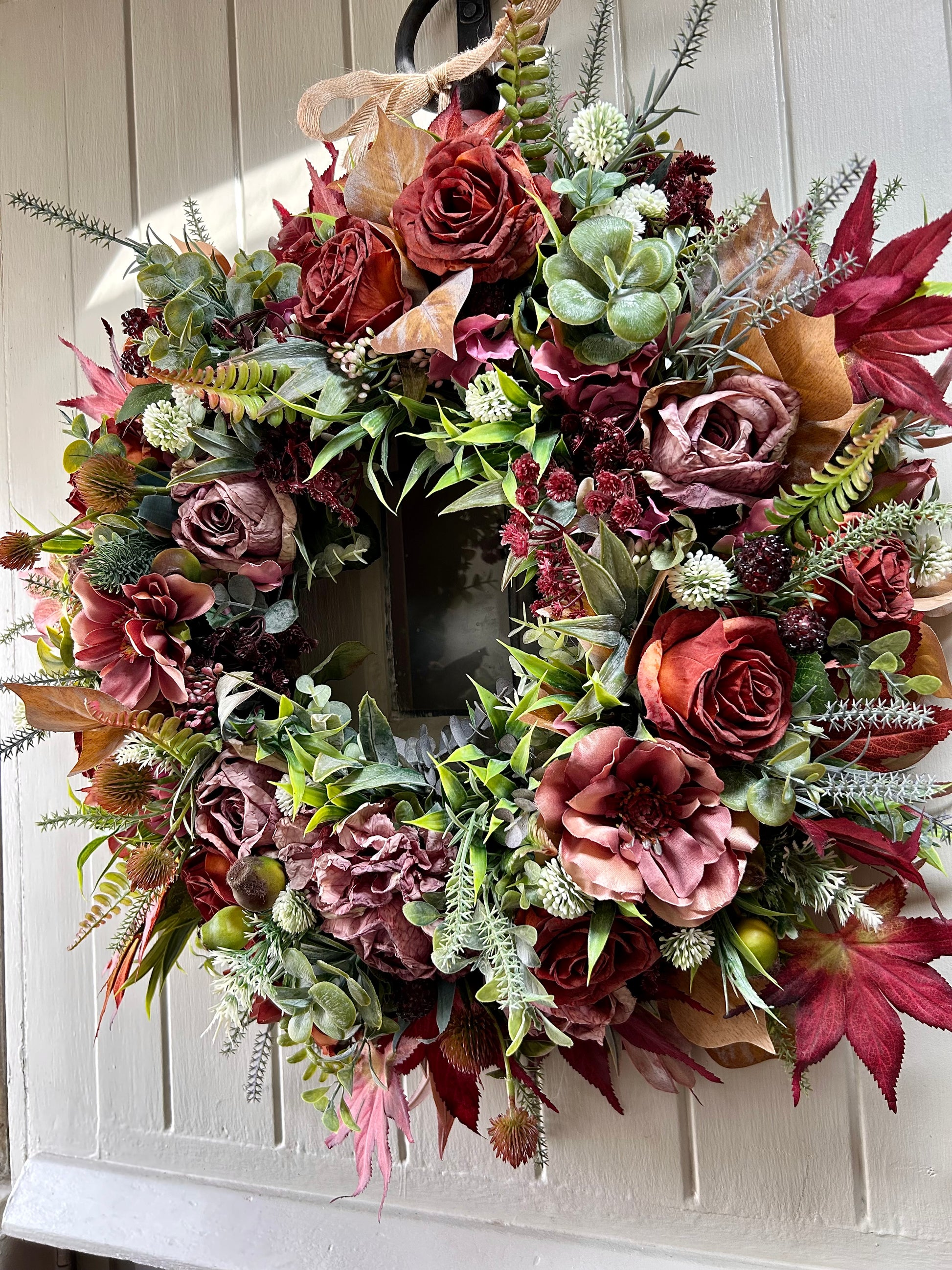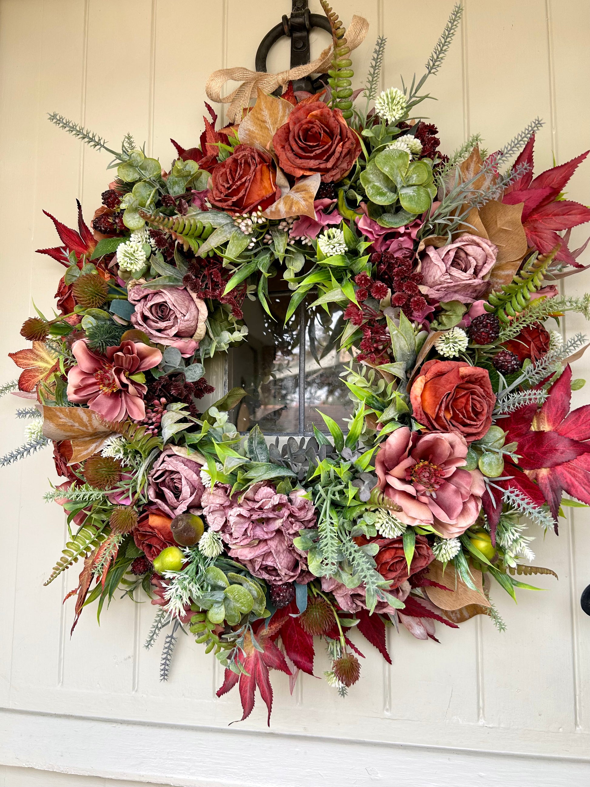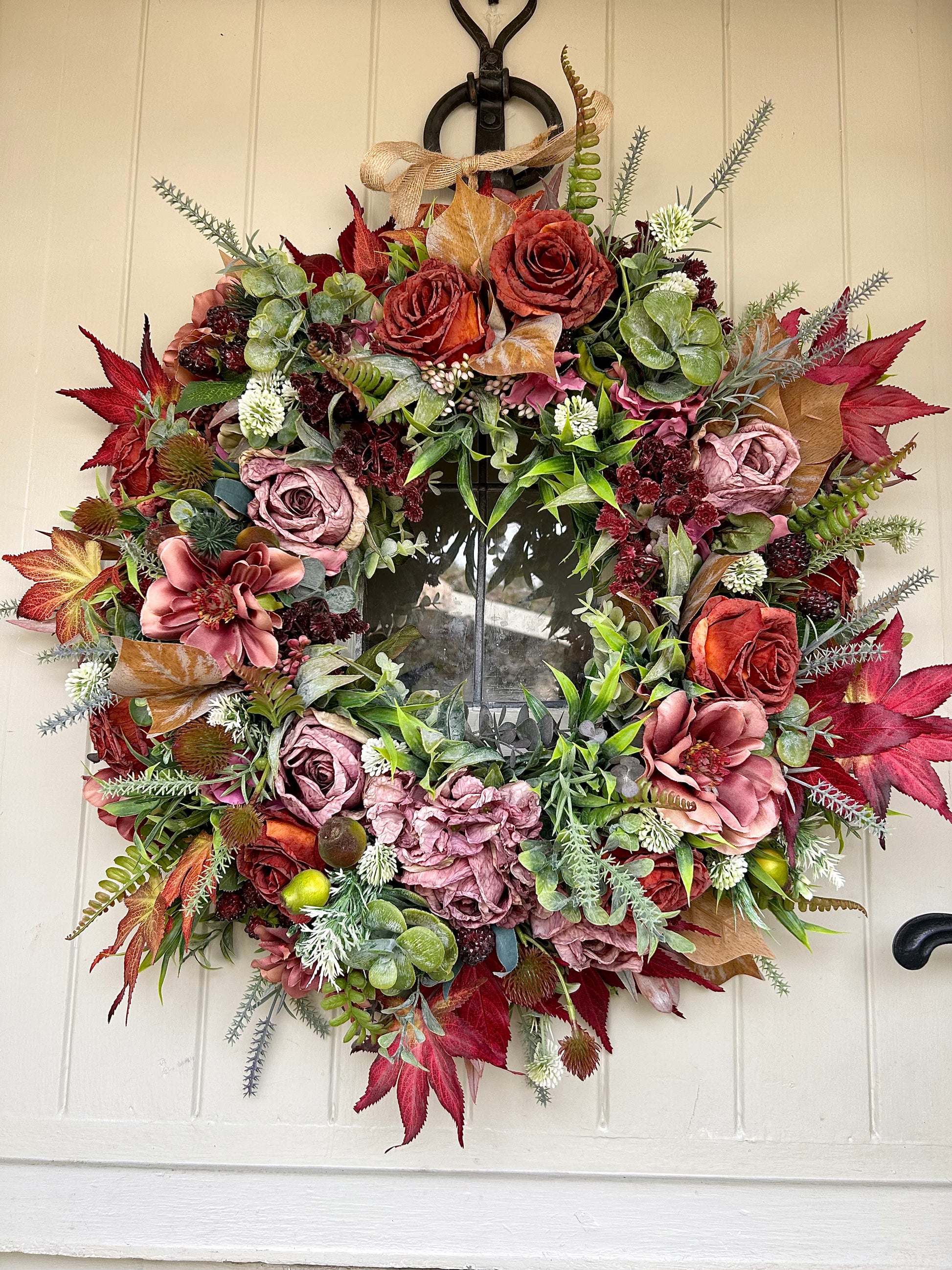 Introducing “LIZZIE” a sophisticated AUTUMN bloom artificial wreath. Crafted with roses plus dry touch roses and weather-protected, ensuring a beautiful display that will last for years. Plus, free shipping with purchase. Add a touch of elegance and beauty to your home.
