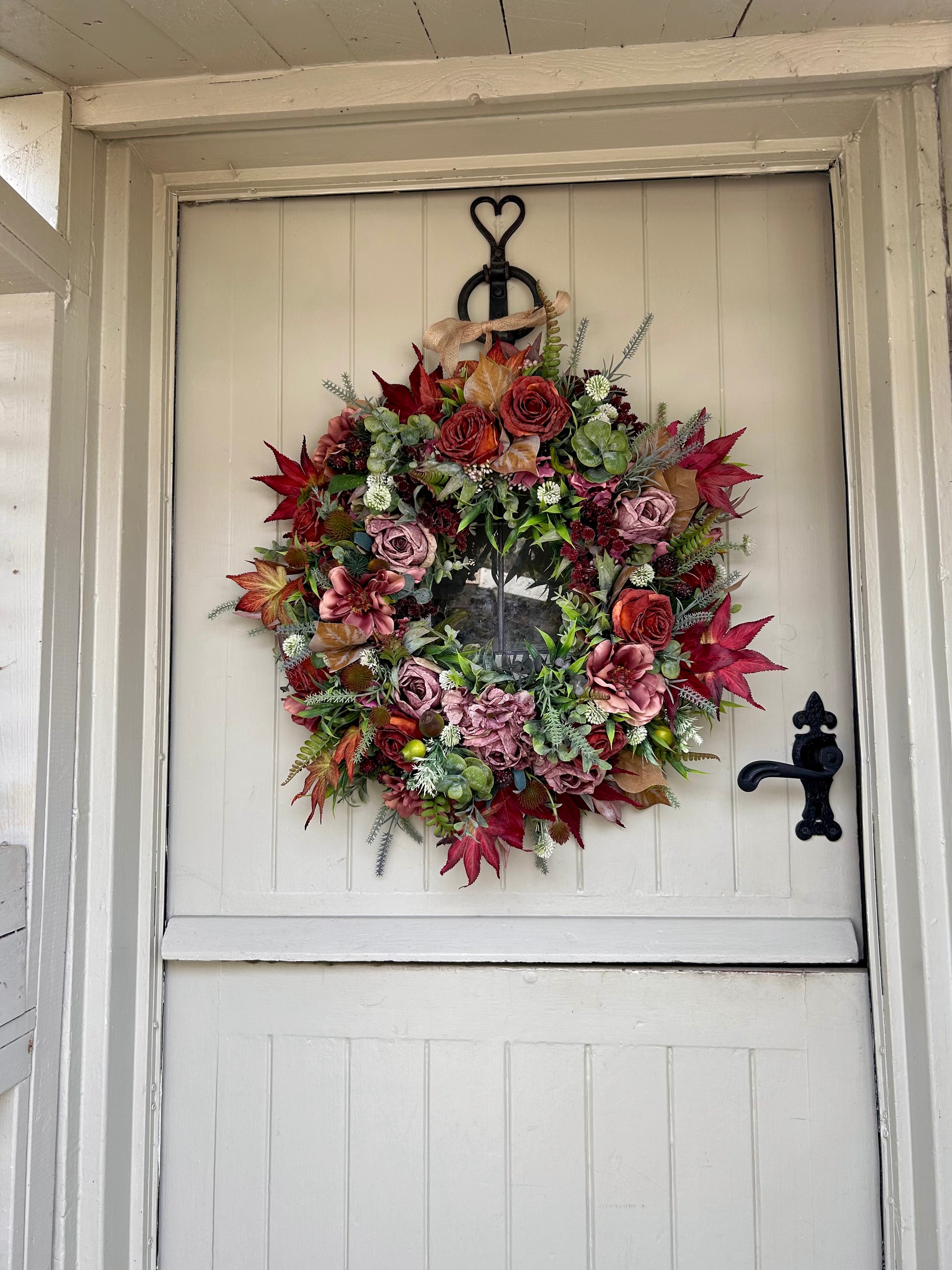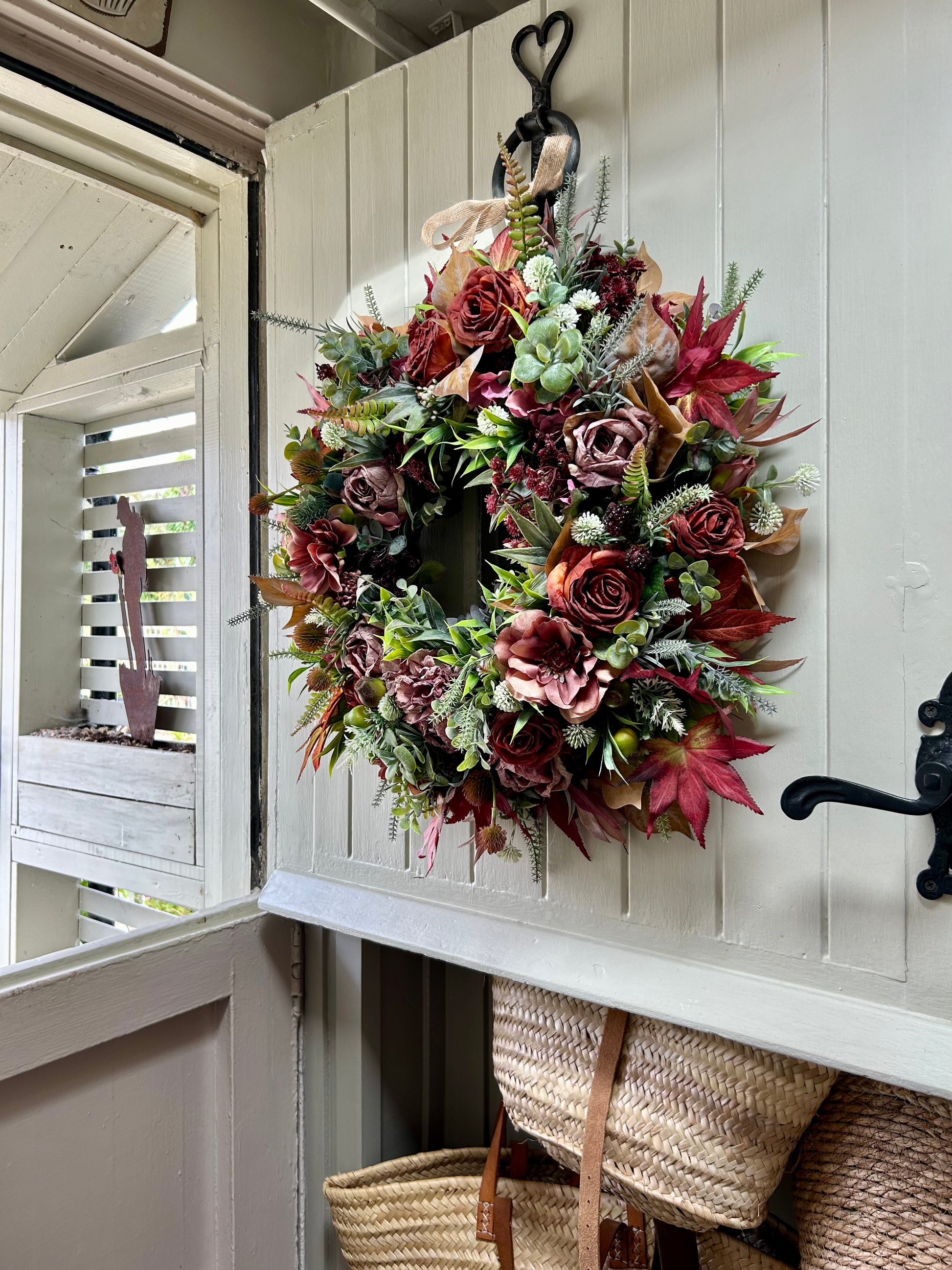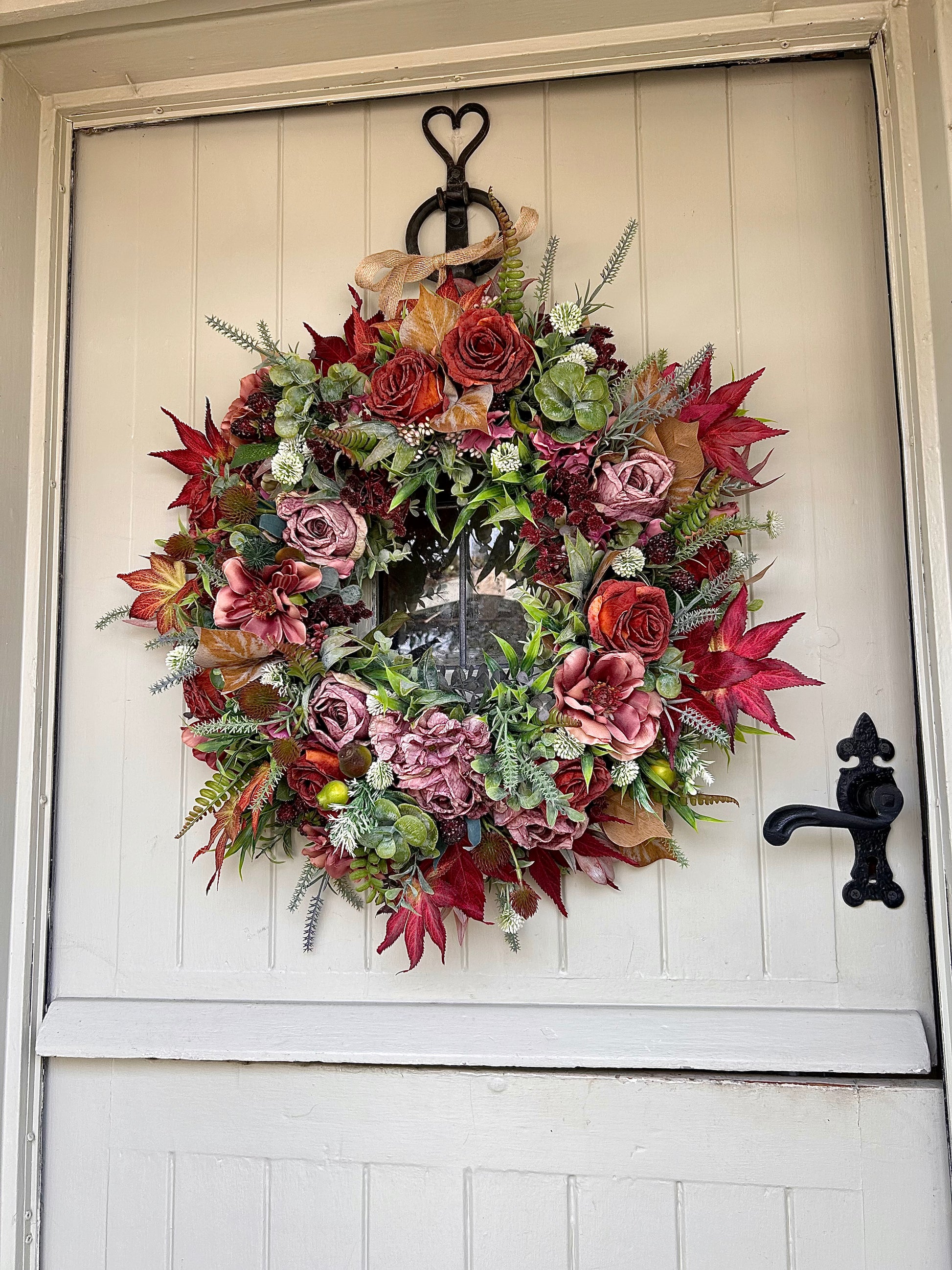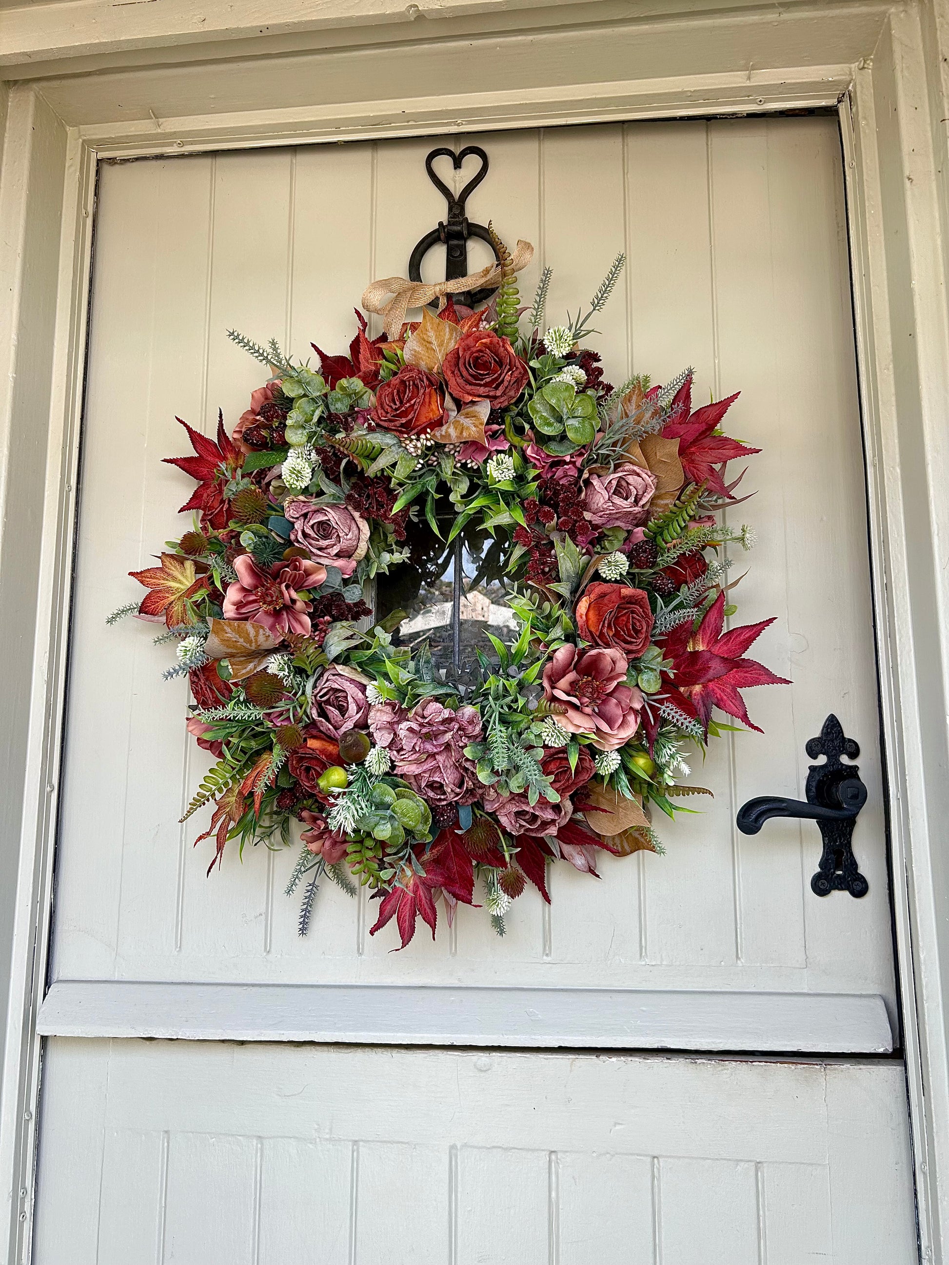 Introducing “LIZZIE” a sophisticated AUTUMN bloom artificial wreath. Crafted with roses plus dry touch roses and weather-protected, ensuring a beautiful display that will last for years. Plus, free shipping with purchase. Add a touch of elegance and beauty to your home.