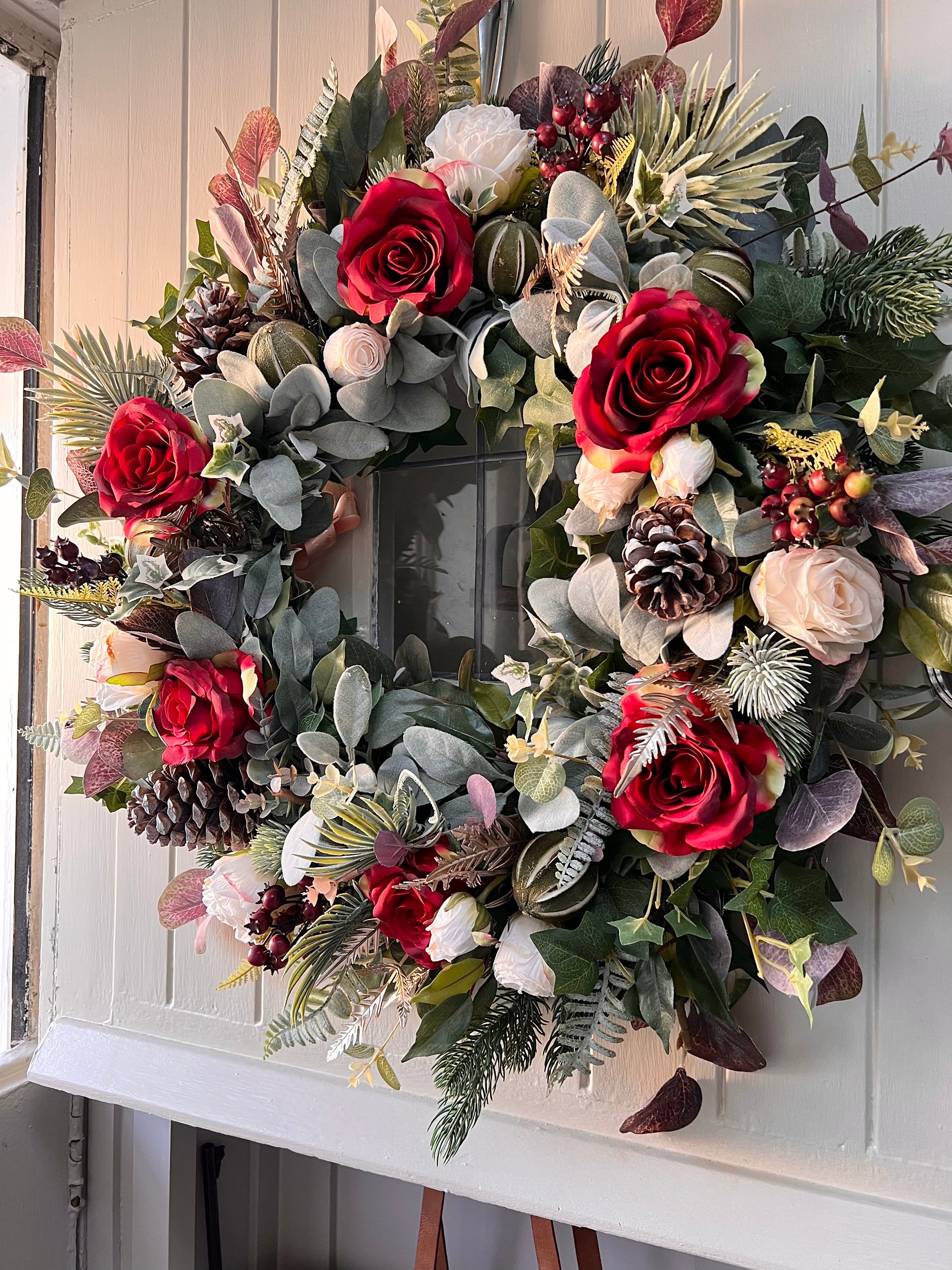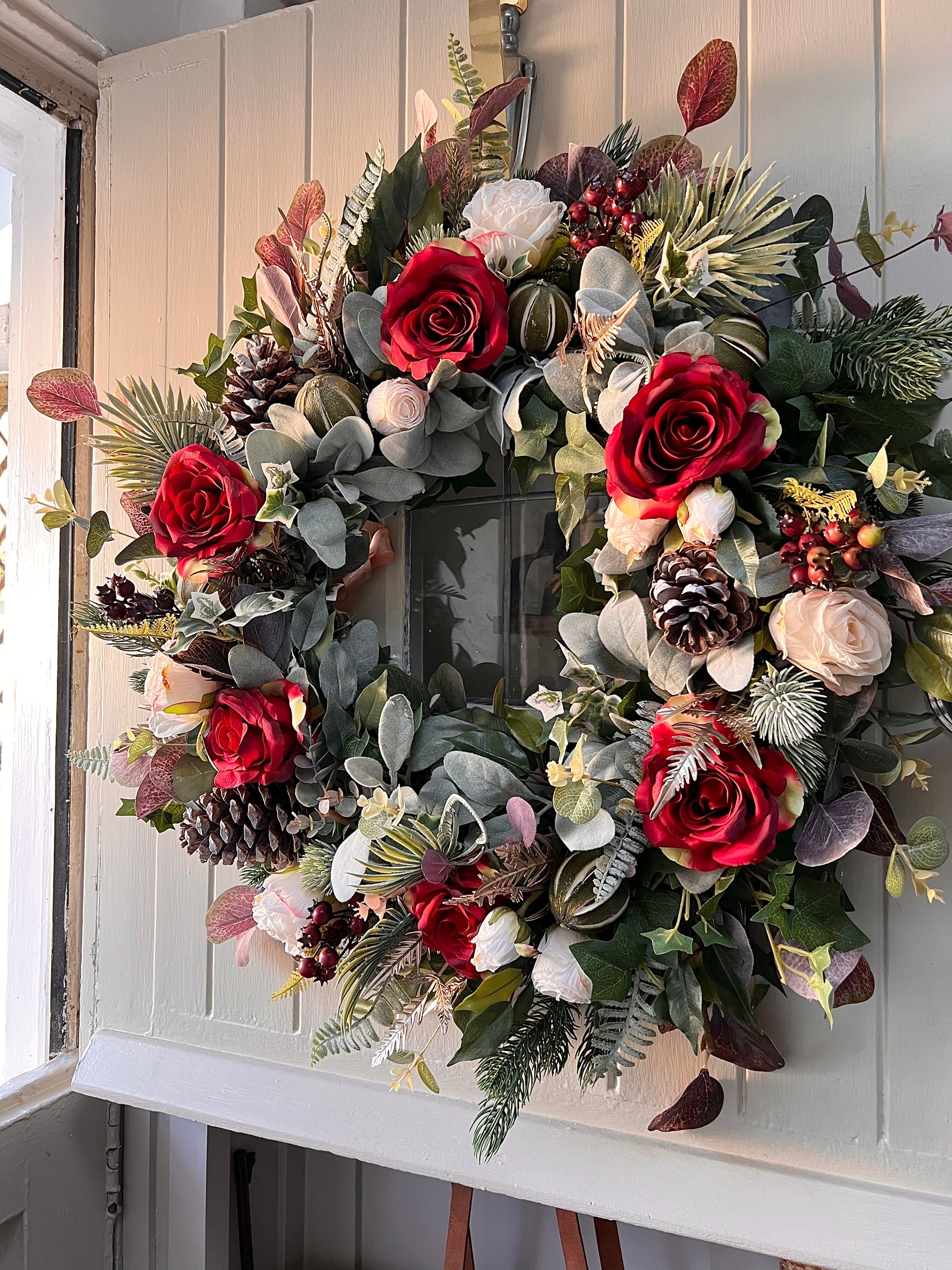 Welcome the holiday season with this festive “Rosie” faux Christmas wreath. Featuring a luxury red rose design, it is perfect for bringing a warm winter cheer to your home. Enjoy free UK shipping when you order this wreath today.