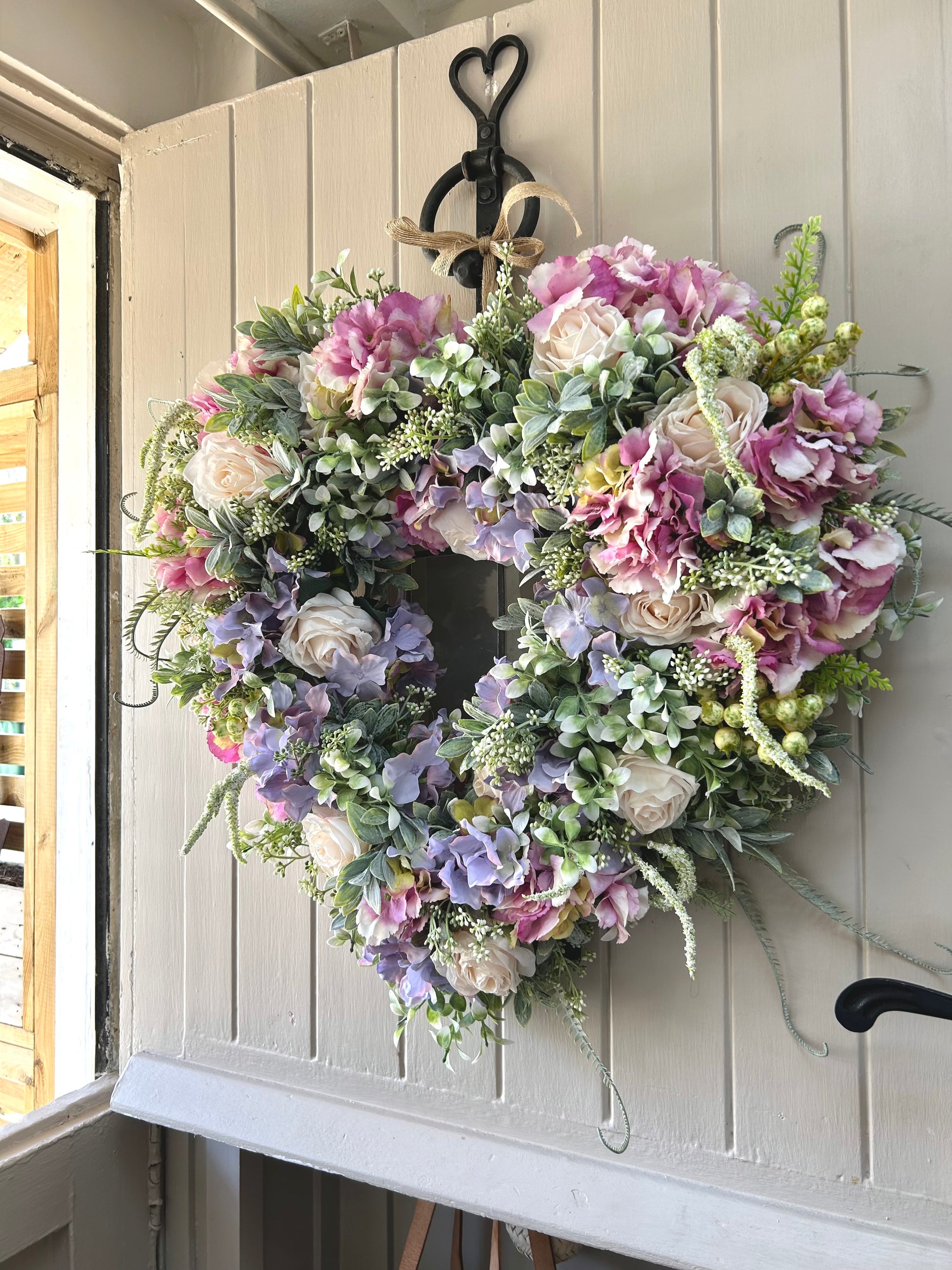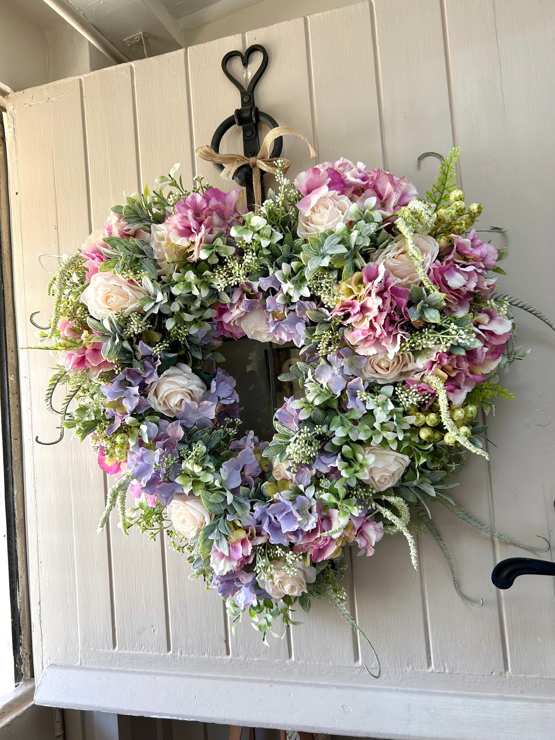 Introducing "SLOANE" a sophisticated full bloom artificial wreath. Crafted with hydrangea flowers dry touch roses and rananculus this wreath is chunky, lush, and weather-protected, ensuring a beautiful display that will last for years. Plus, free shipping with purchase. Add a touch of elegance and beauty to your home.