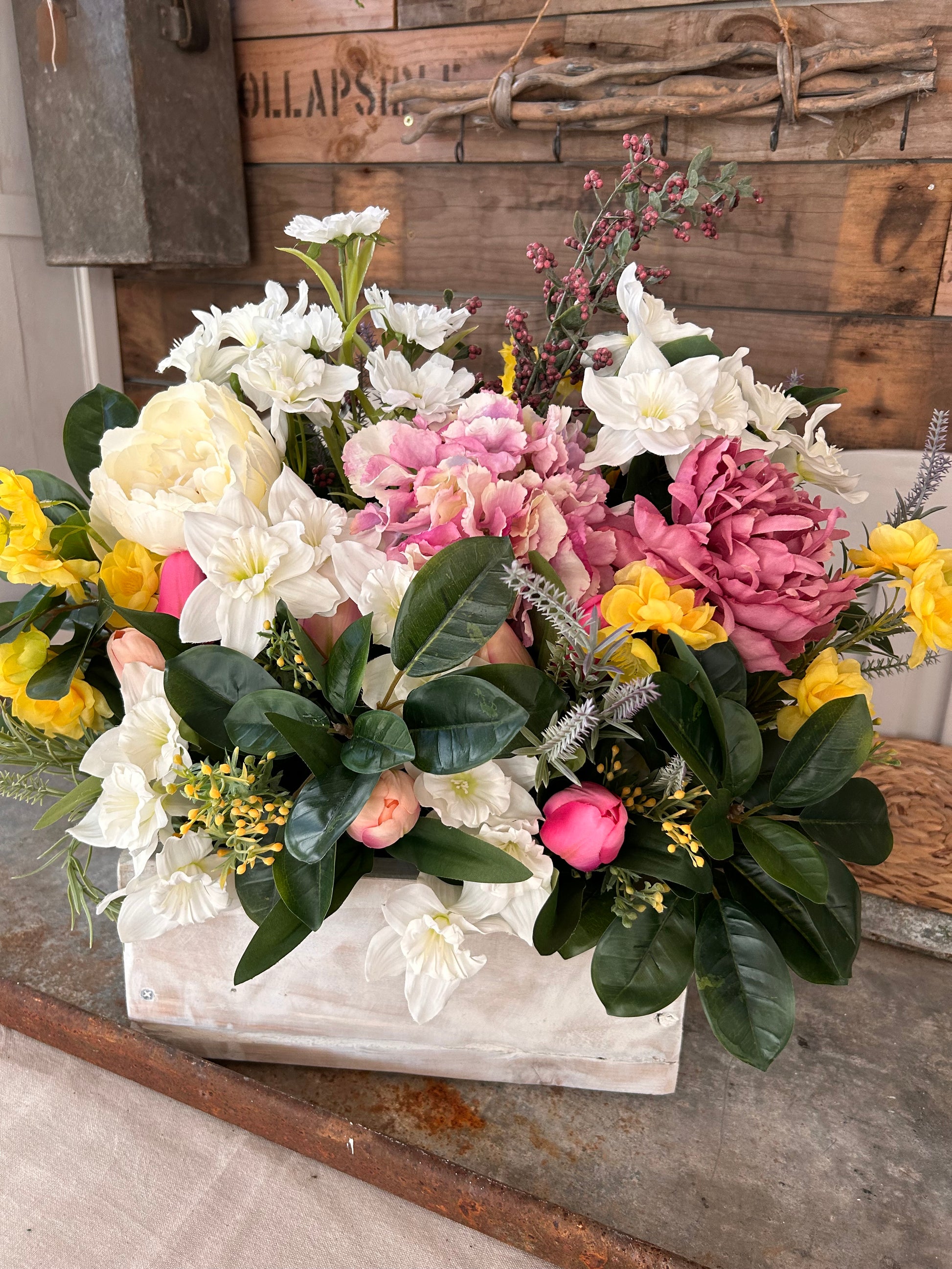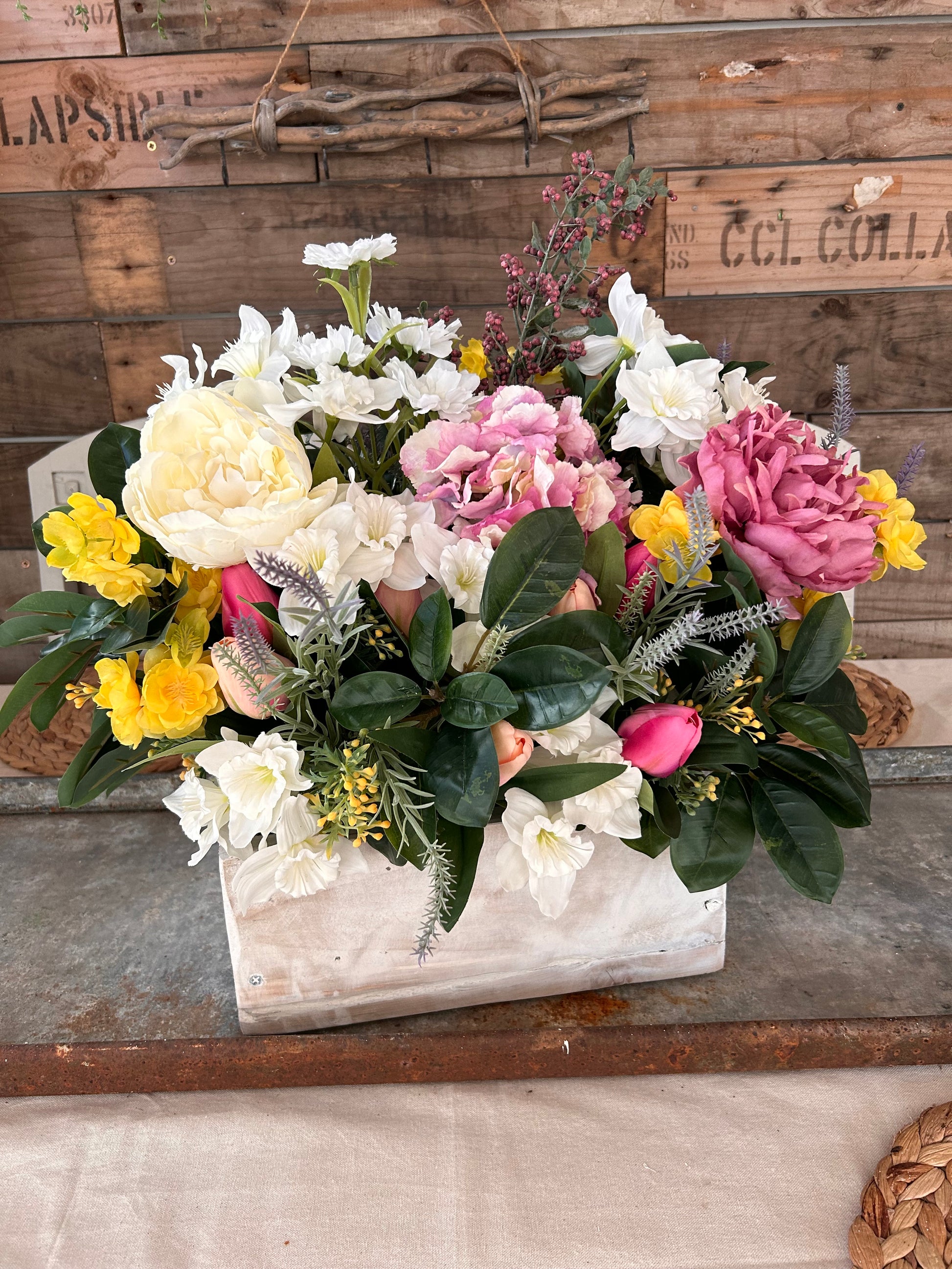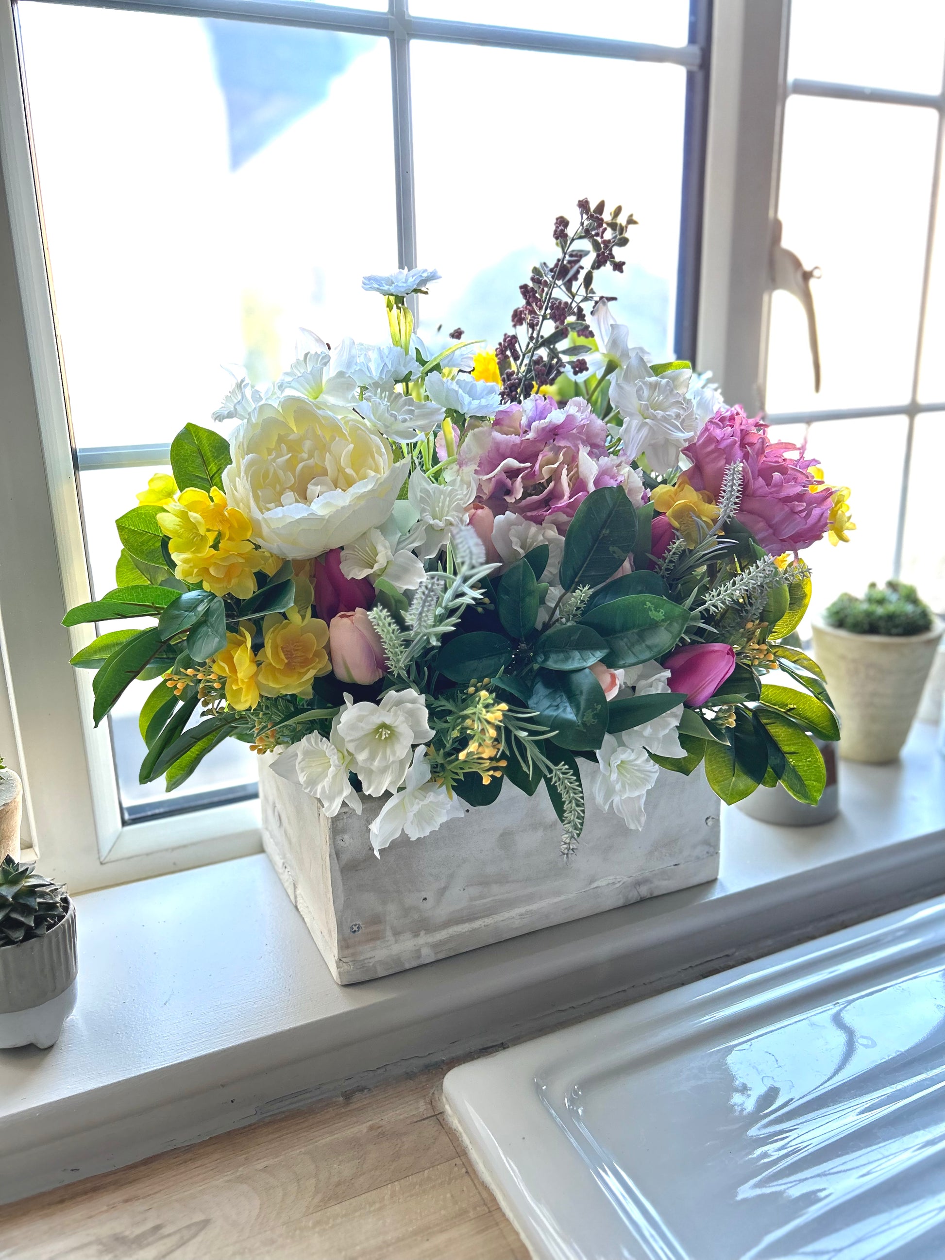 This Window sill (TROUGH FLOWER BOX) is crafted with sturdy wooden construction, made using reclaimed wood with a rustic finish to add an eye-catching display to your home. Our overlays of silk flowers will add vibrant colour and a lively atmosphere to any room.