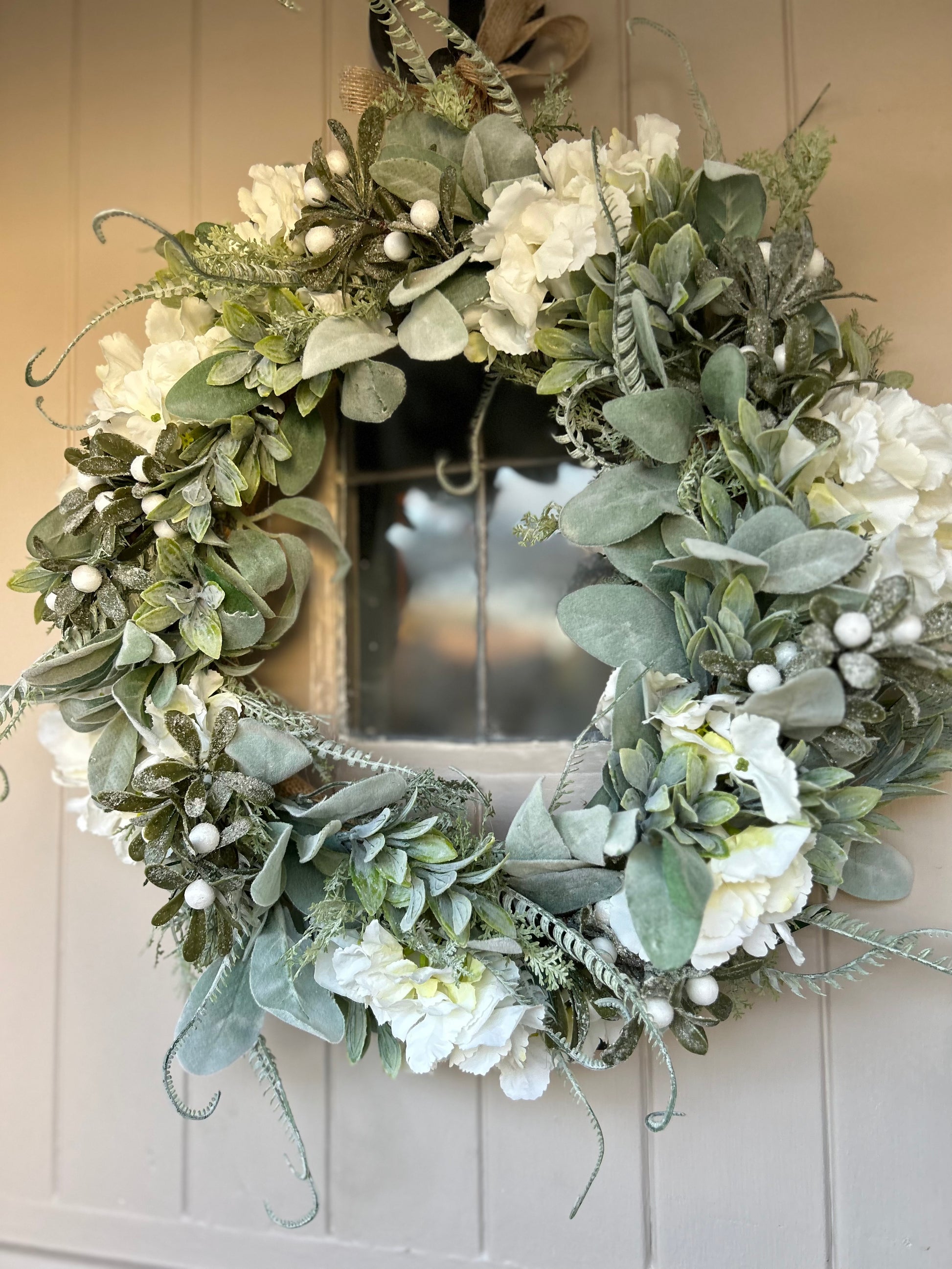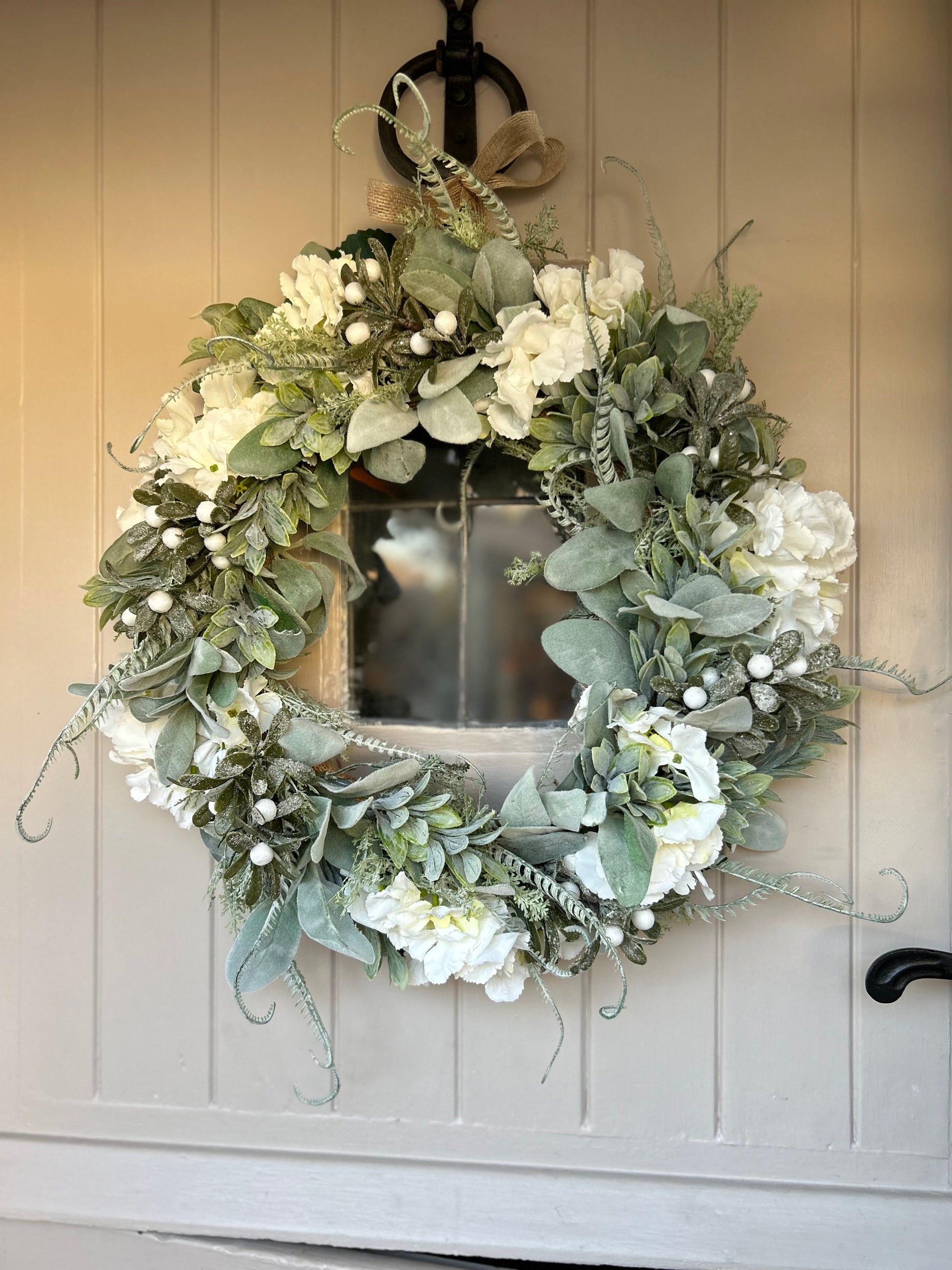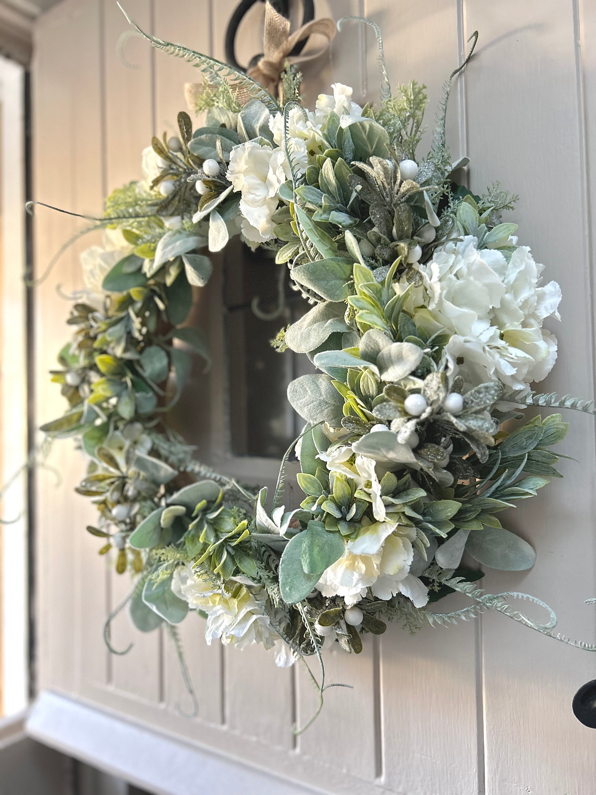This gorgeous luxury faux wreath is made with faux lambs ears, hydrangeas and winter berries, a perfect wreath to see you through the winter months but equally as pretty around the home all year