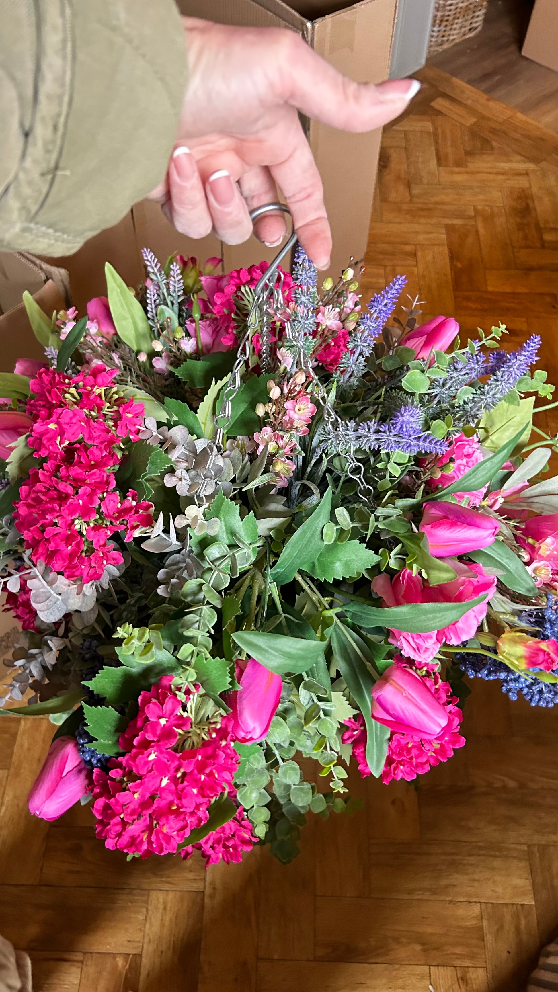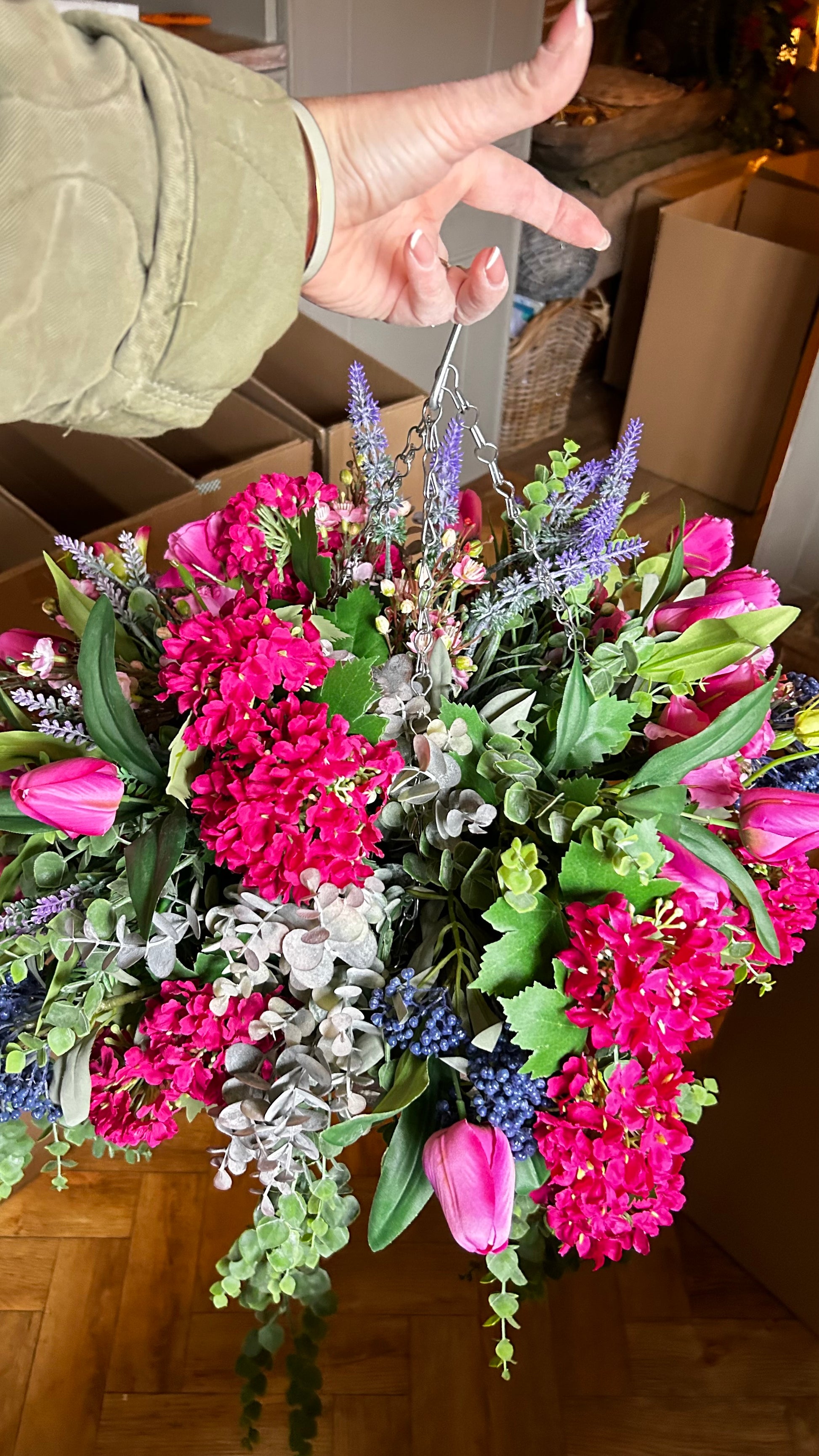 Our Luxury Artificial Hanging Basket is perfect for adding a touch of natural beauty to your indoor or outdoor space. Made with premium materials for a realistic look, this basket features an abundance of realistic flowers and greenery – no maintenance required! Shipping is free and included in the price.