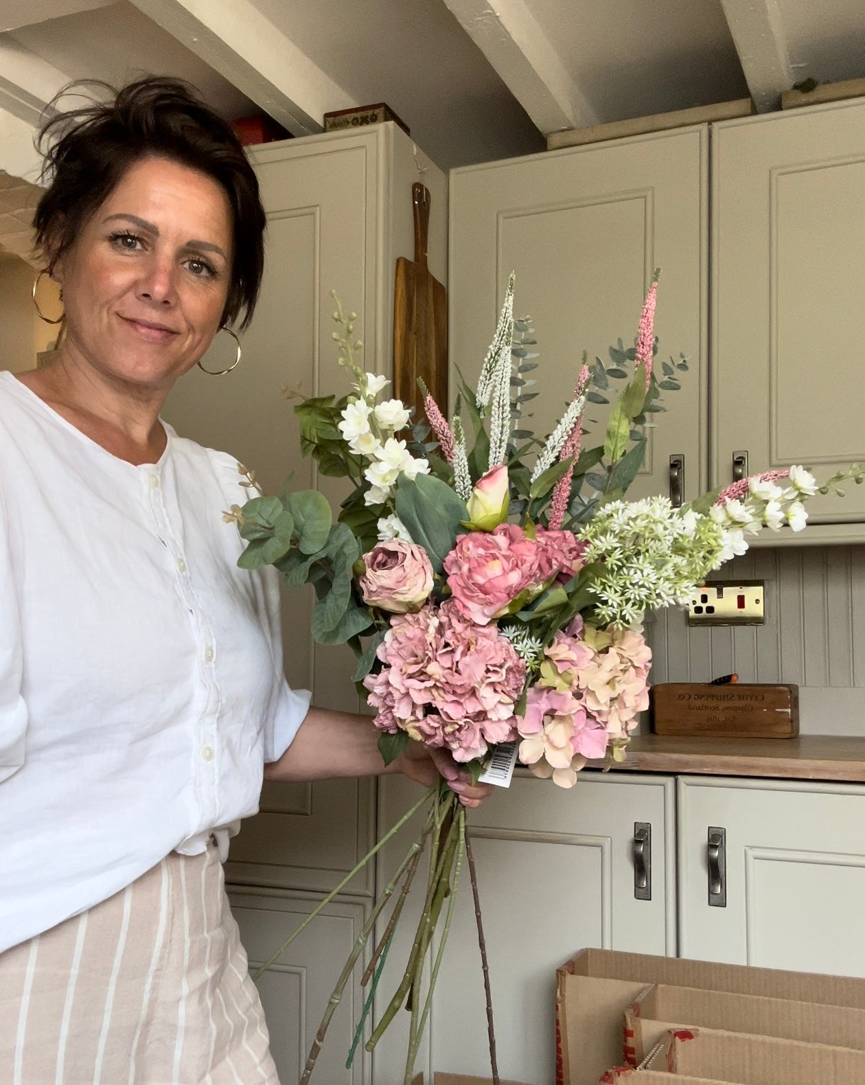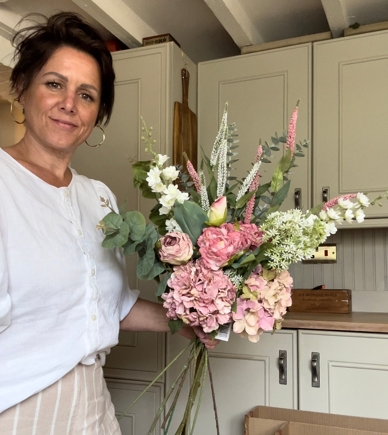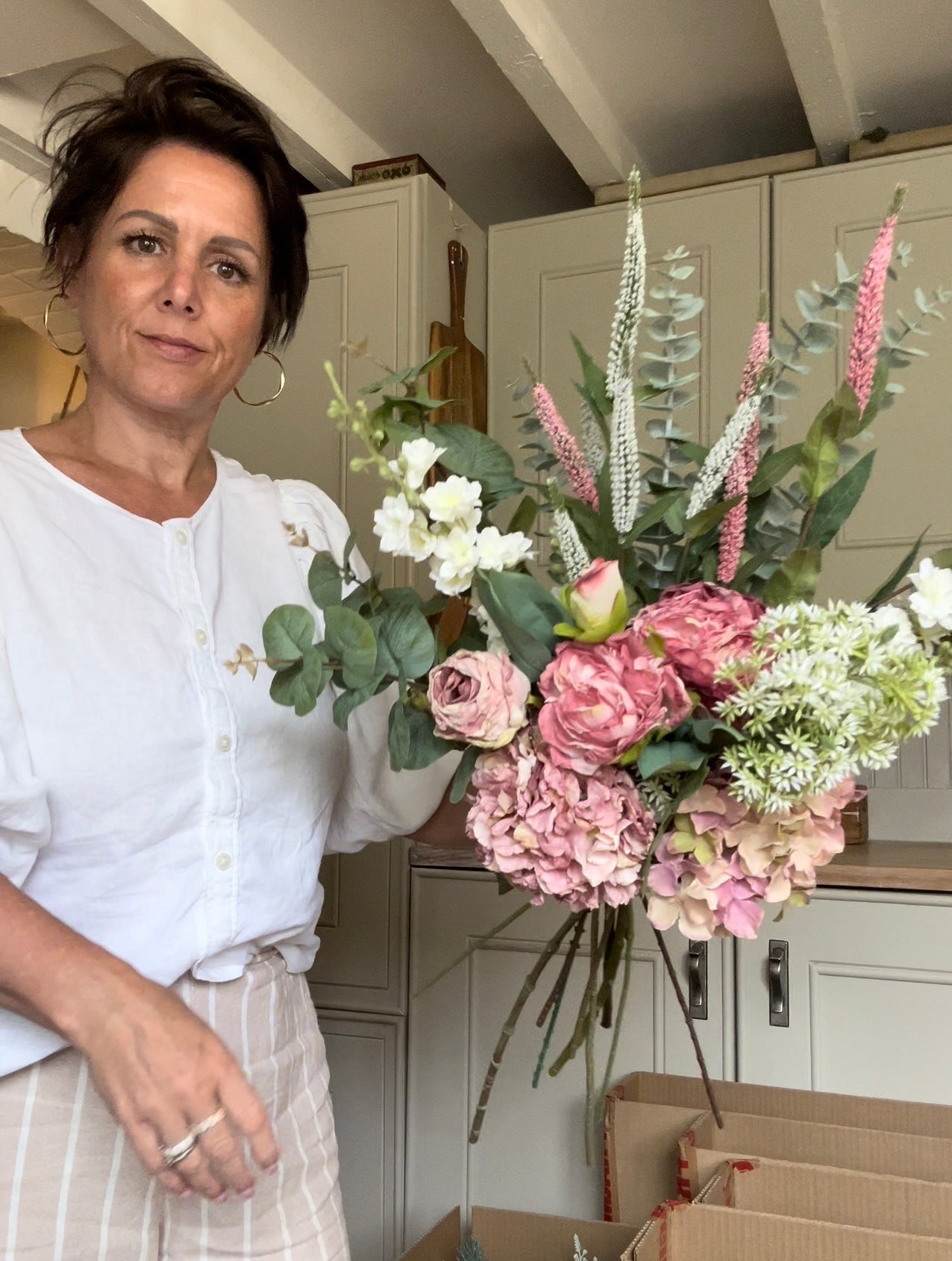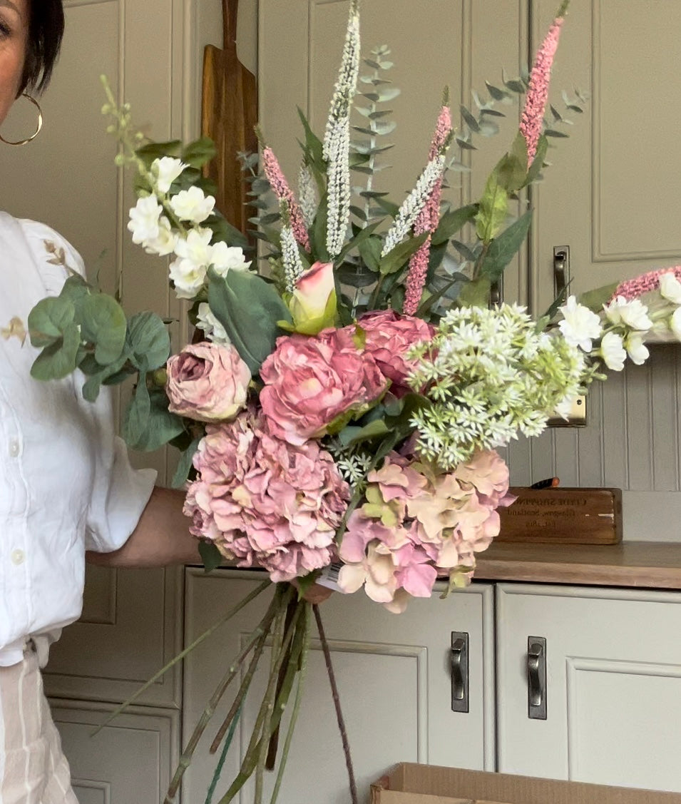 Large bouquet of artificial flowers made up with luxury florals to create this chic display, filled with dry touch luxury peonies, orchid stems, dry touch hydrangea and eucalyptus stems