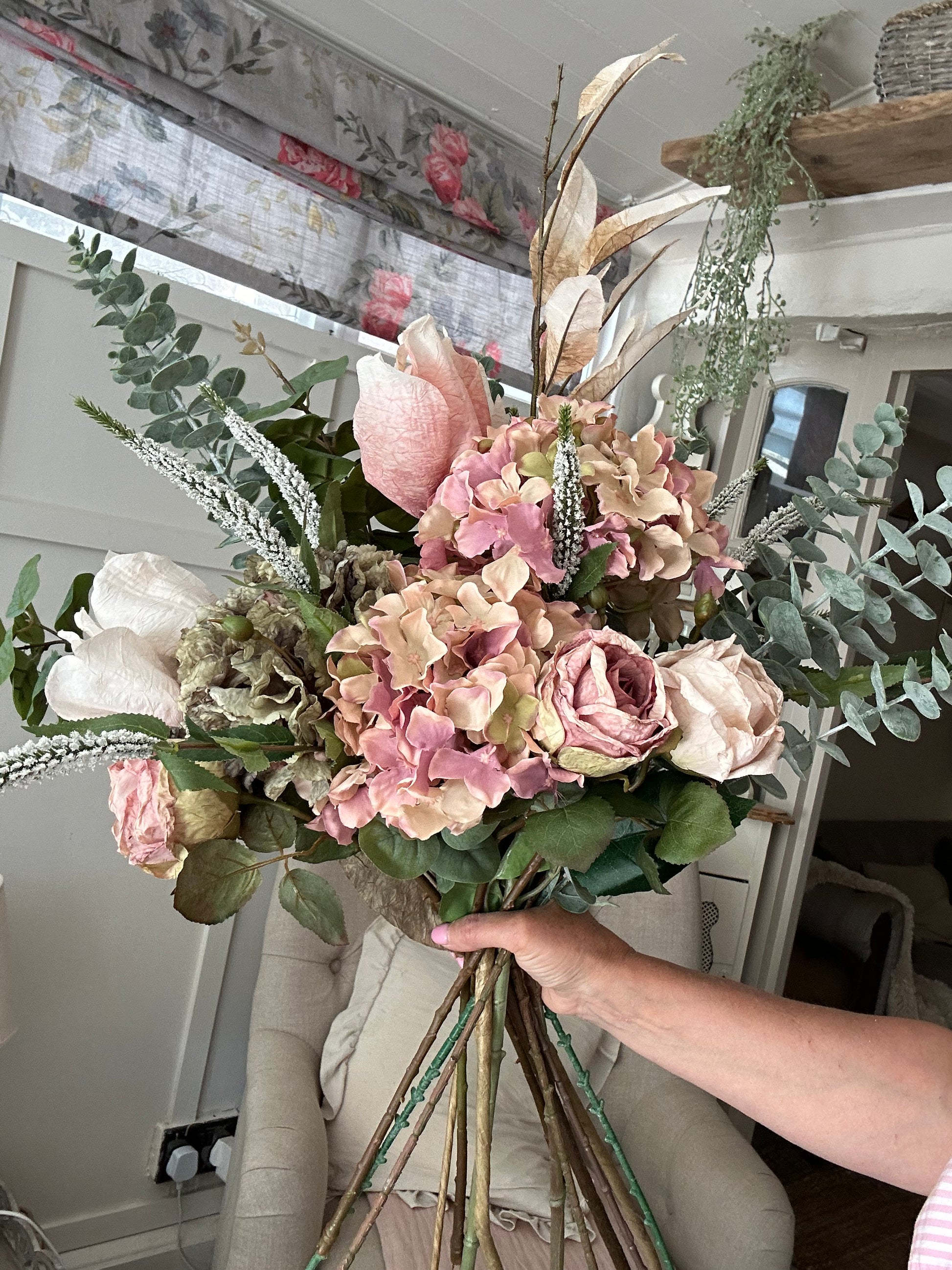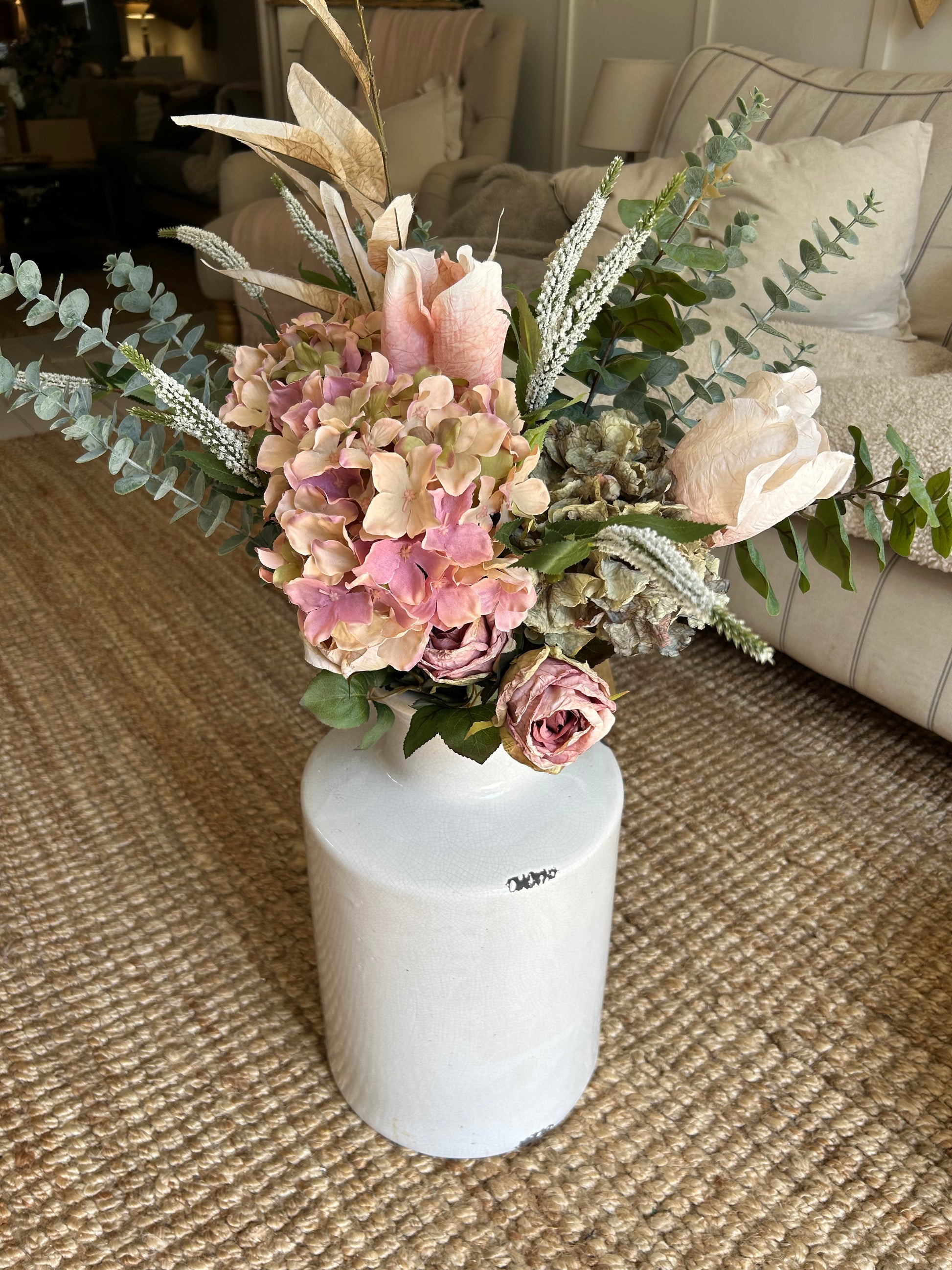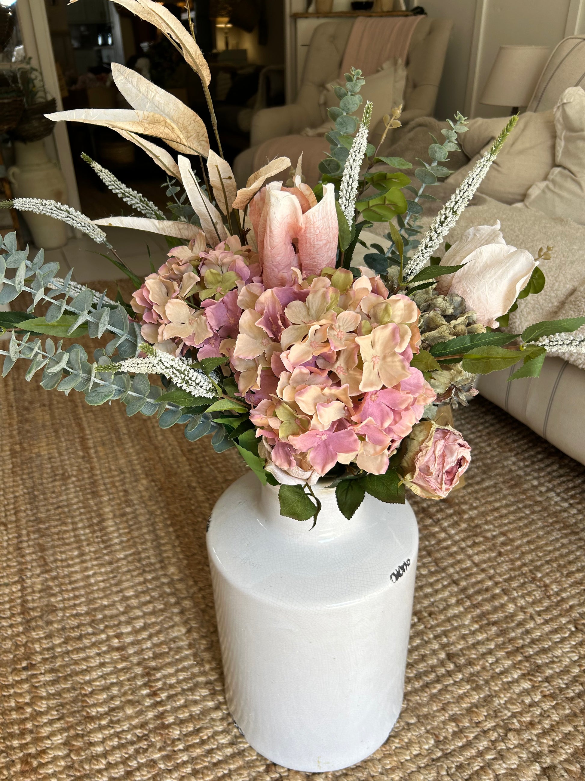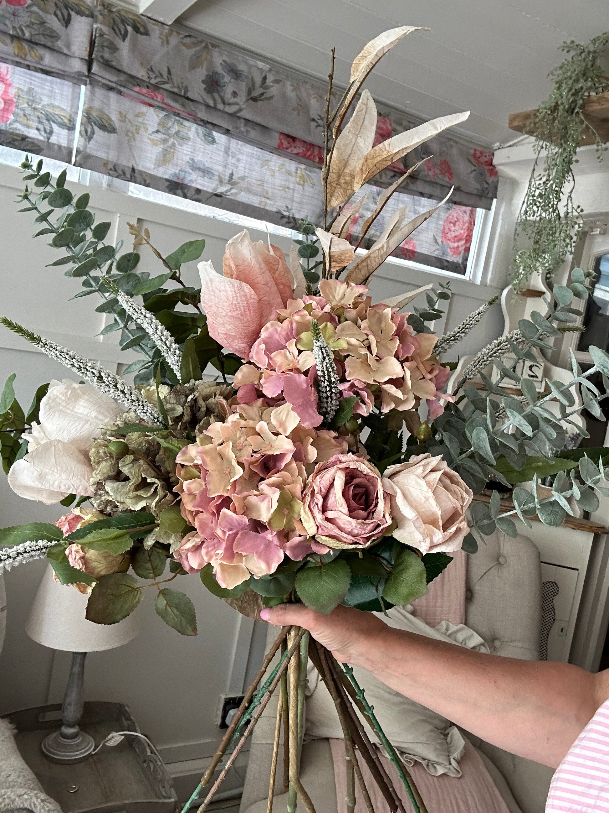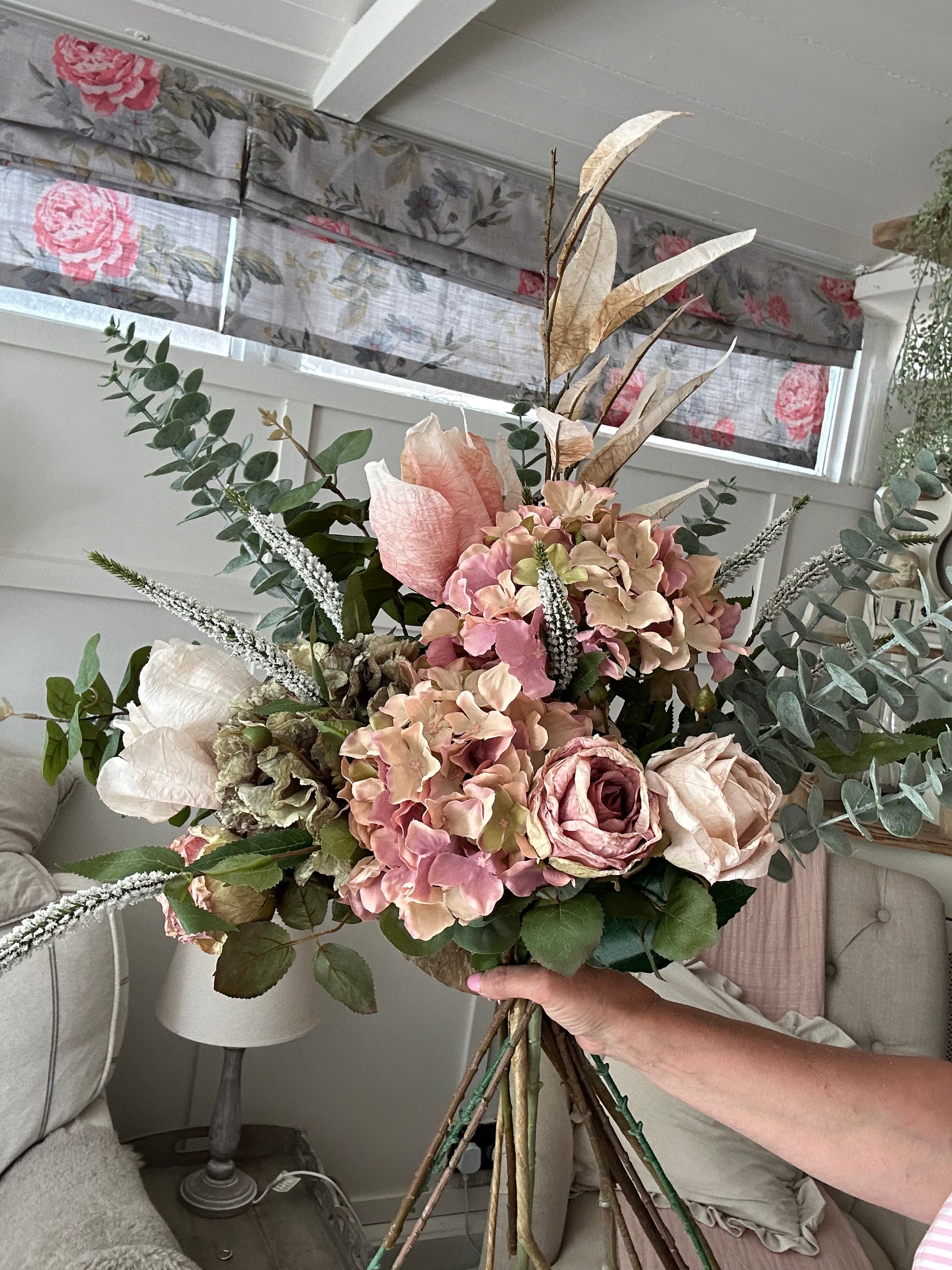 Large bouquet of artificial flowers made up with luxury florals to create this chic display, filled with dry touch luxury peonies, orchid stems, dry touch hydrangea and eucalyptus stems