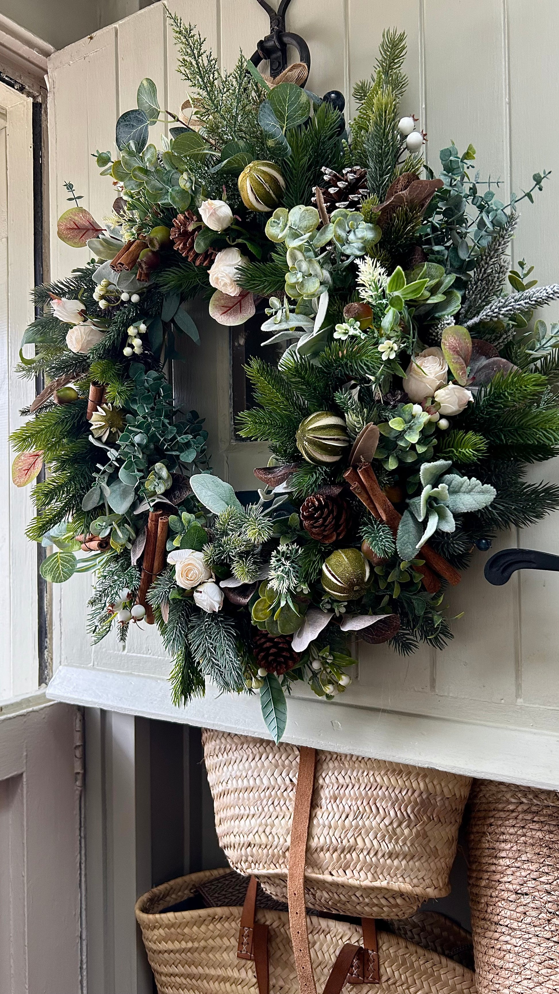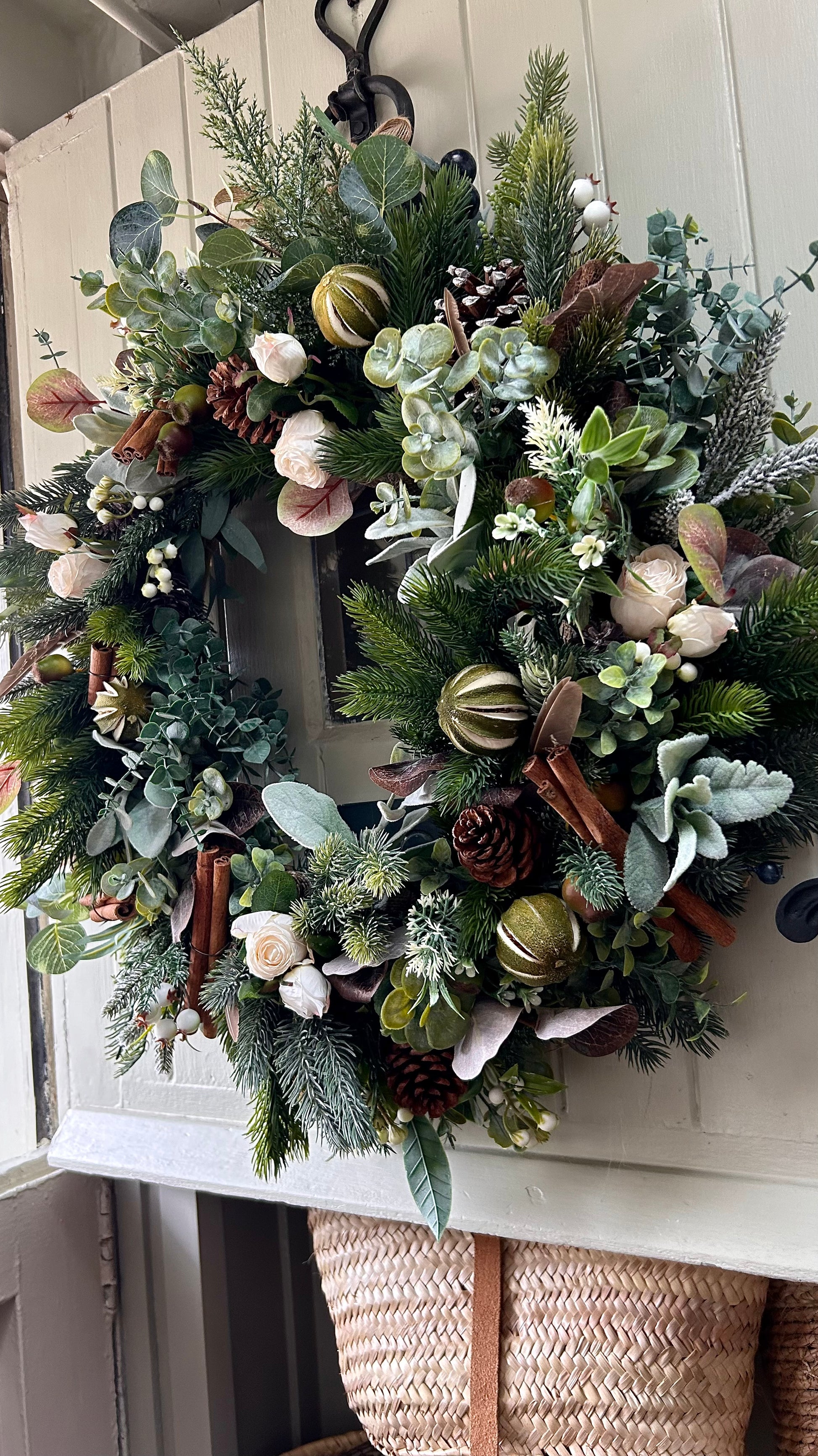 This “SHELBY” luxury artificial Christmas wreath is perfect for creating a festive atmosphere in your home. Get creative and customize with berries, apples and other festive accents. Featuring bell with velvet ribbon bow !