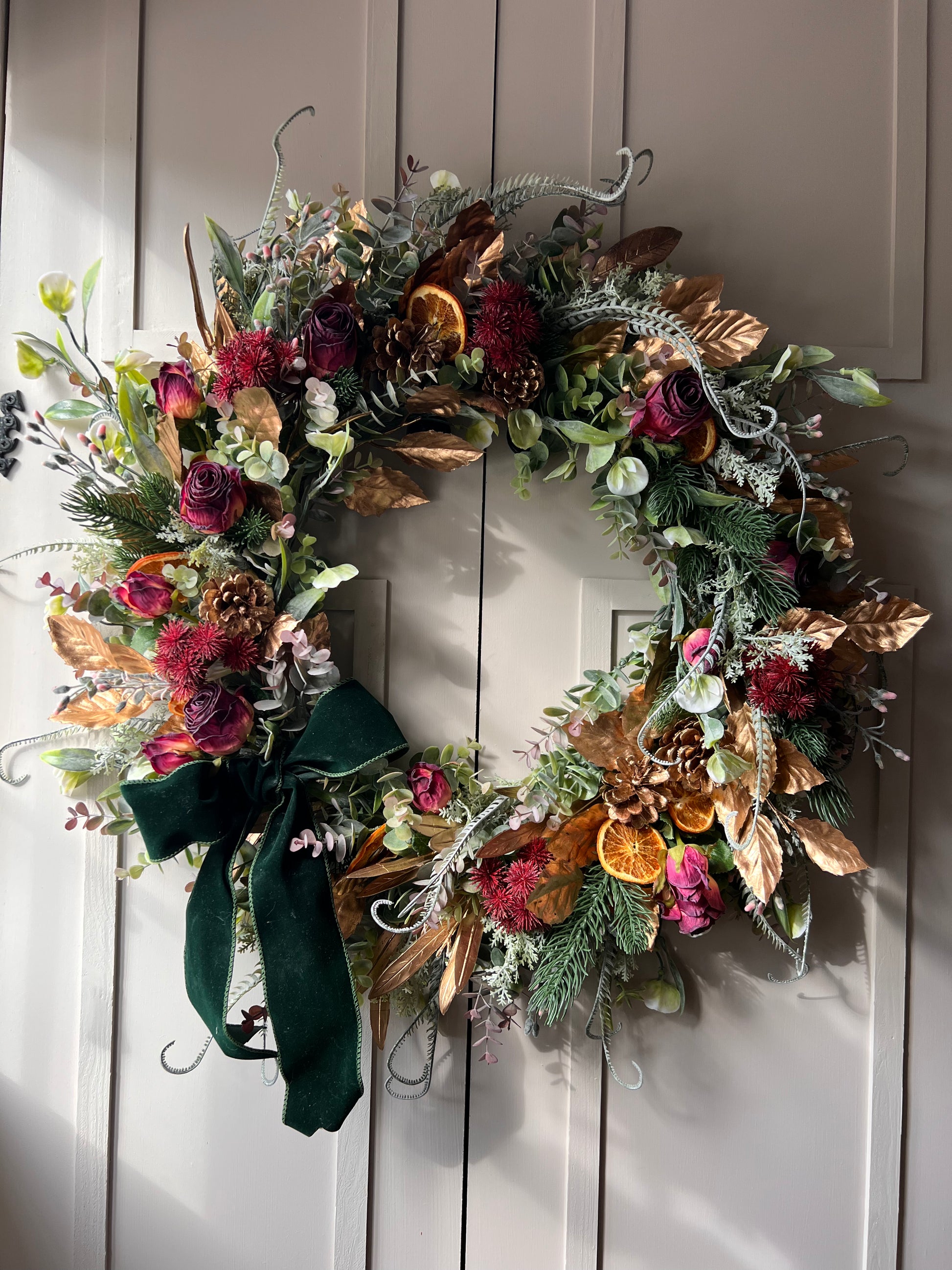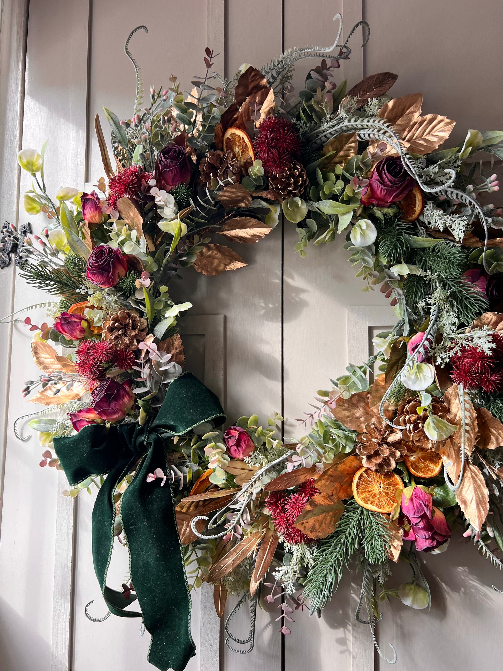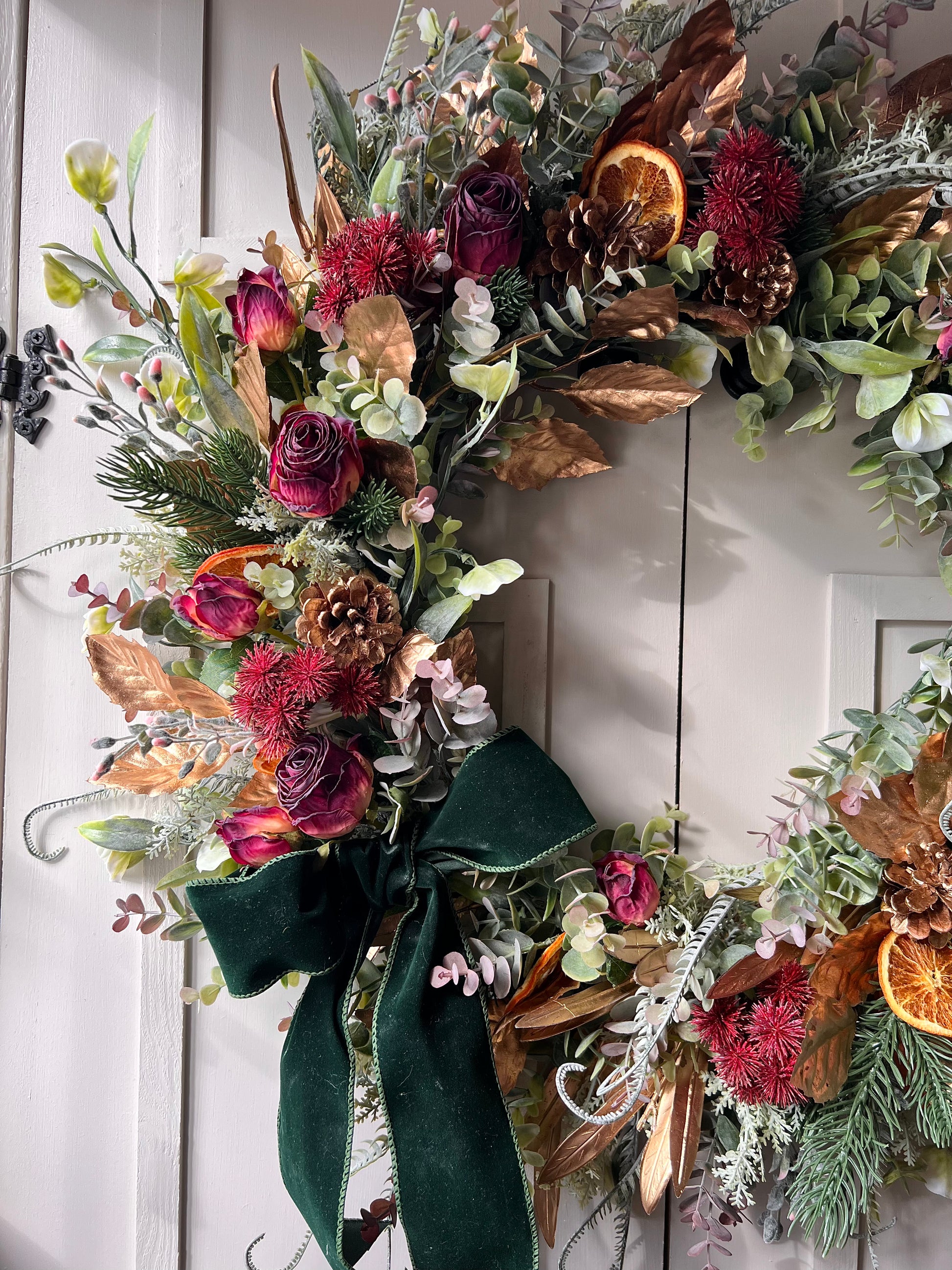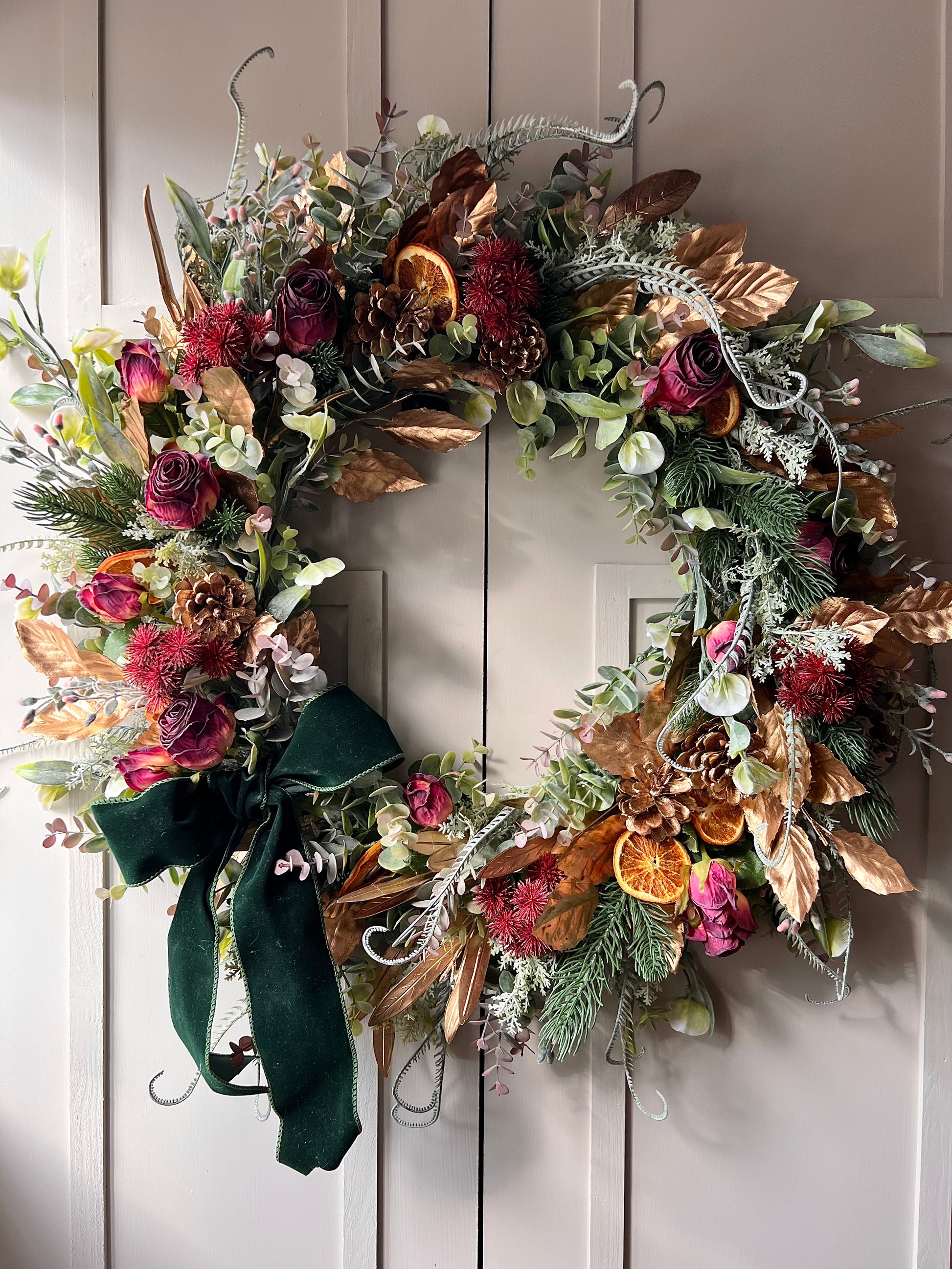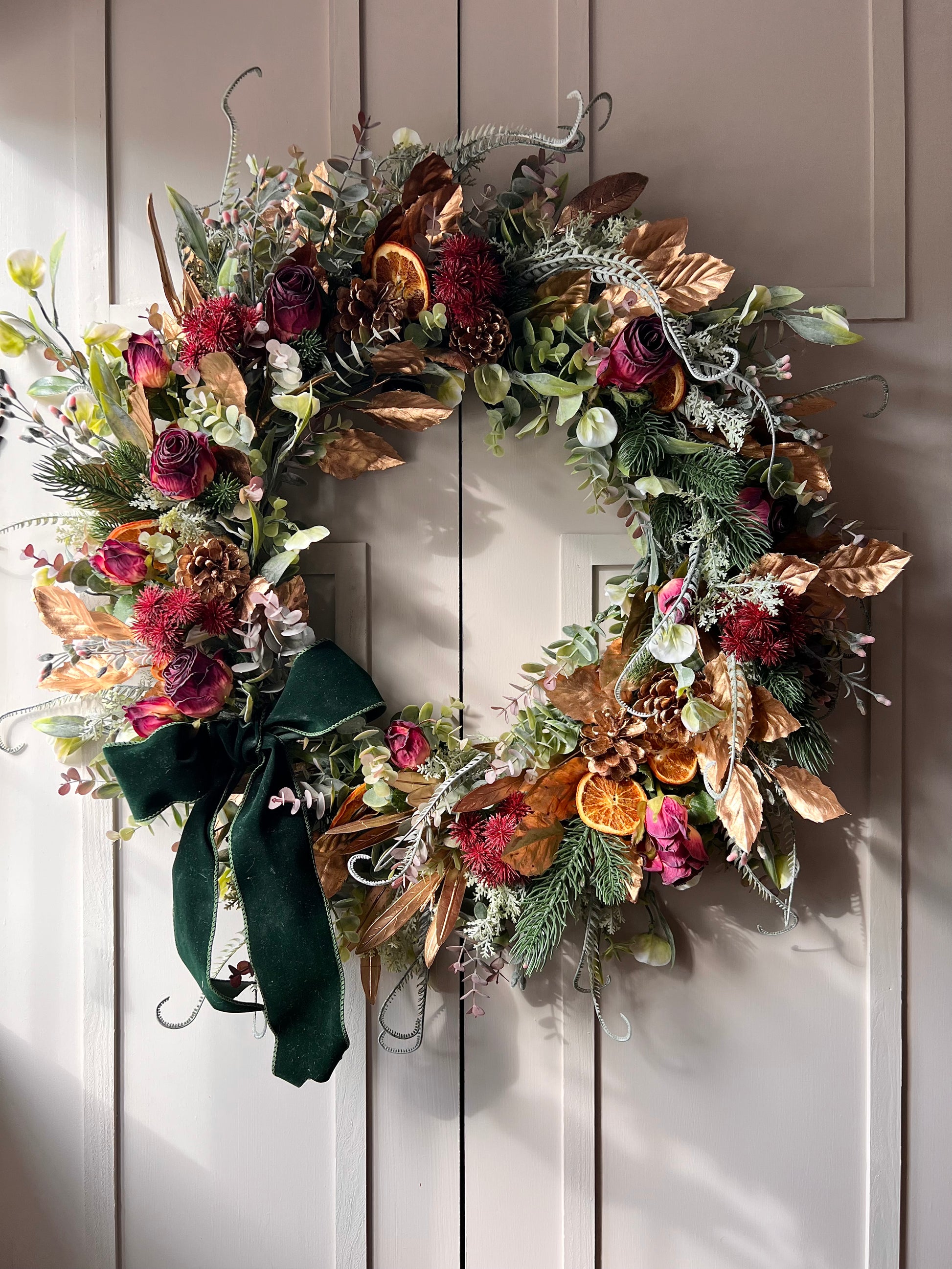 This soft, lush "Duchess" faux vintage wreath exudes winter luxury. The warm color palette and thick foliage bring holiday cheer to any space. Crafted from high-quality materials, this beautiful addition to your decor will last for years to come.