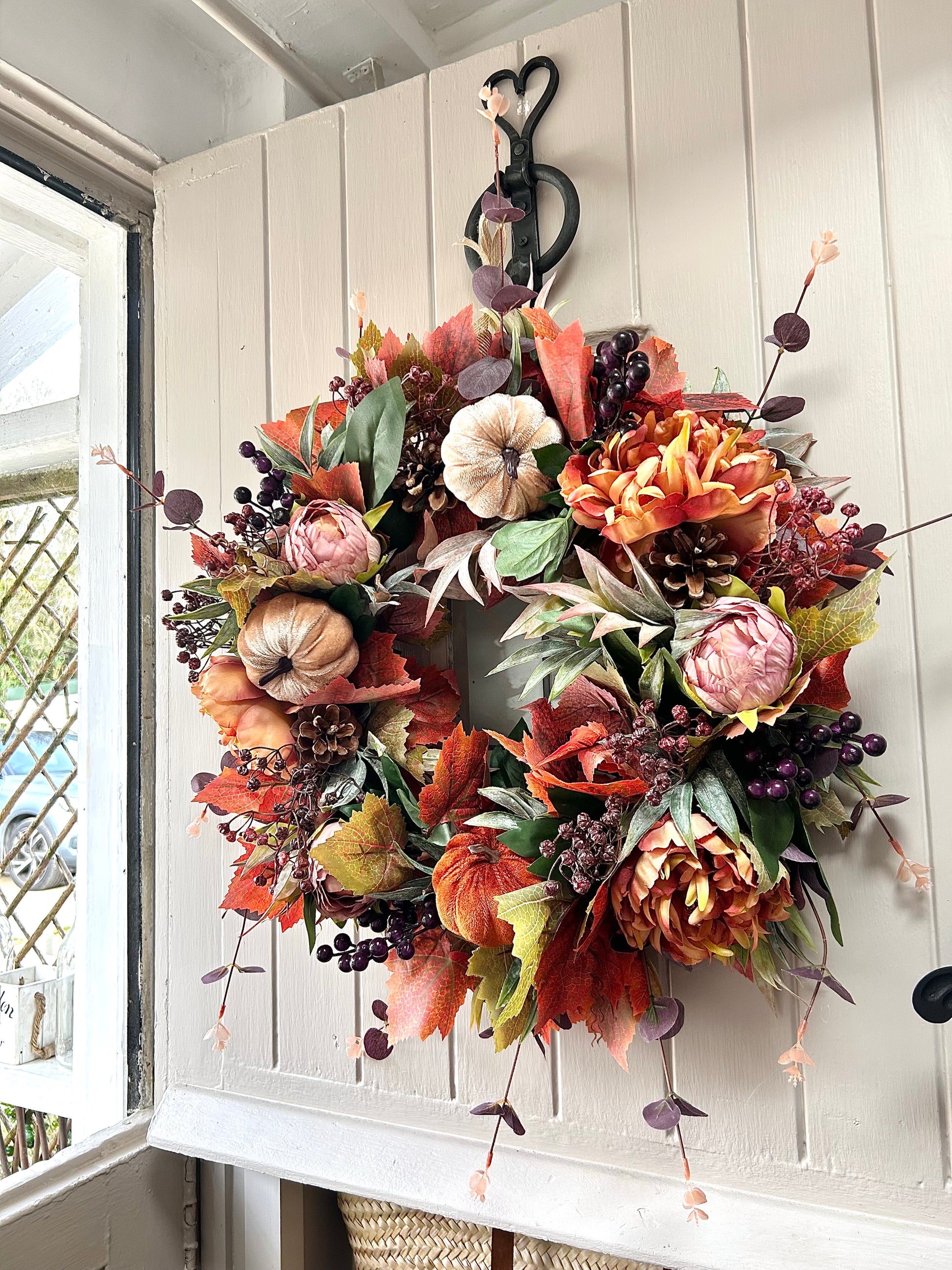 The "PUMPKIN SPICE" artificial autumn wreath is the perfect way to bring vibrant seasonal hues into your home. Crafted from luxury velvet, it is adorned with realistic pumpkins for a stunning splash of color that is sure to bring your home to life.
