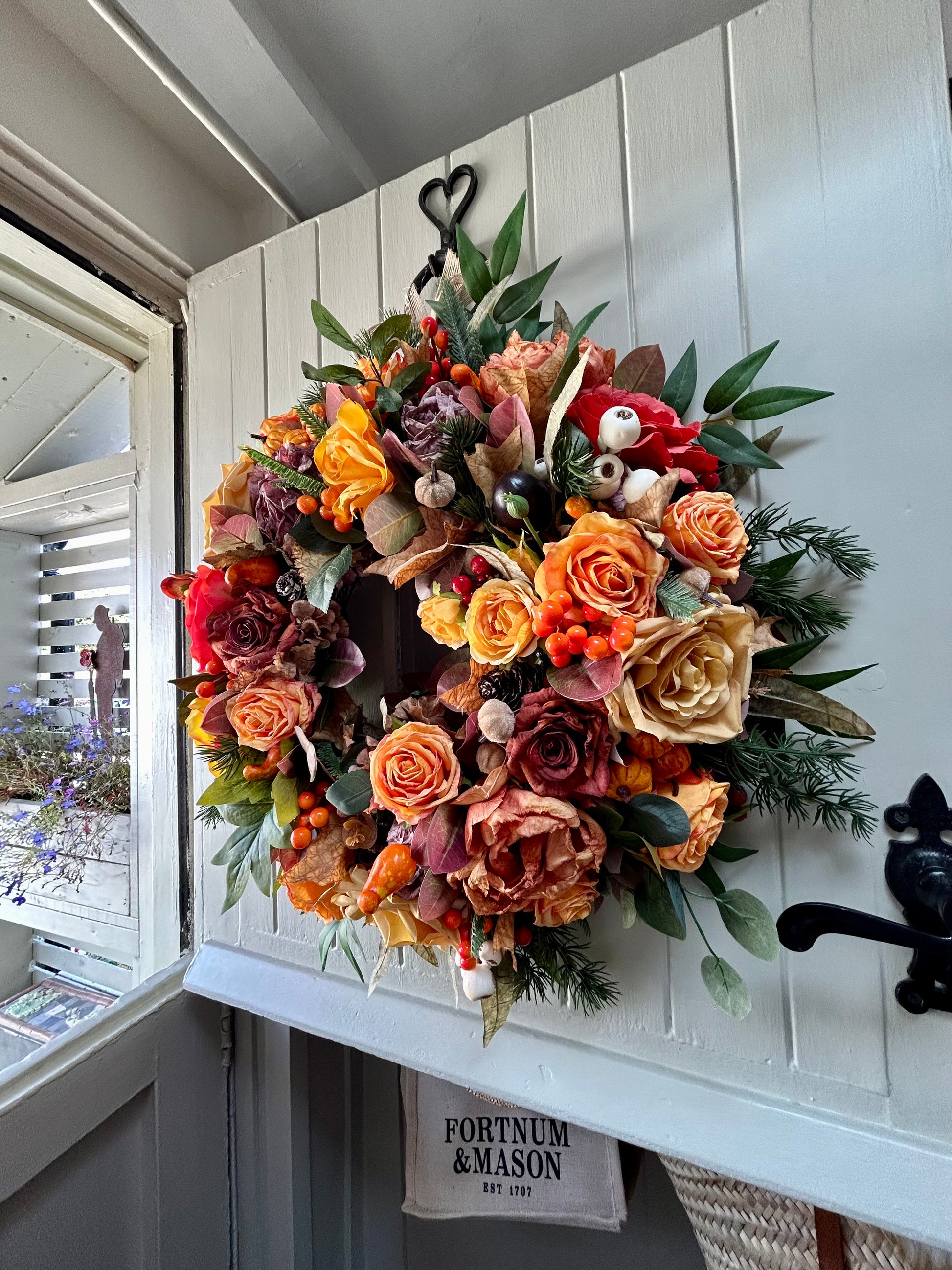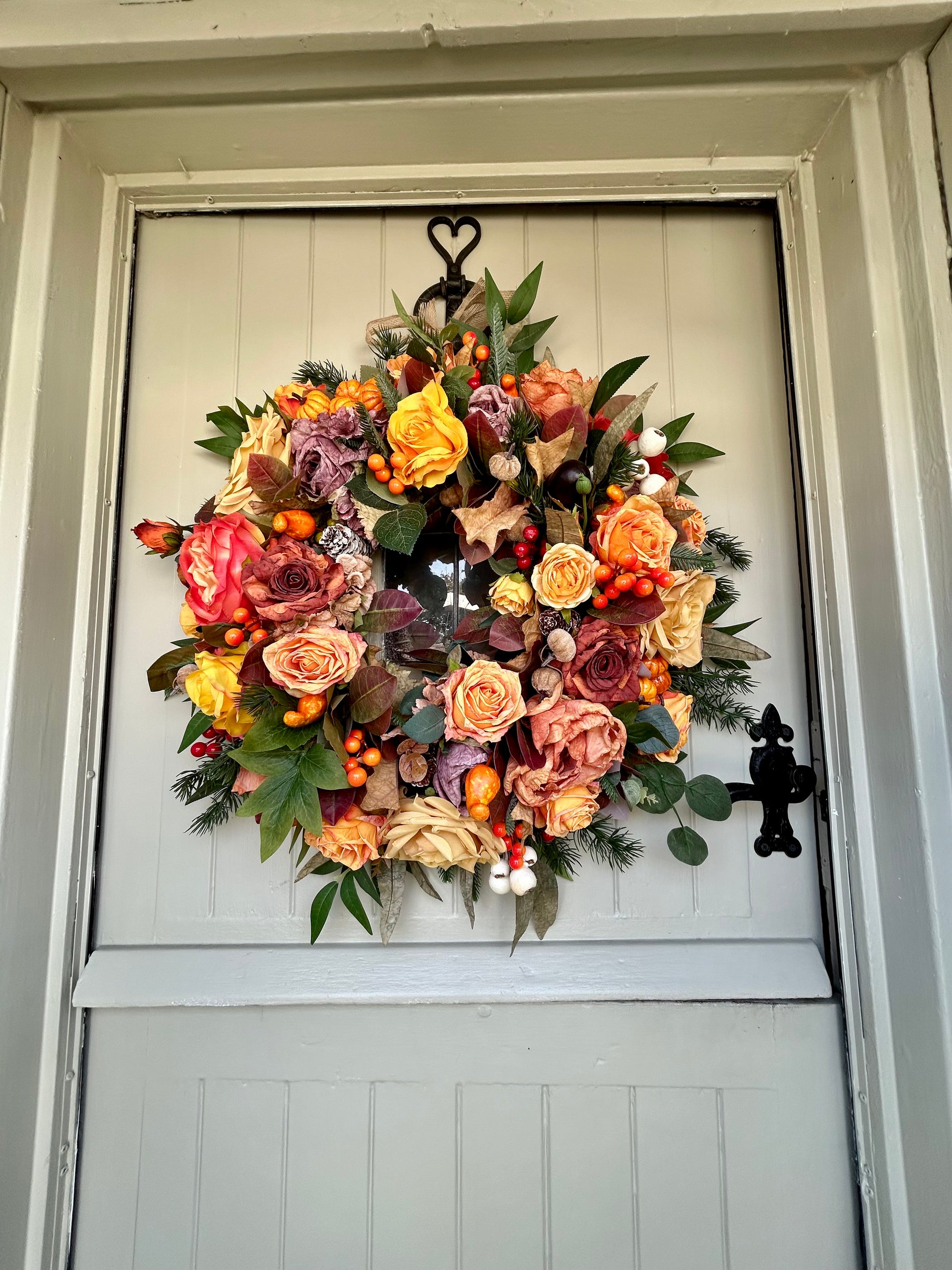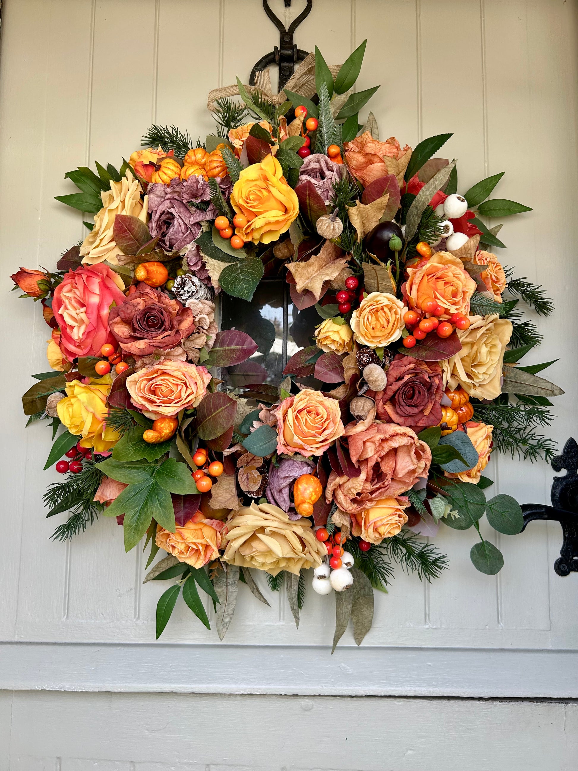 Introducing “CHLOE” a sophisticated AUTUMN bloom artificial wreath. Crafted with roses plus dry touch roses and weather-protected, ensuring a beautiful display that will last for years. Plus, free shipping with purchase. Add a touch of elegance and beauty to your home.
