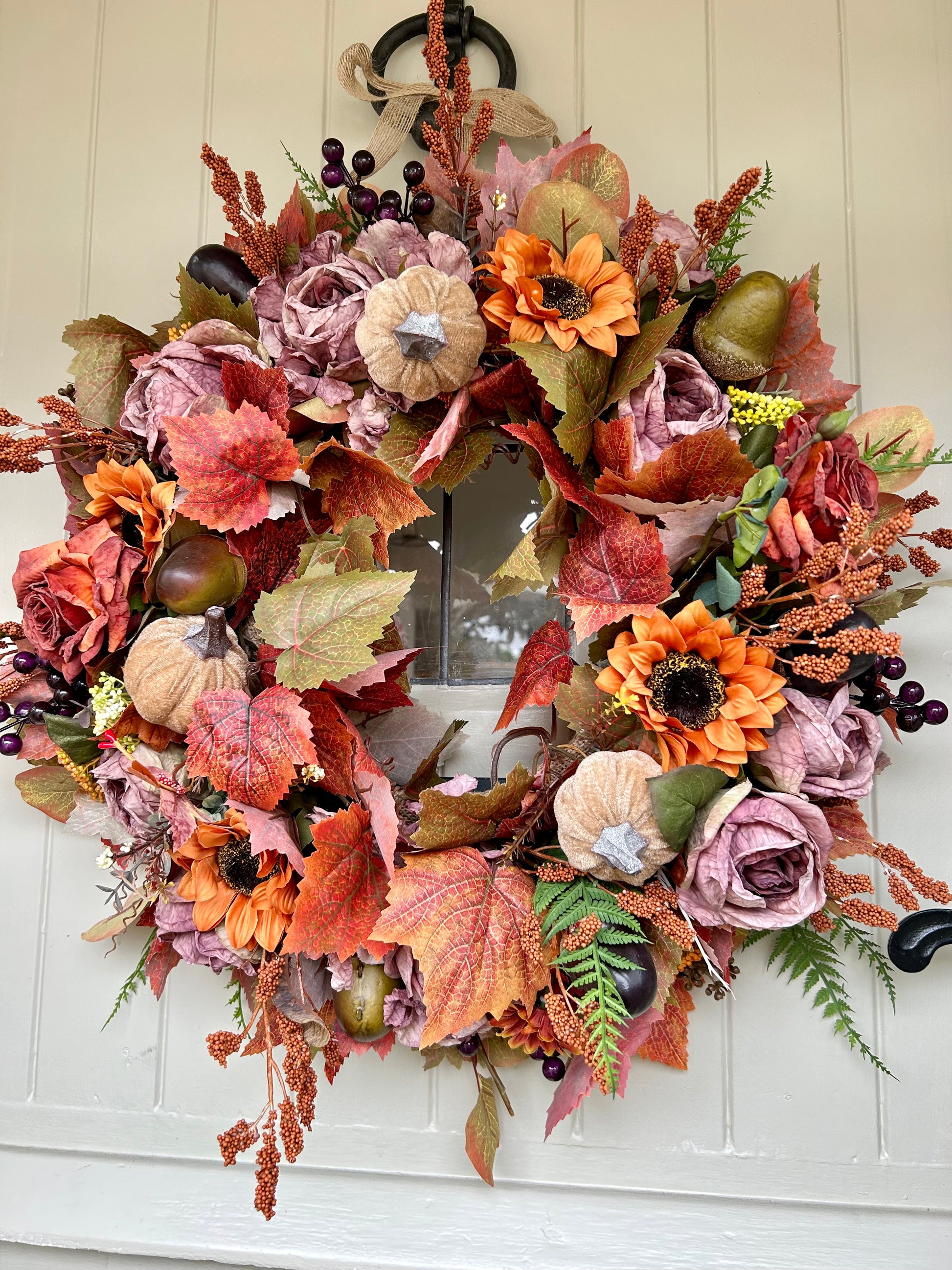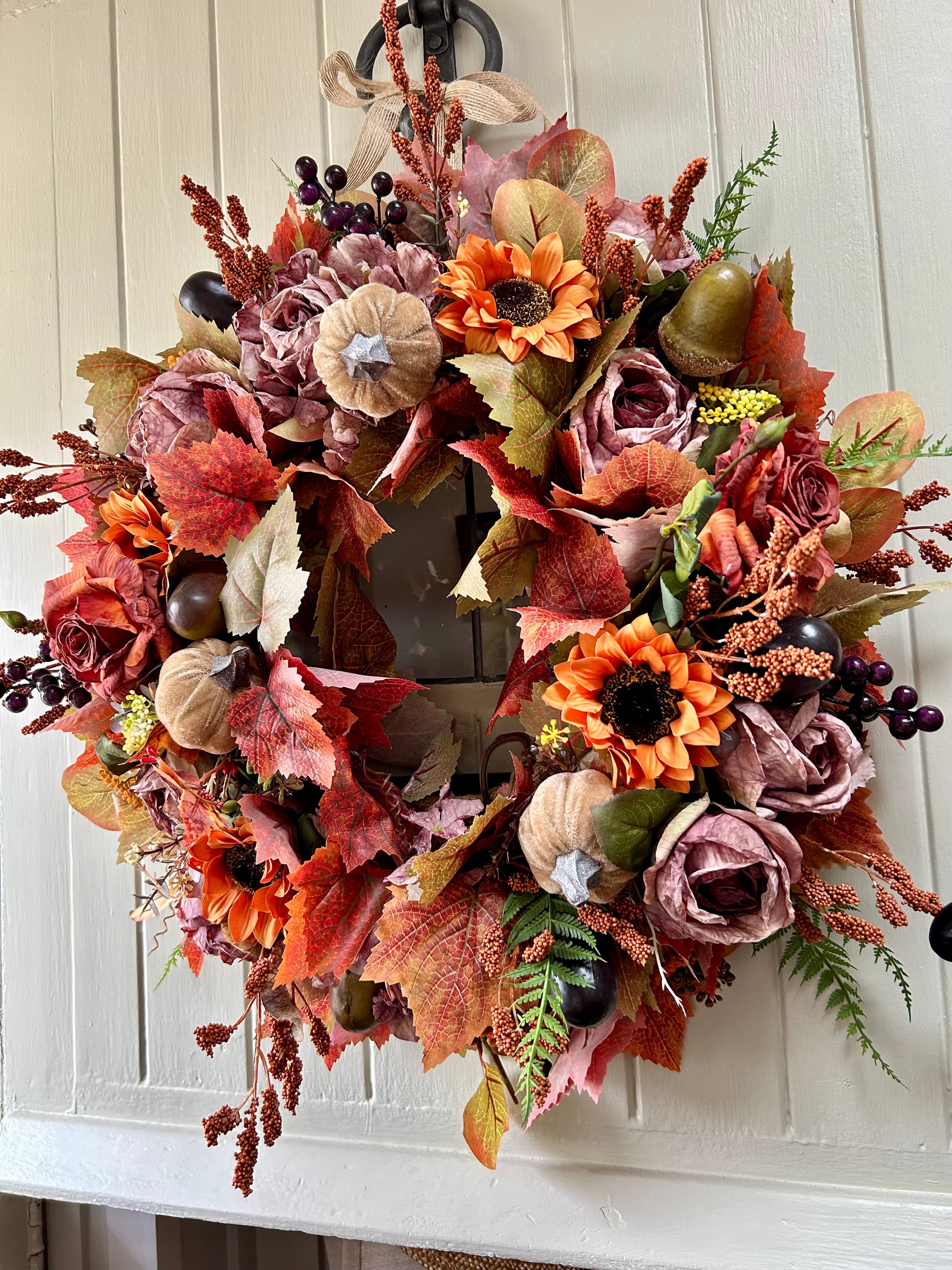 Introducing "AUTUMN FALLS” a sophisticated full bloom artificial wreath. Crafted with autumnal flowers dry touch roses and rananculus this wreath is chunky, lush, and weather-protected, ensuring a beautiful display that will last for years. Plus, free shipping with purchase. Add a touch of elegance and beauty to your home.