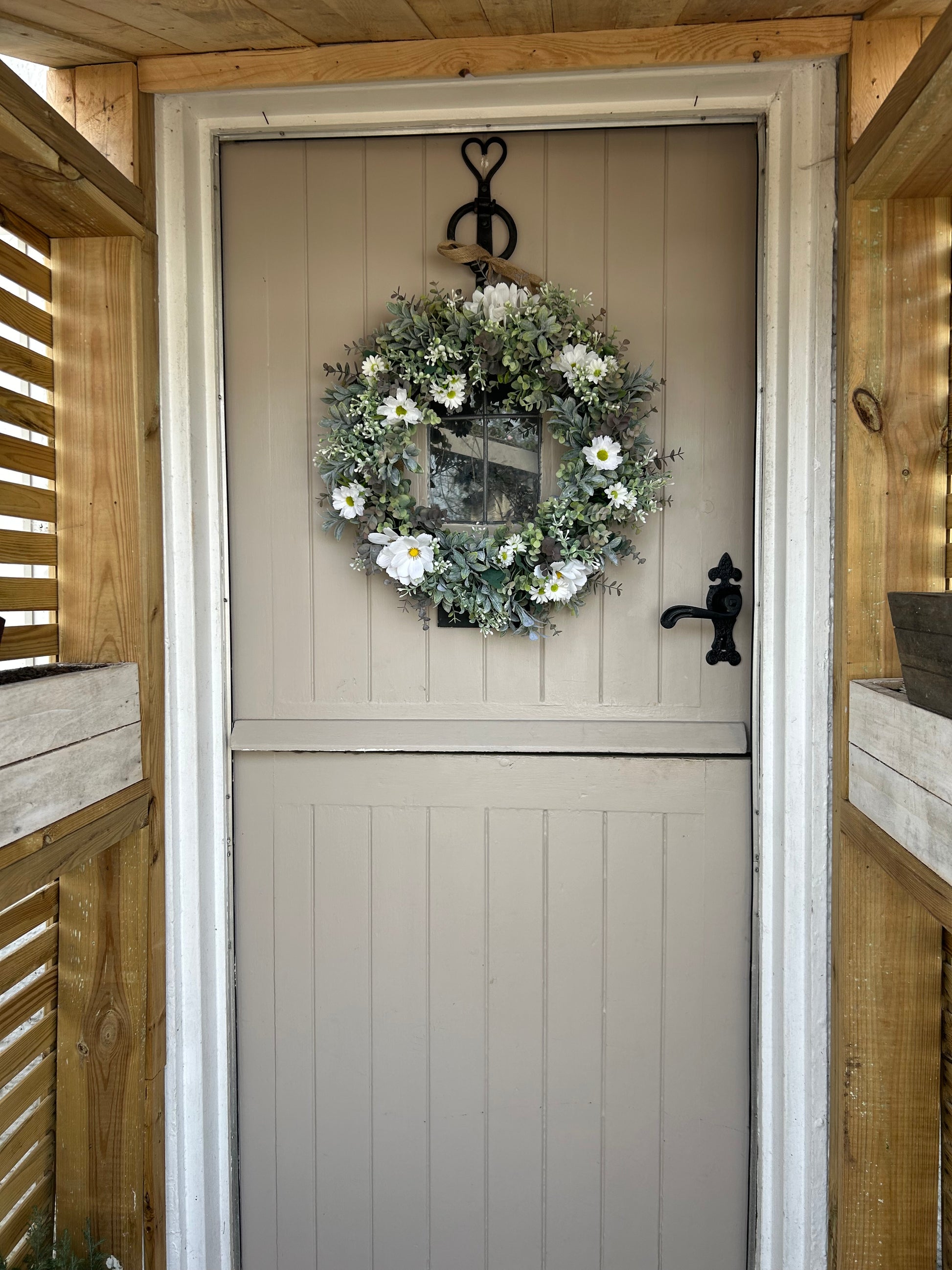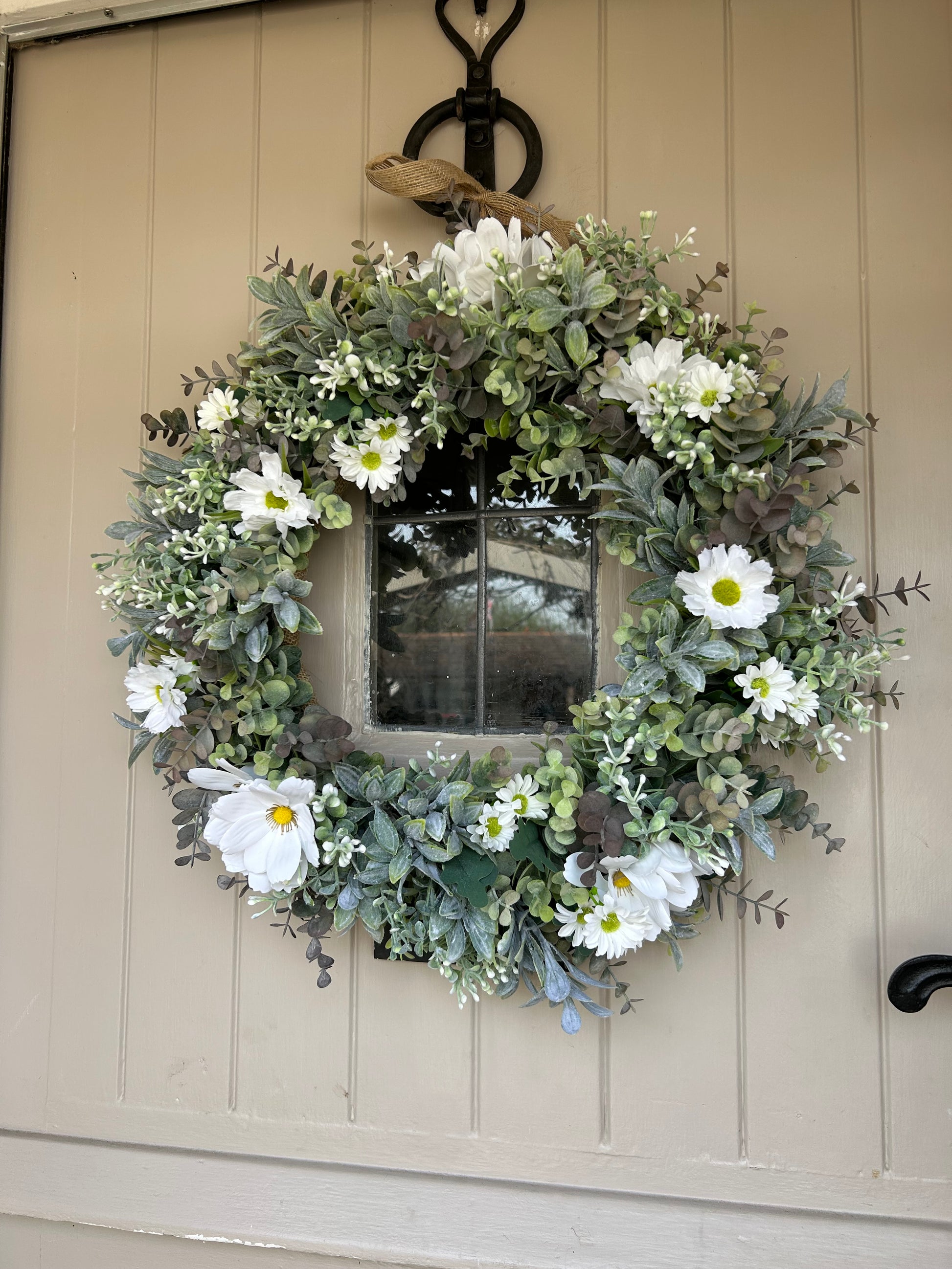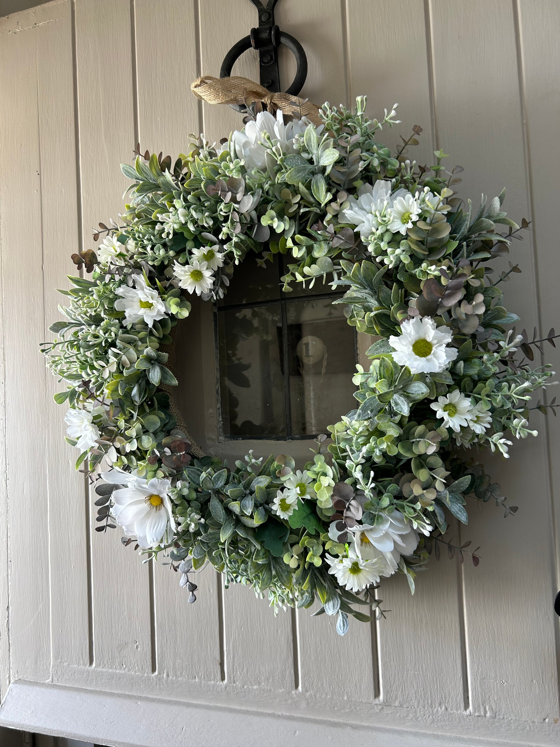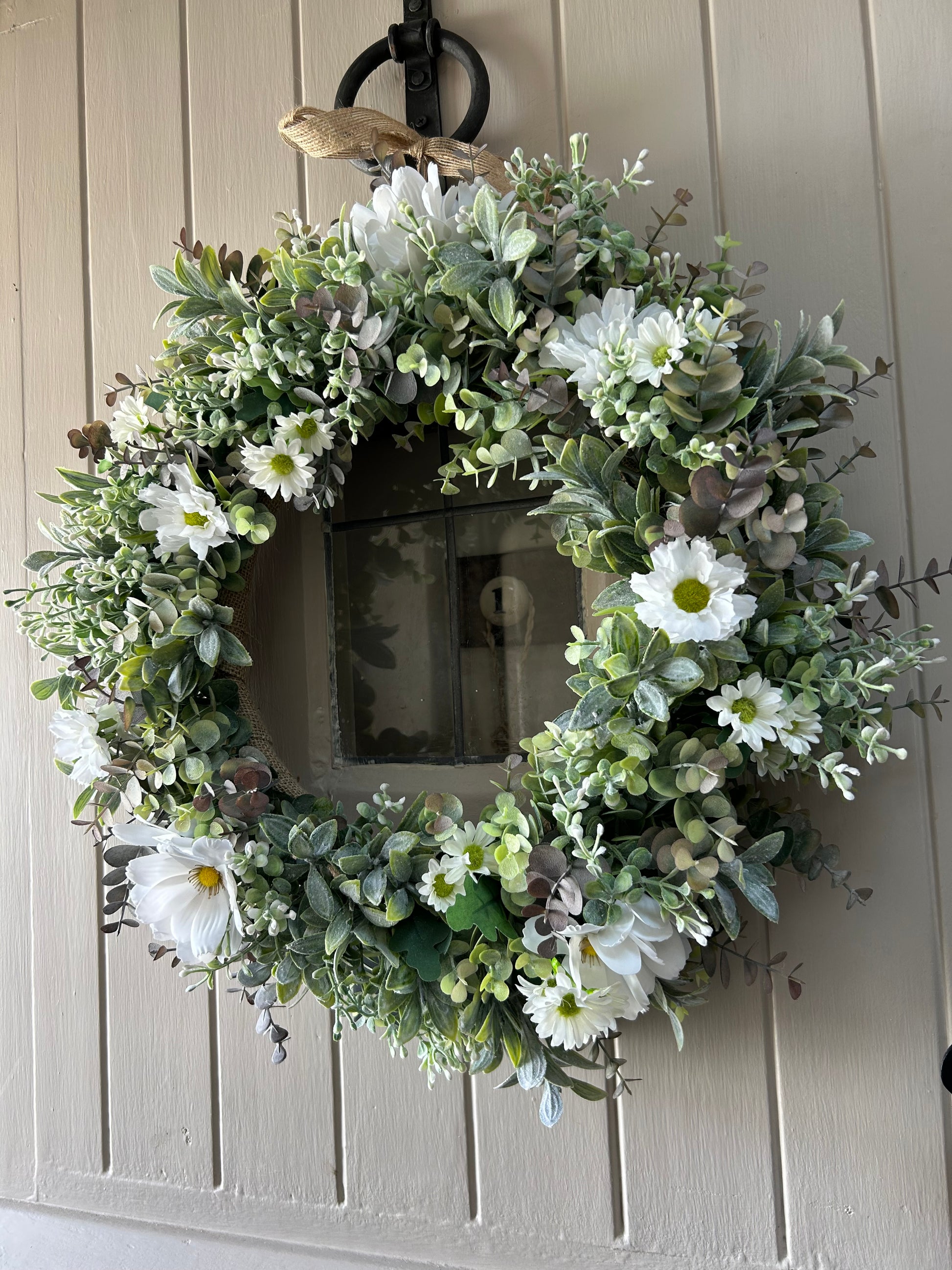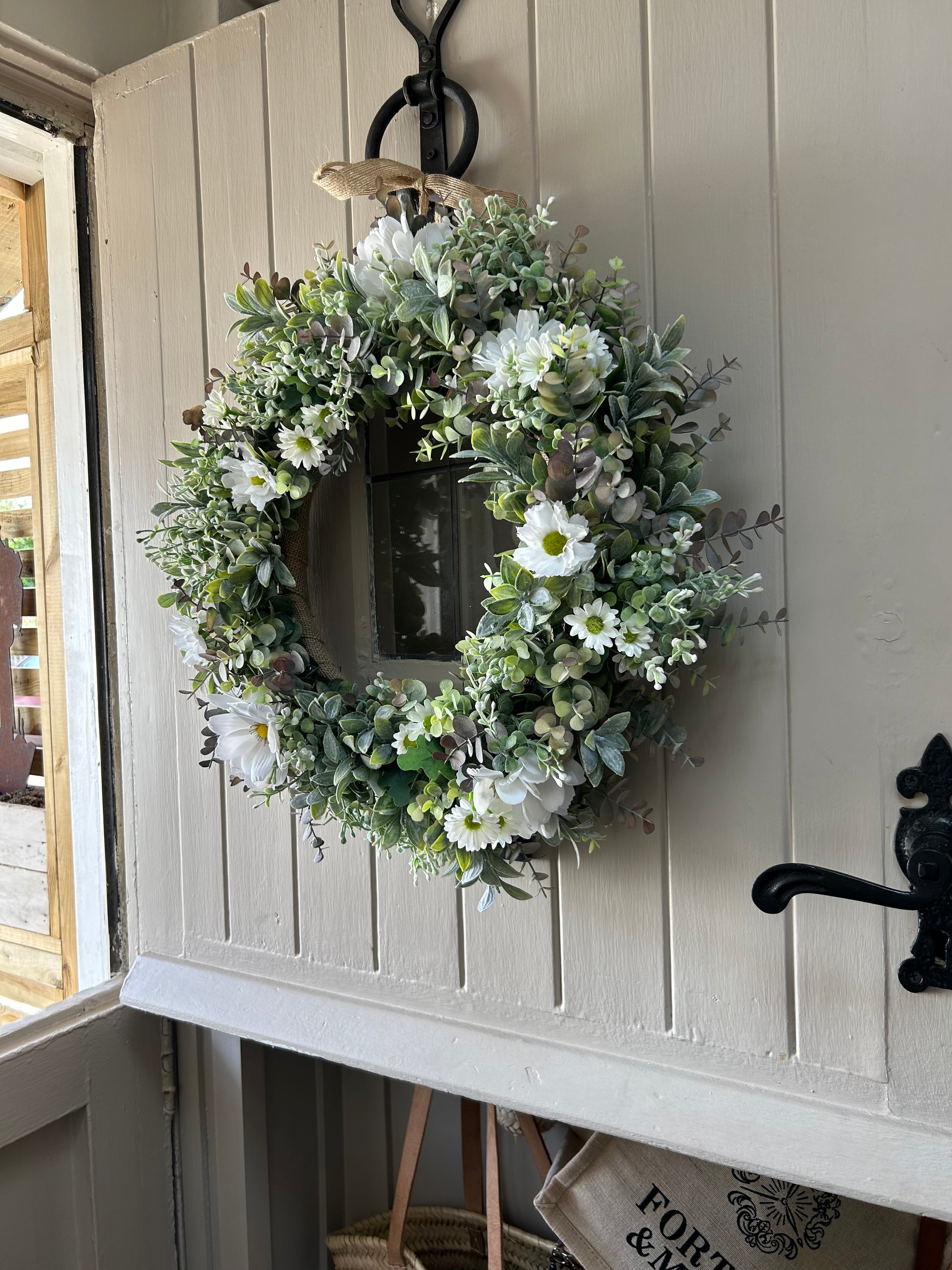 A quaint daisy style wreath made with eucalyptus, gypsophilia and daisys