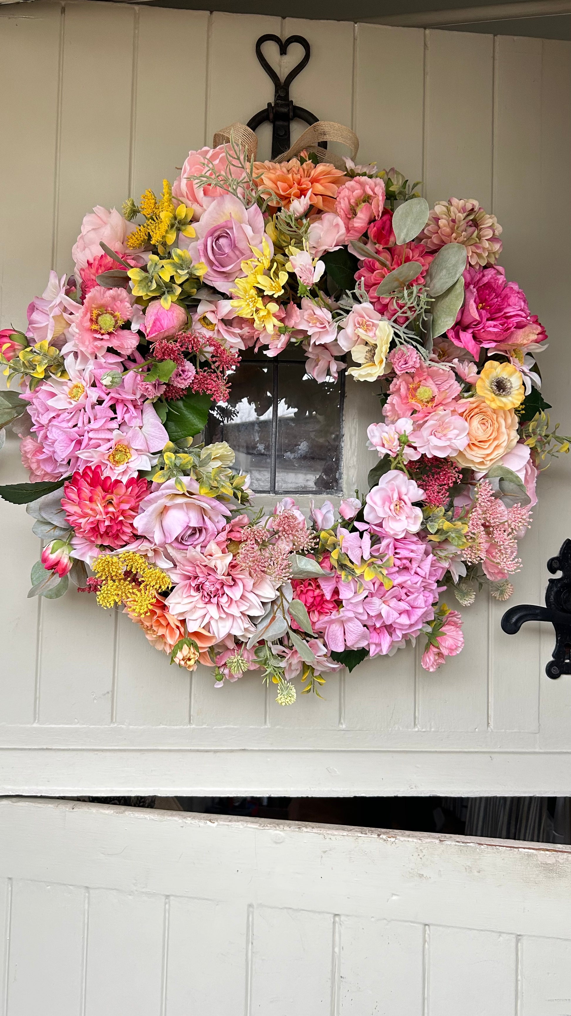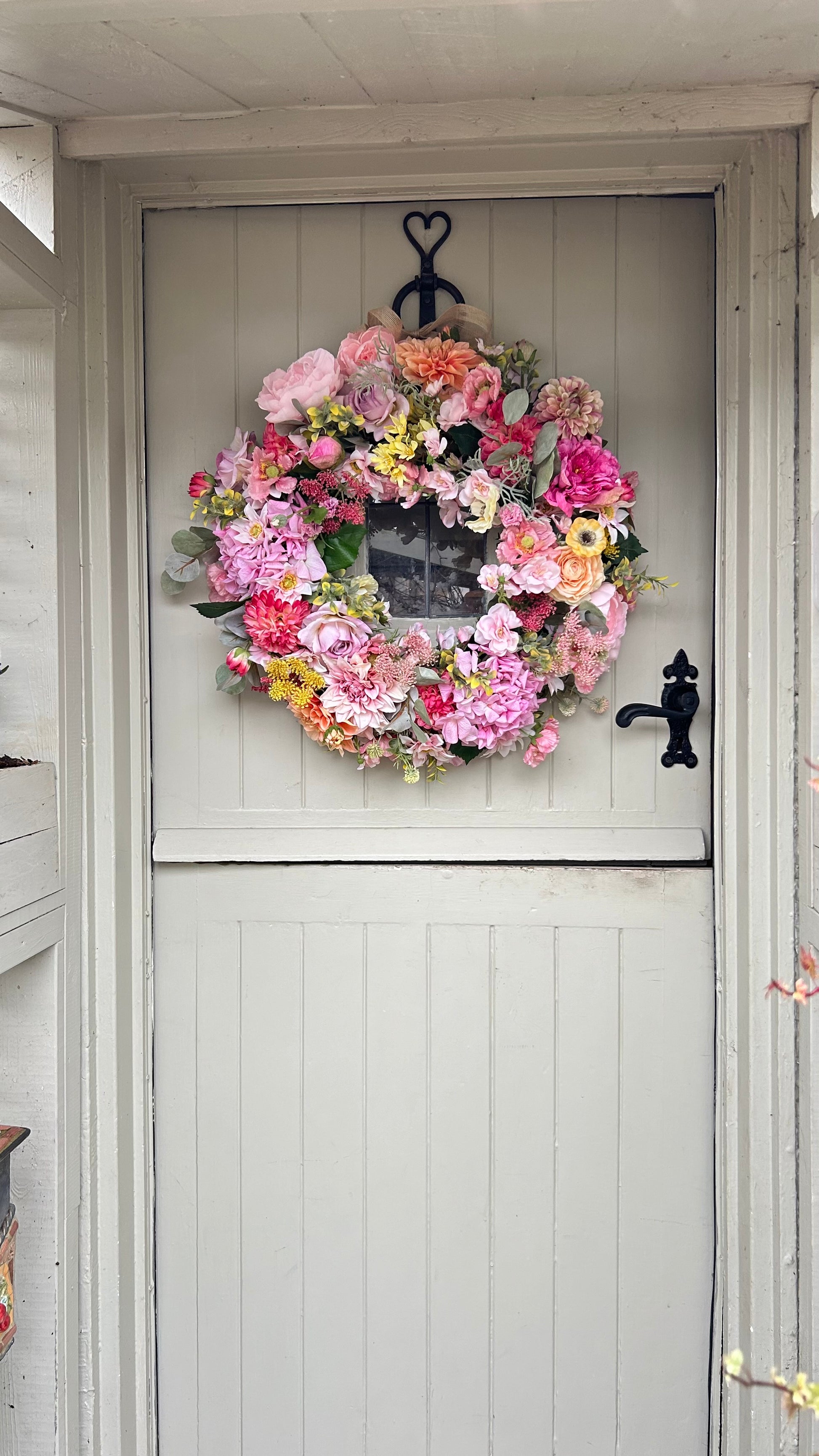 Introducing a sophisticated full bloom artificial wreath. Crafted with hydrangea flowers dry touch roses and rananculus this wreath is chunky, lush, and weather-protected, ensuring a beautiful display that will last for years. Plus, free shipping with purchase. Add a touch of elegance and beauty to your home.
