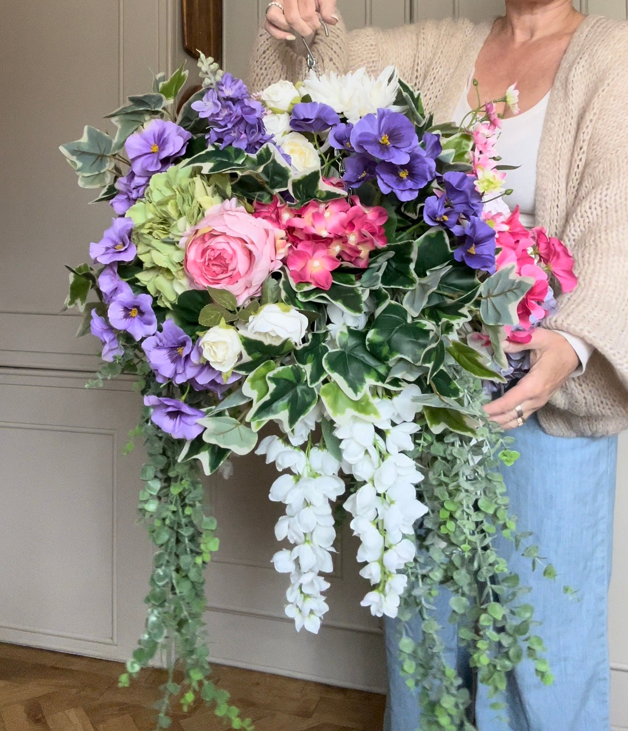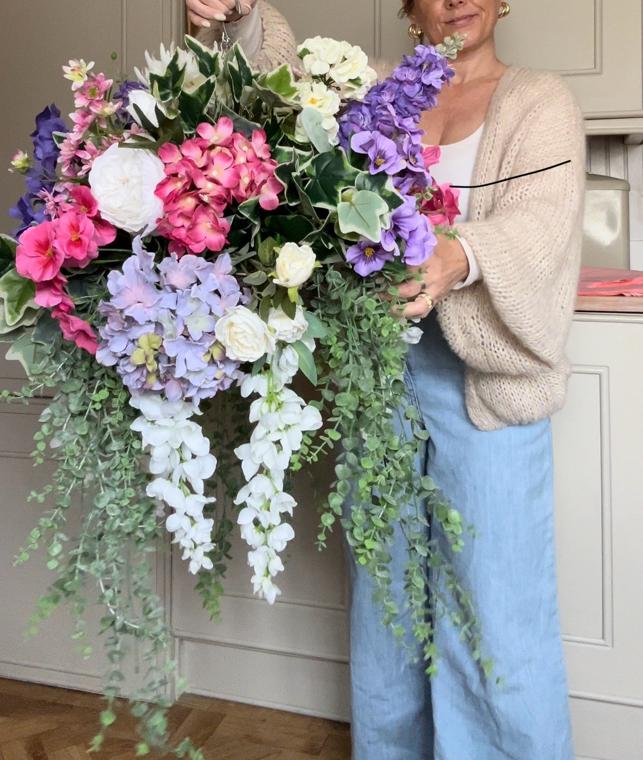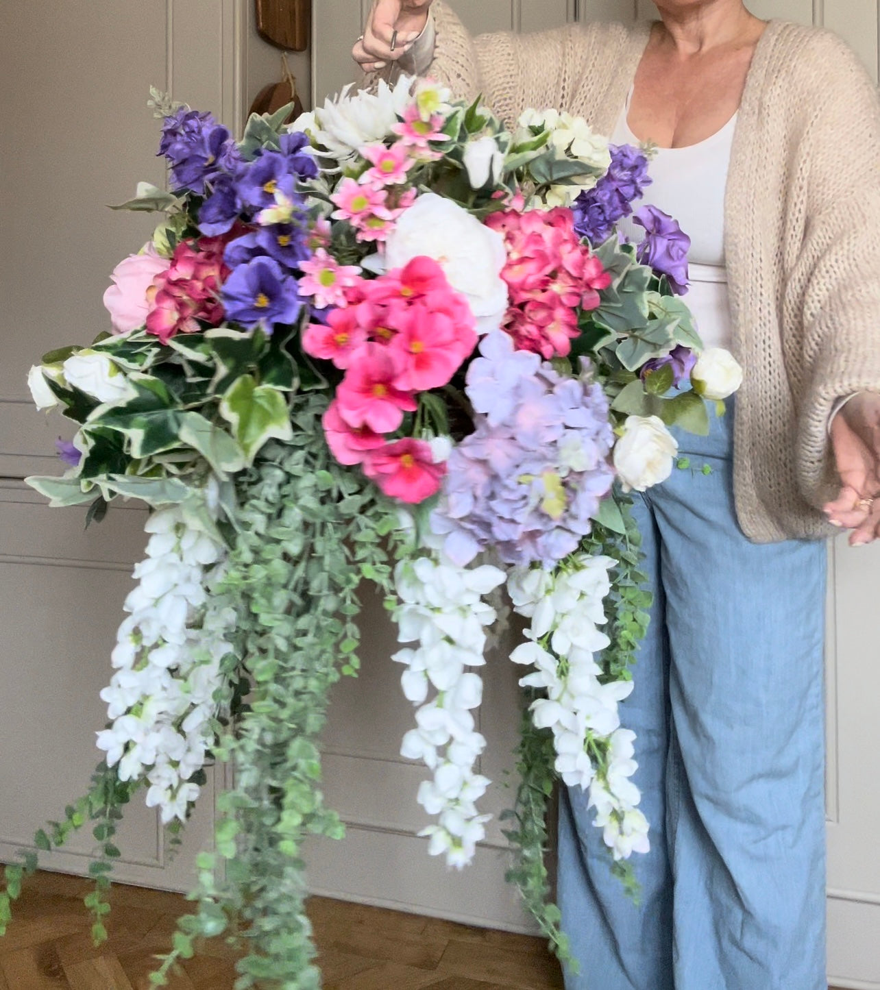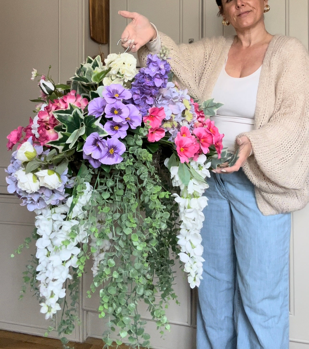 The “FRAN” Artificial Hanging Basket brings a luxurious, natural touch to your home or garden. Expertly crafted using realistic, dry-touch roses and ivy, it makes a stunning statement piece. Best of all, it requires no maintenance and looks breathtakingly beautiful year-round.