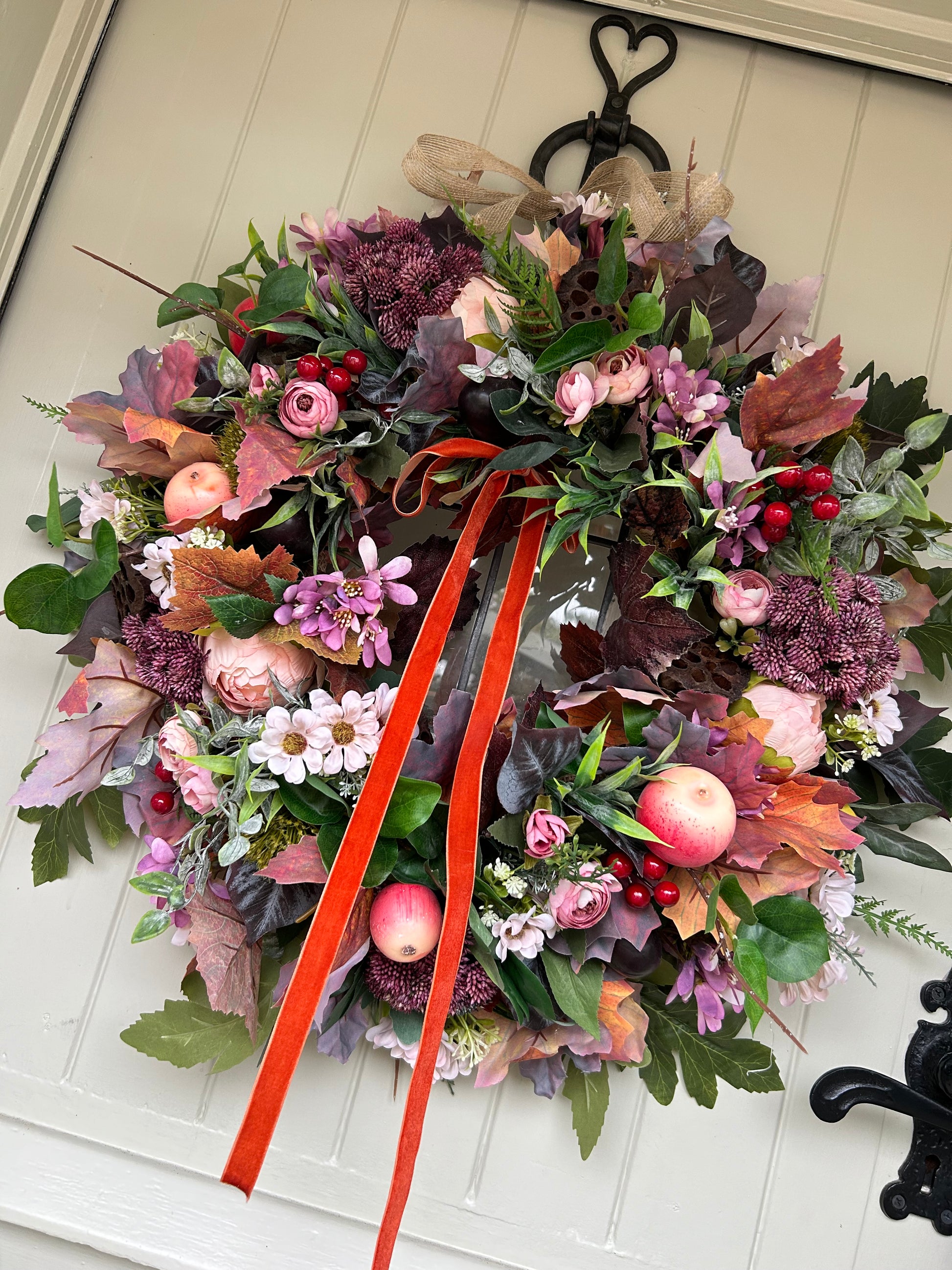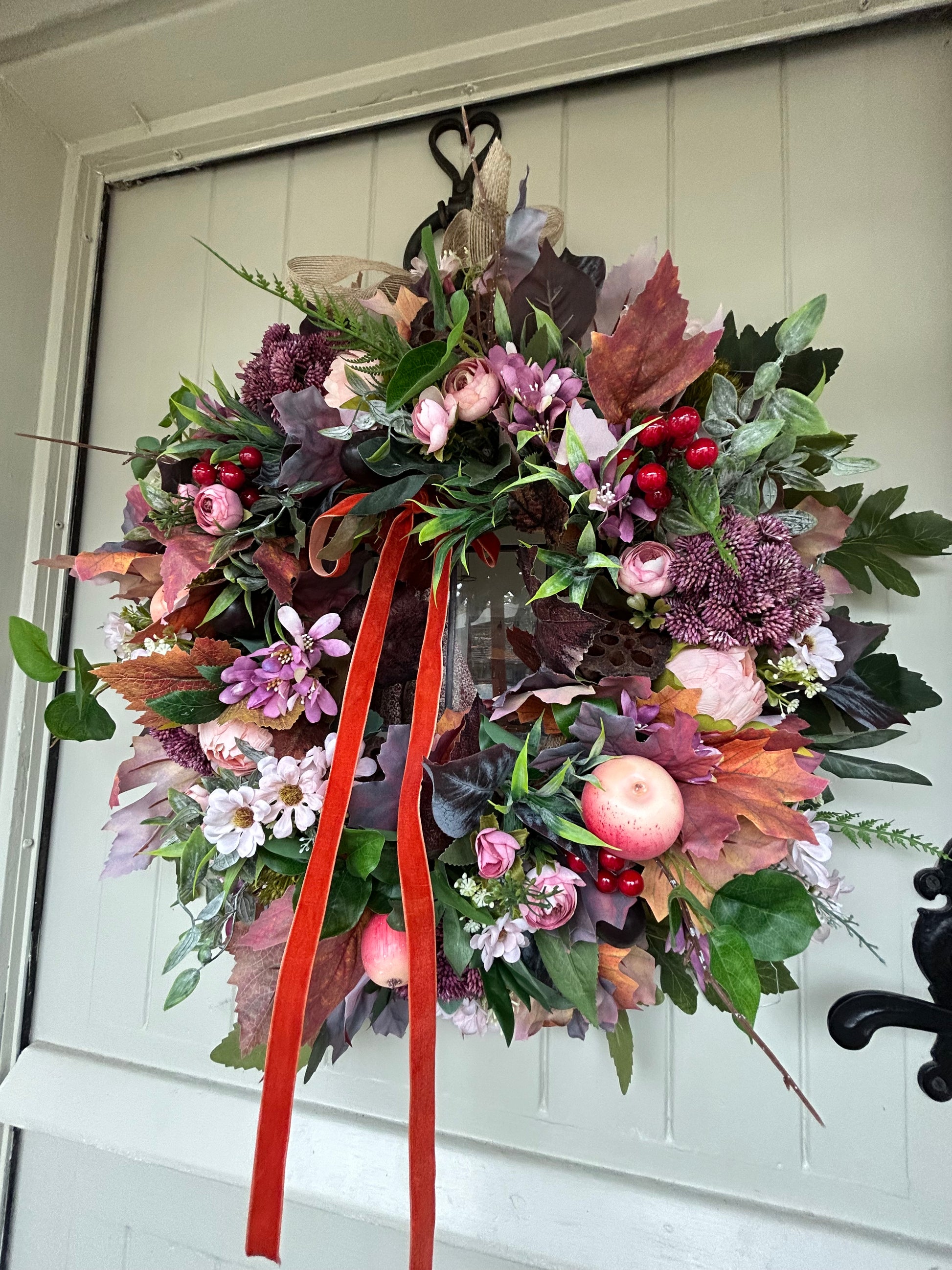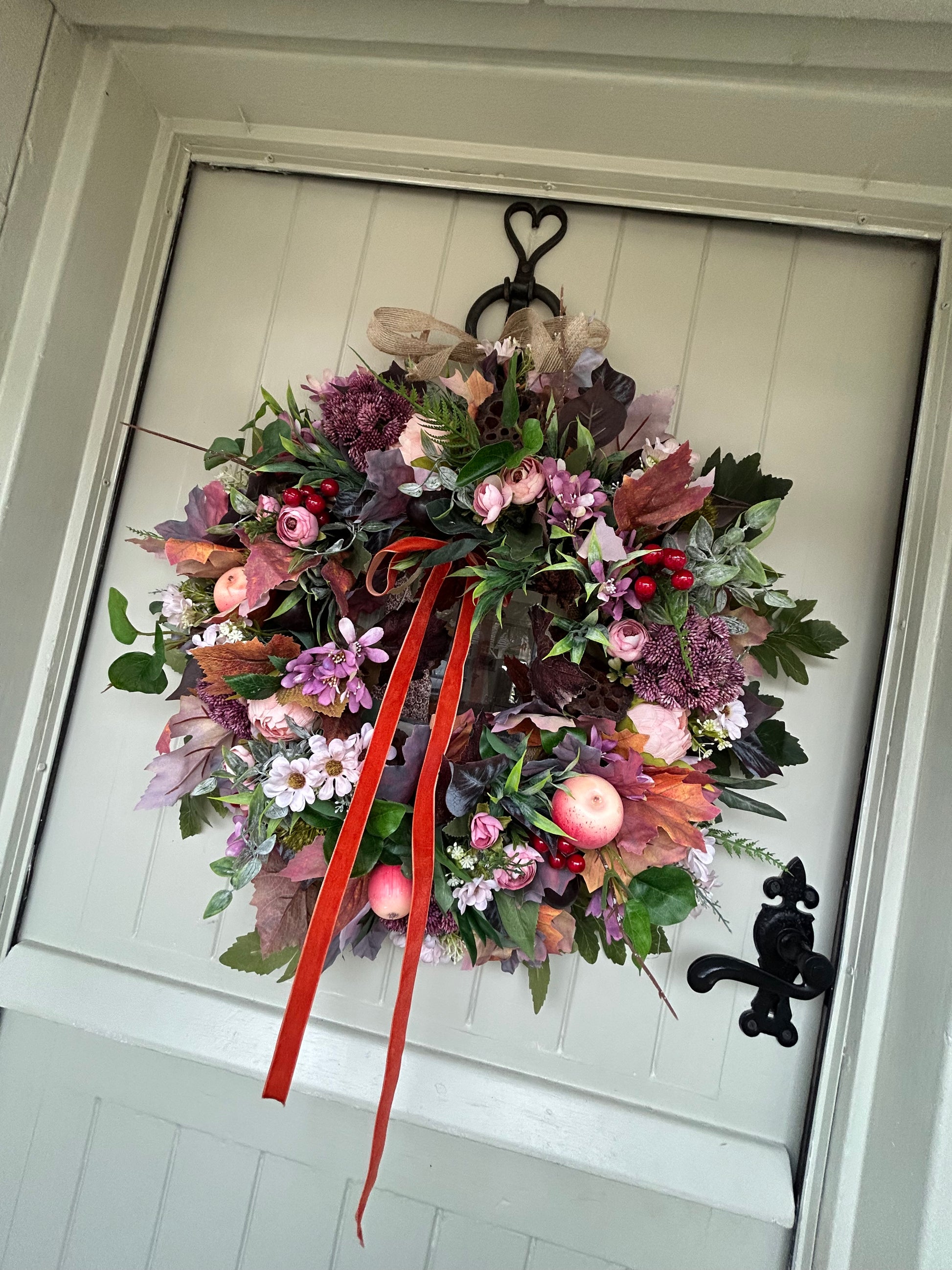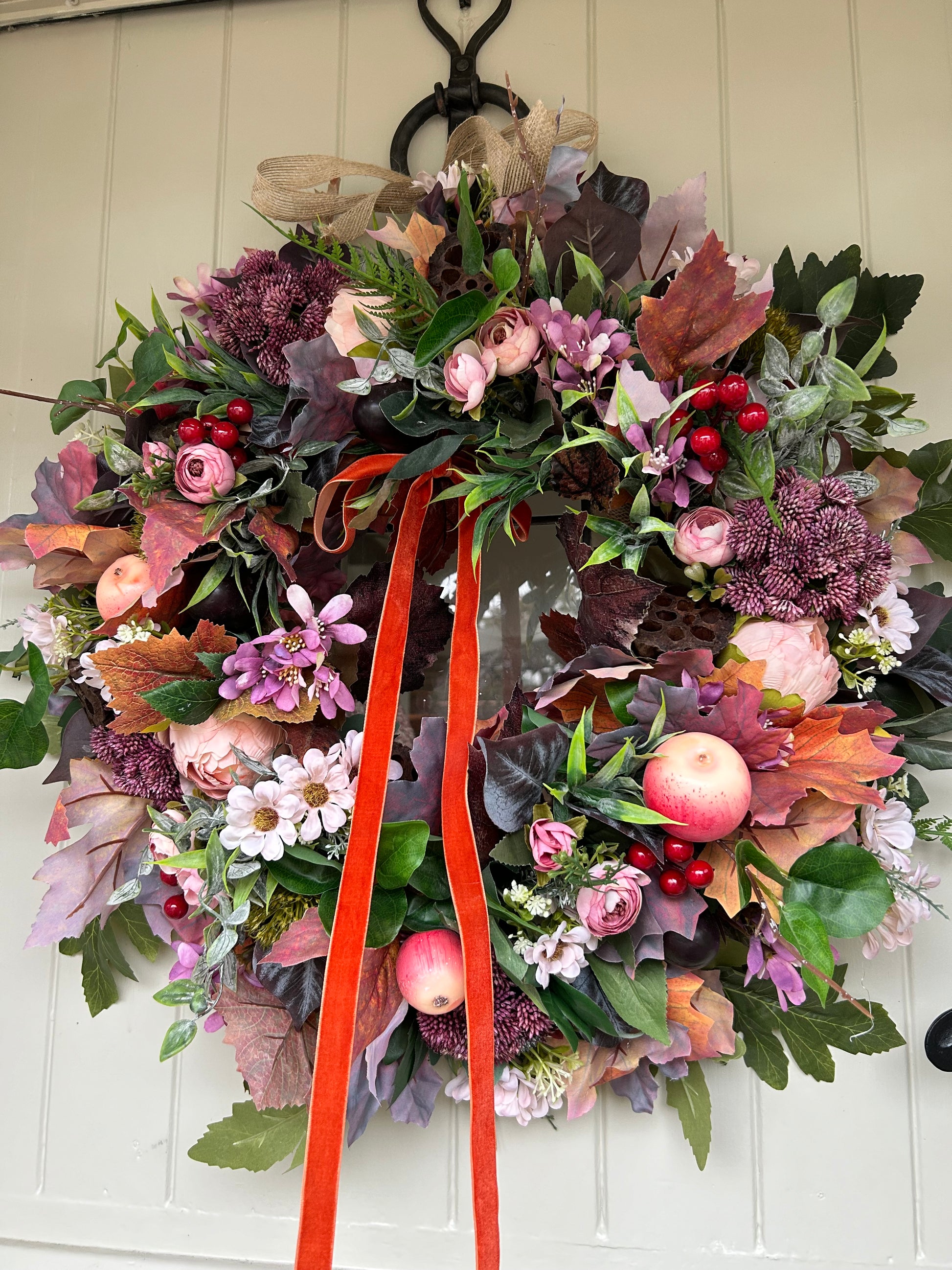 Introducing “EMILY” a sophisticated AUTUMN bloom artificial wreath. Crafted with roses plus dry touch roses and weather-protected, ensuring a beautiful display that will last for years. Plus, free shipping with purchase. Add a touch of elegance and beauty to your home.