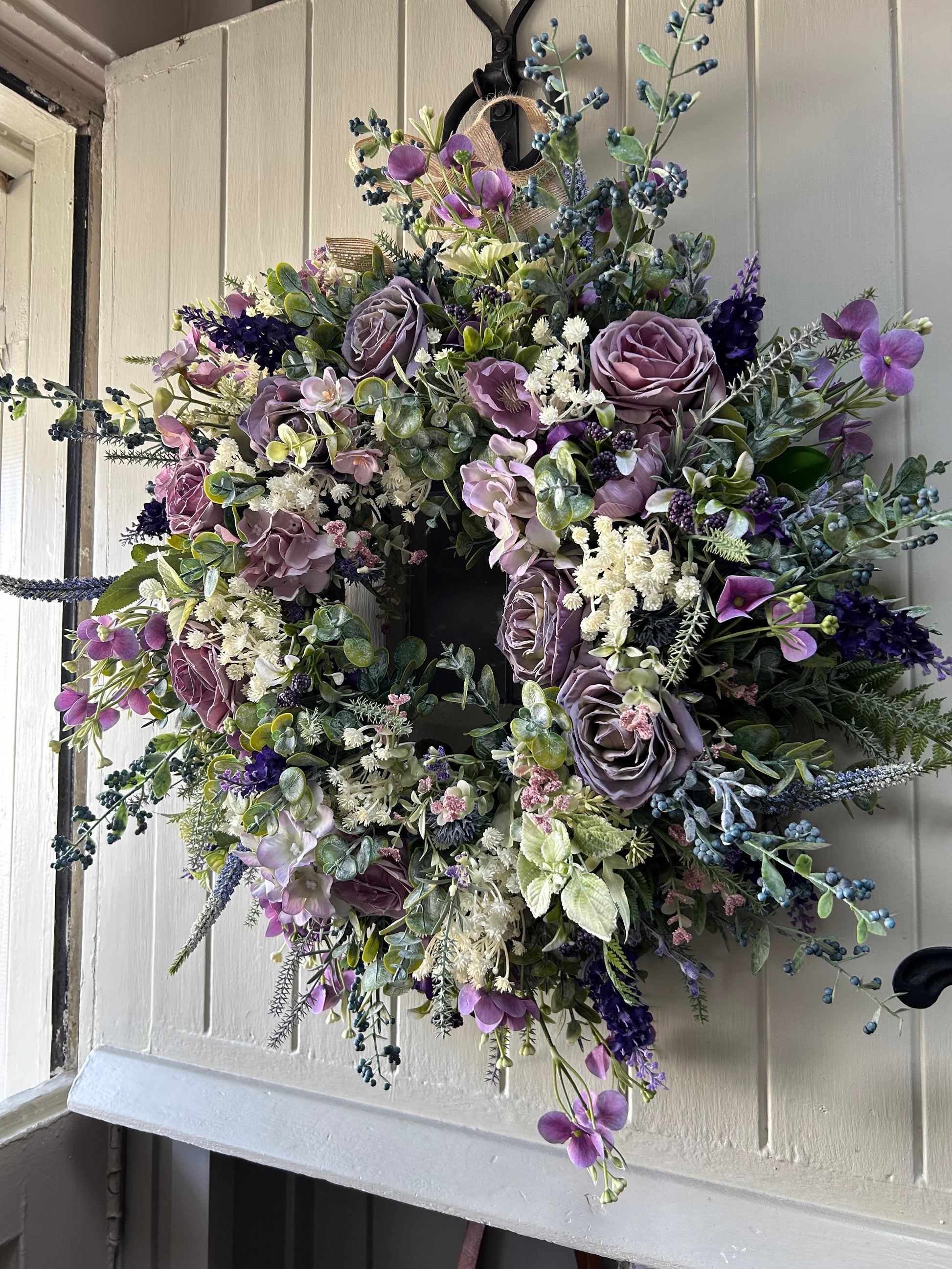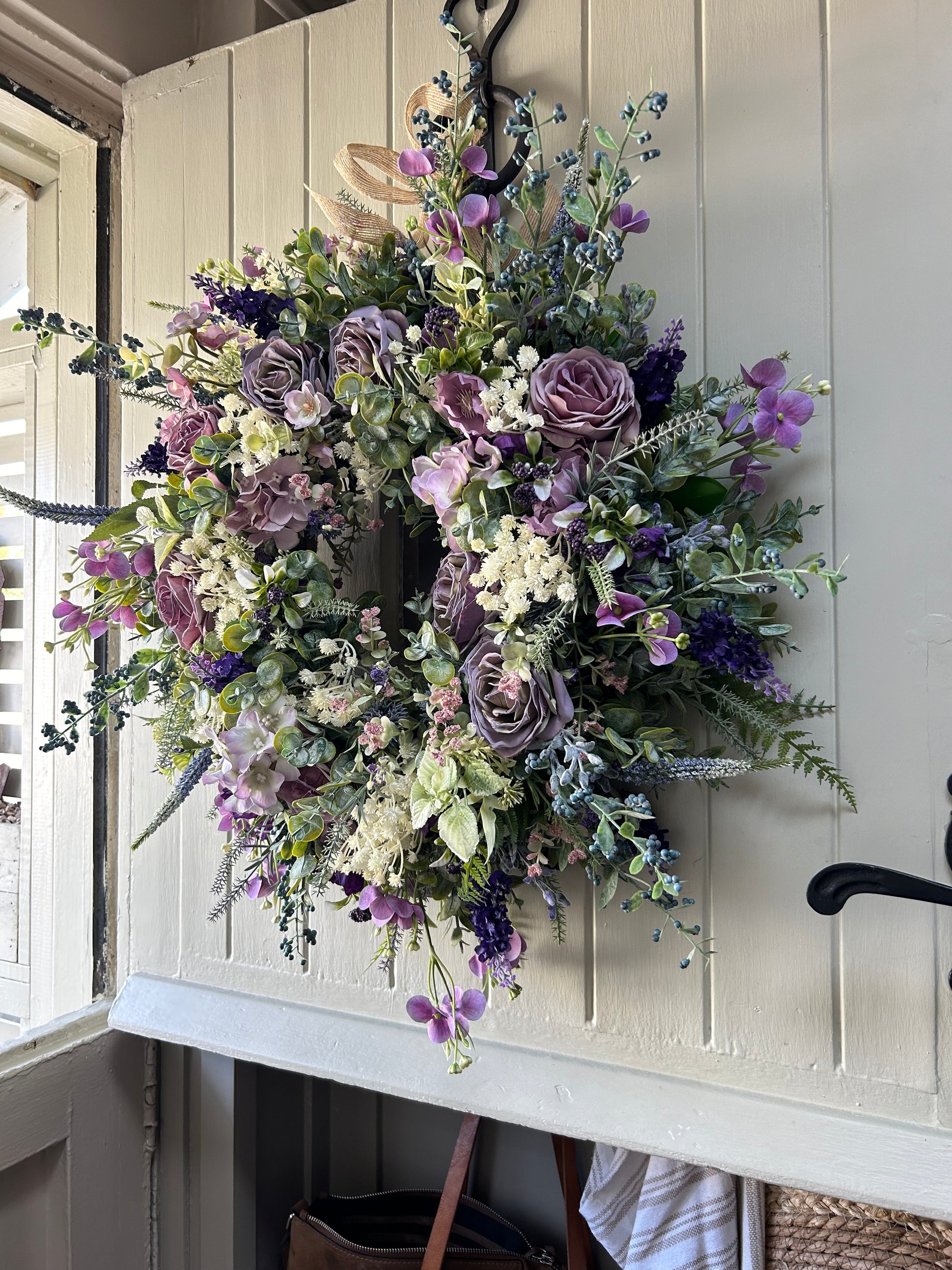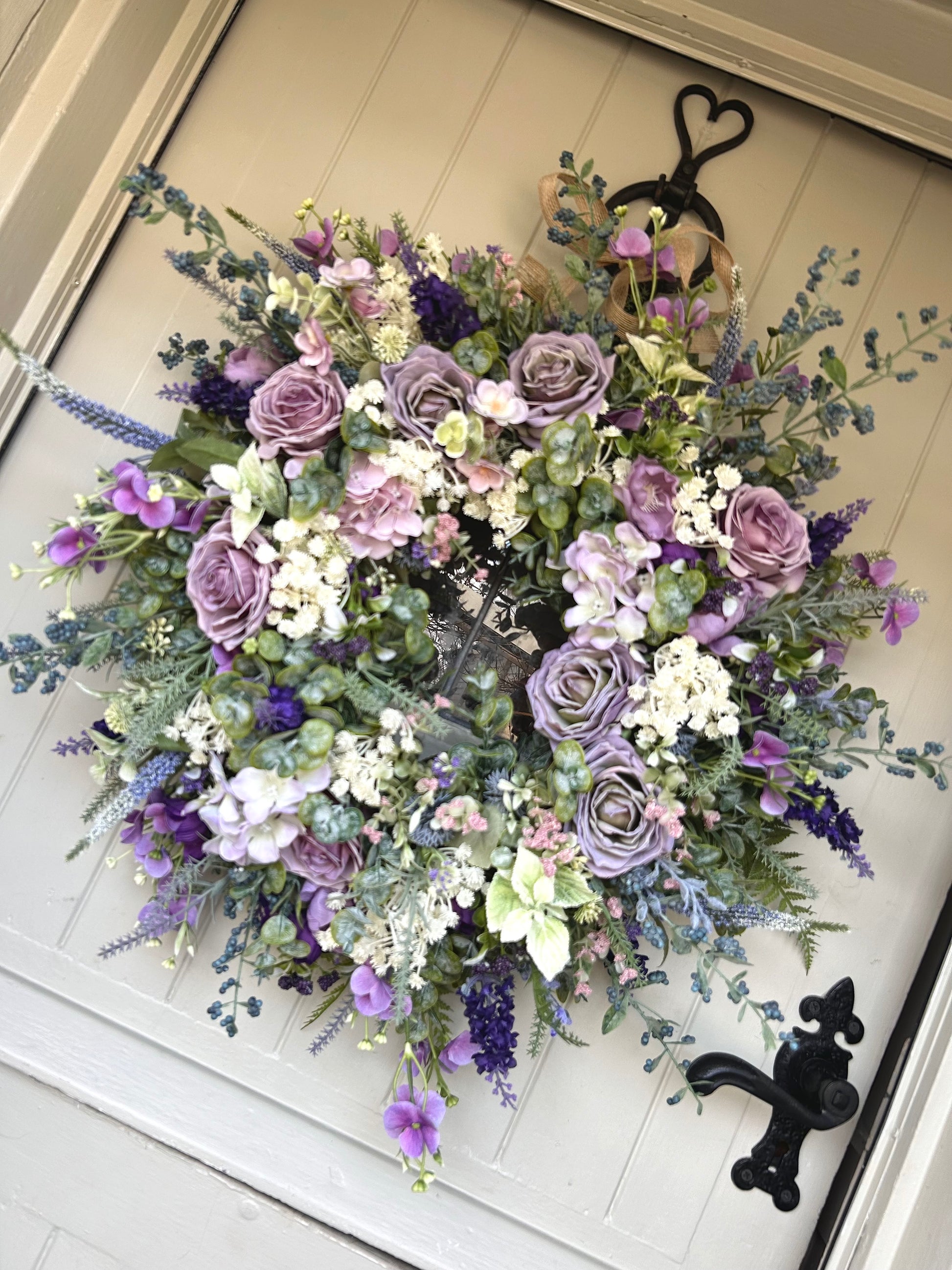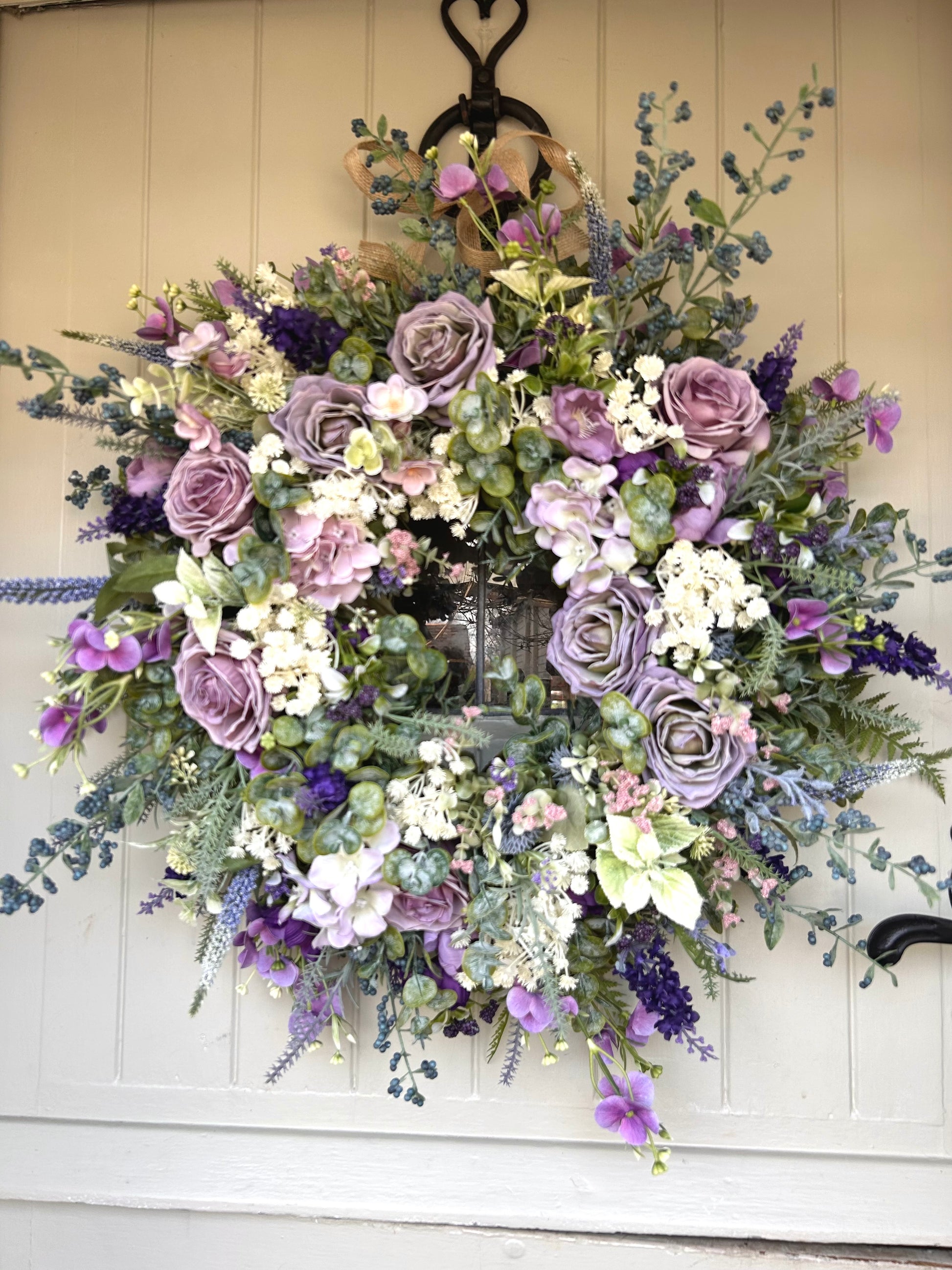 Introducing “Luella” a sophisticated full bloom artificial wreath. Crafted with hydrangea flowers dry touch roses and rananculus this wreath is chunky, lush, and weather-protected, ensuring a beautiful display that will last for years. Plus, free shipping with purchase. Add a touch of elegance and beauty to your home.