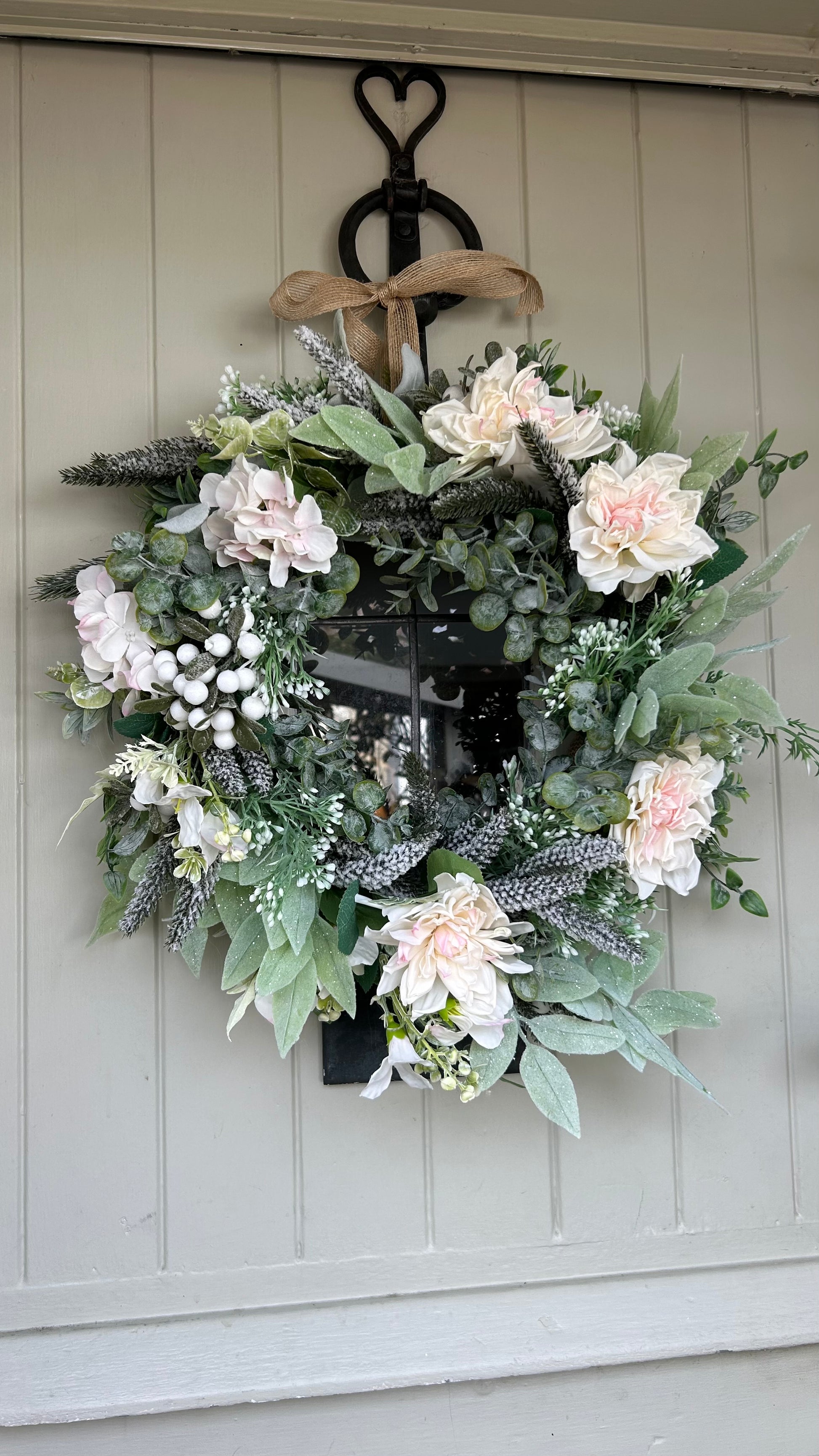 This gorgeous luxury faux wreath is made with faux lambs ears, hydrangeas and winter berries, a perfect wreath to see you through the winter months but equally as pretty around the home all year