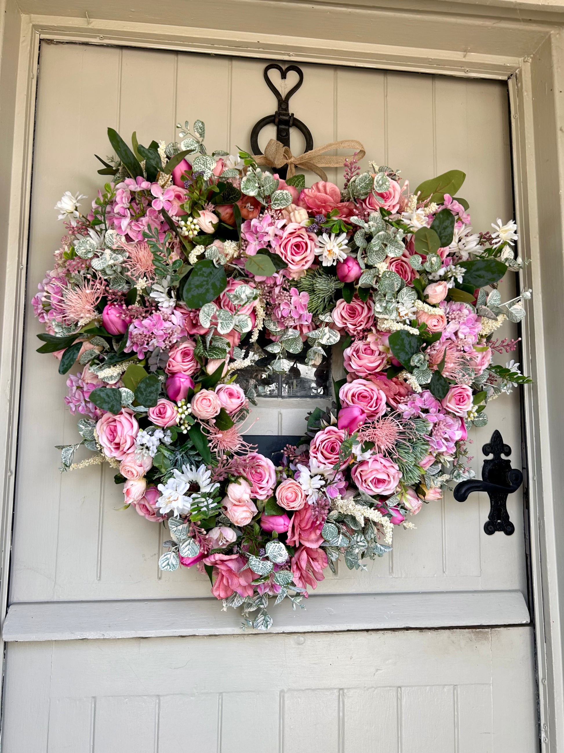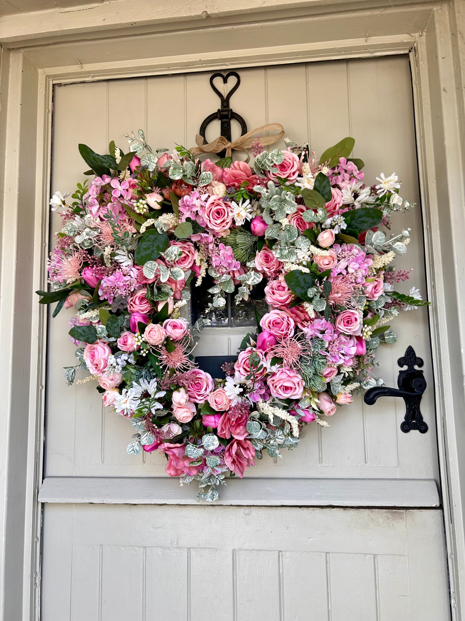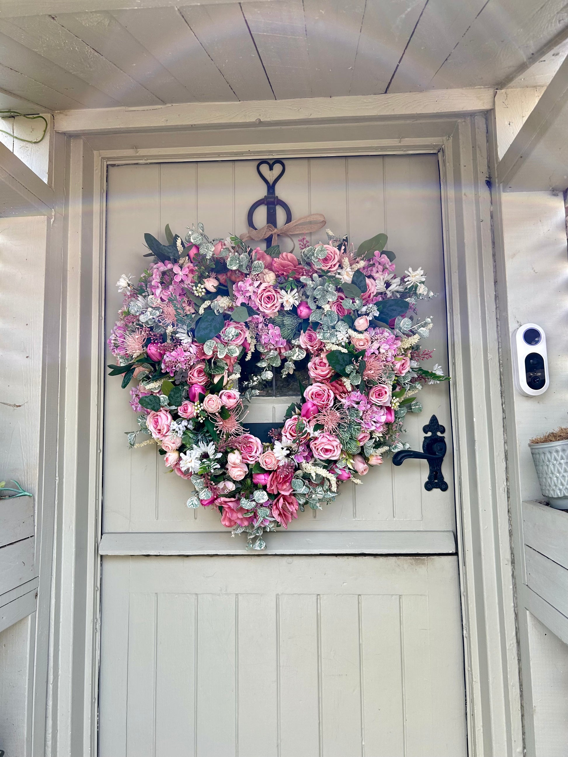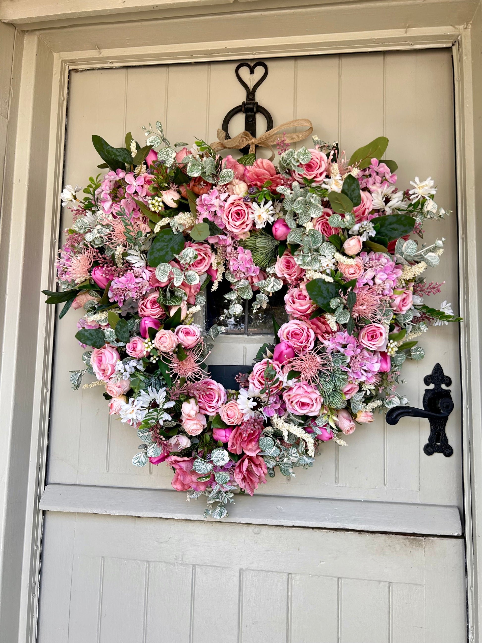Introducing the “NANCY” a sophisticated full bloom artificial wreath. Crafted with hydrangea flowers dry touch roses and rananculus this wreath is chunky, lush, and weather-protected, ensuring a beautiful display that will last for years. Plus, free shipping with purchase. Add a touch of elegance and beauty to your home.