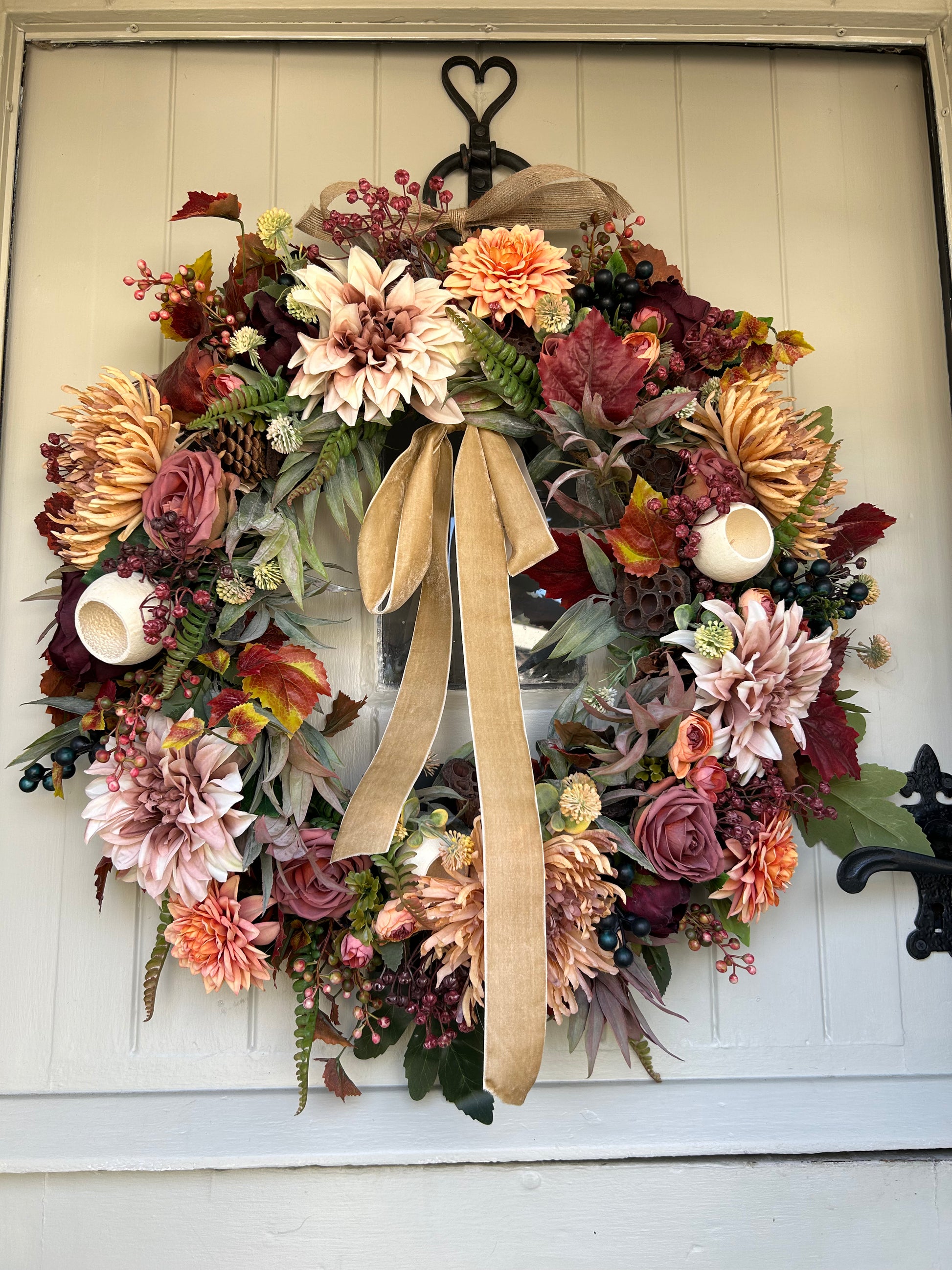 Introducing “PIA” a sophisticated AUTUMN bloom artificial wreath. Crafted with roses plus dry touch roses and weather-protected, ensuring a beautiful display that will last for years. Plus, free shipping with purchase. Add a touch of elegance and beauty to your home.