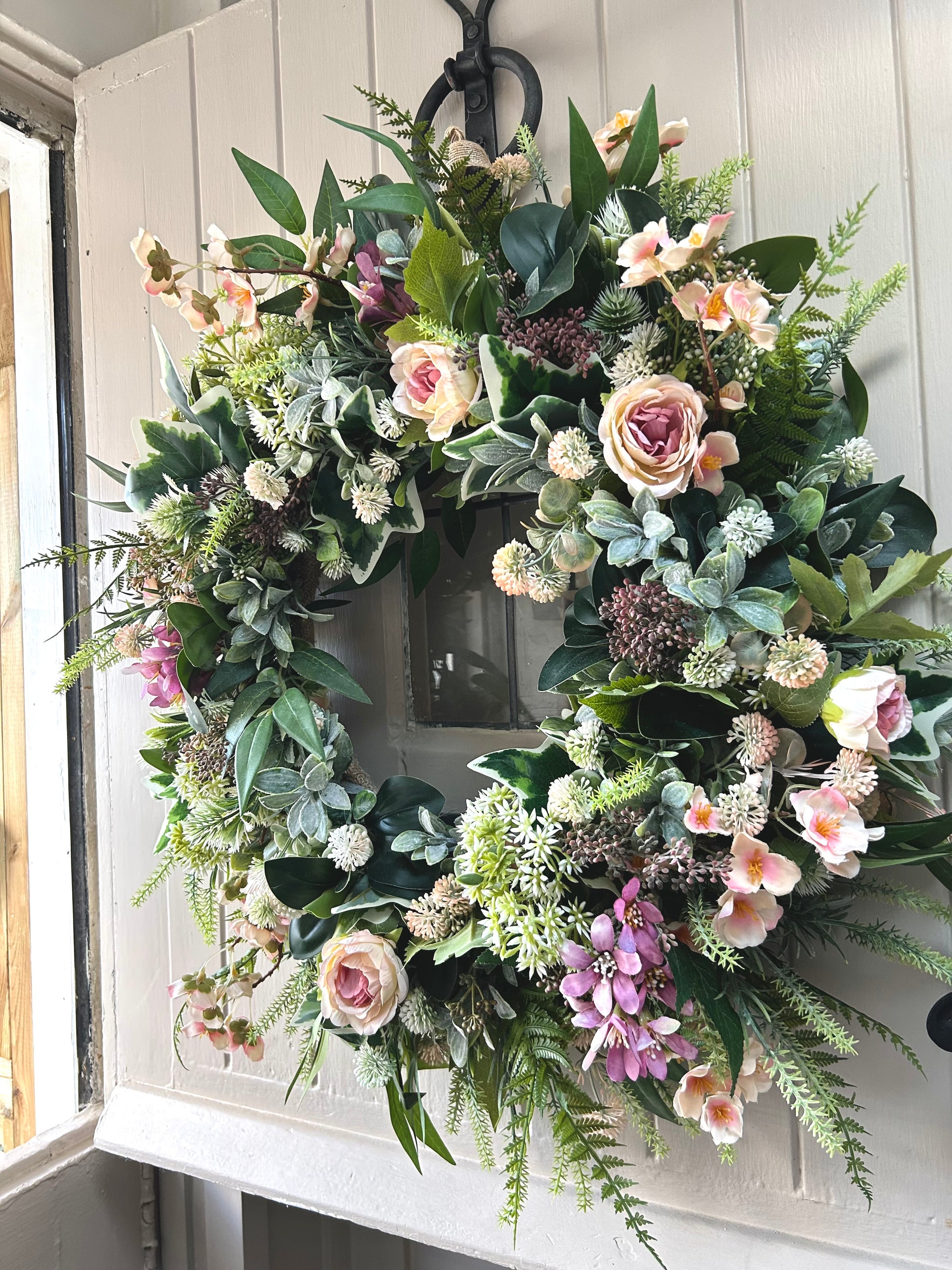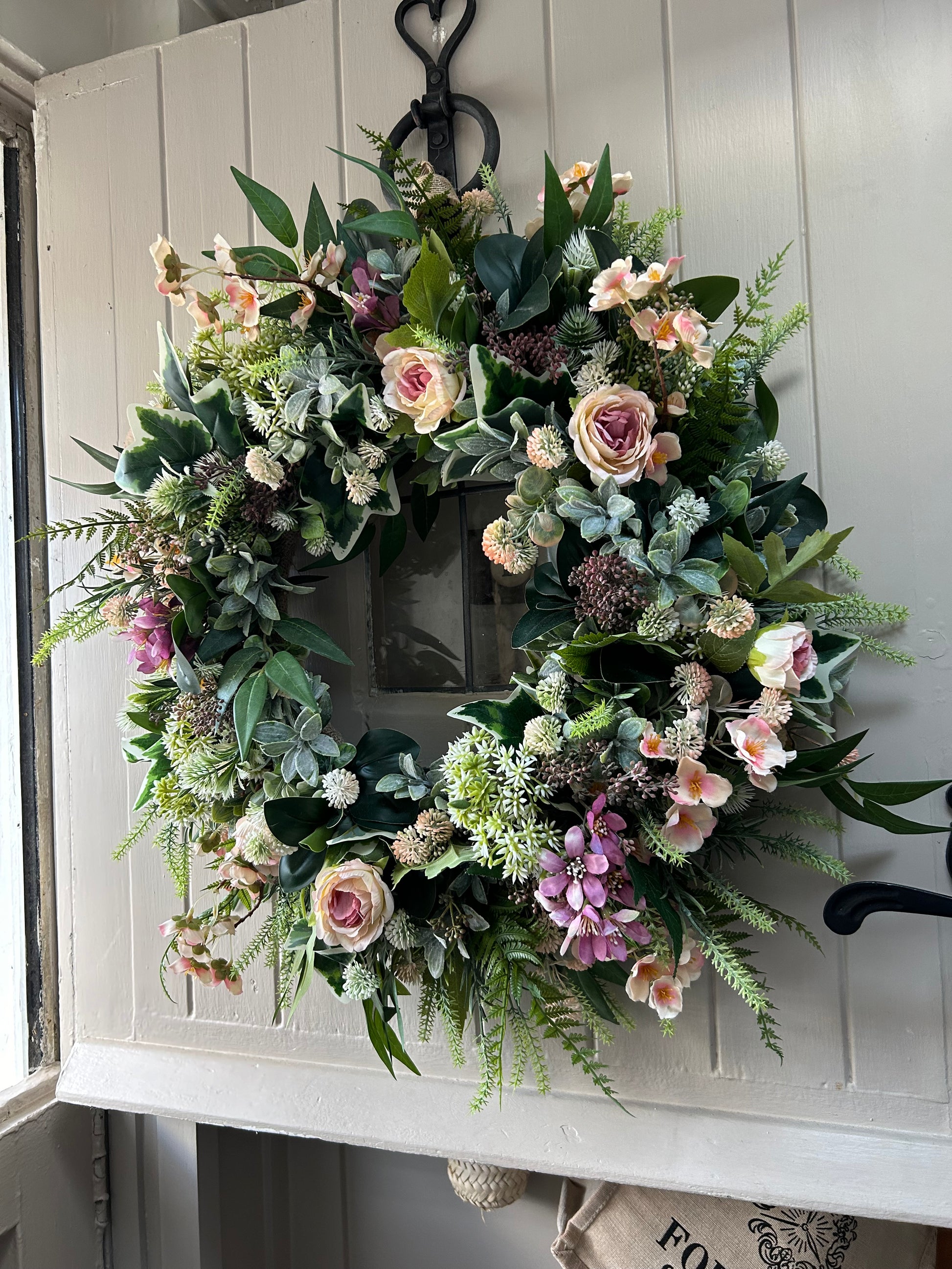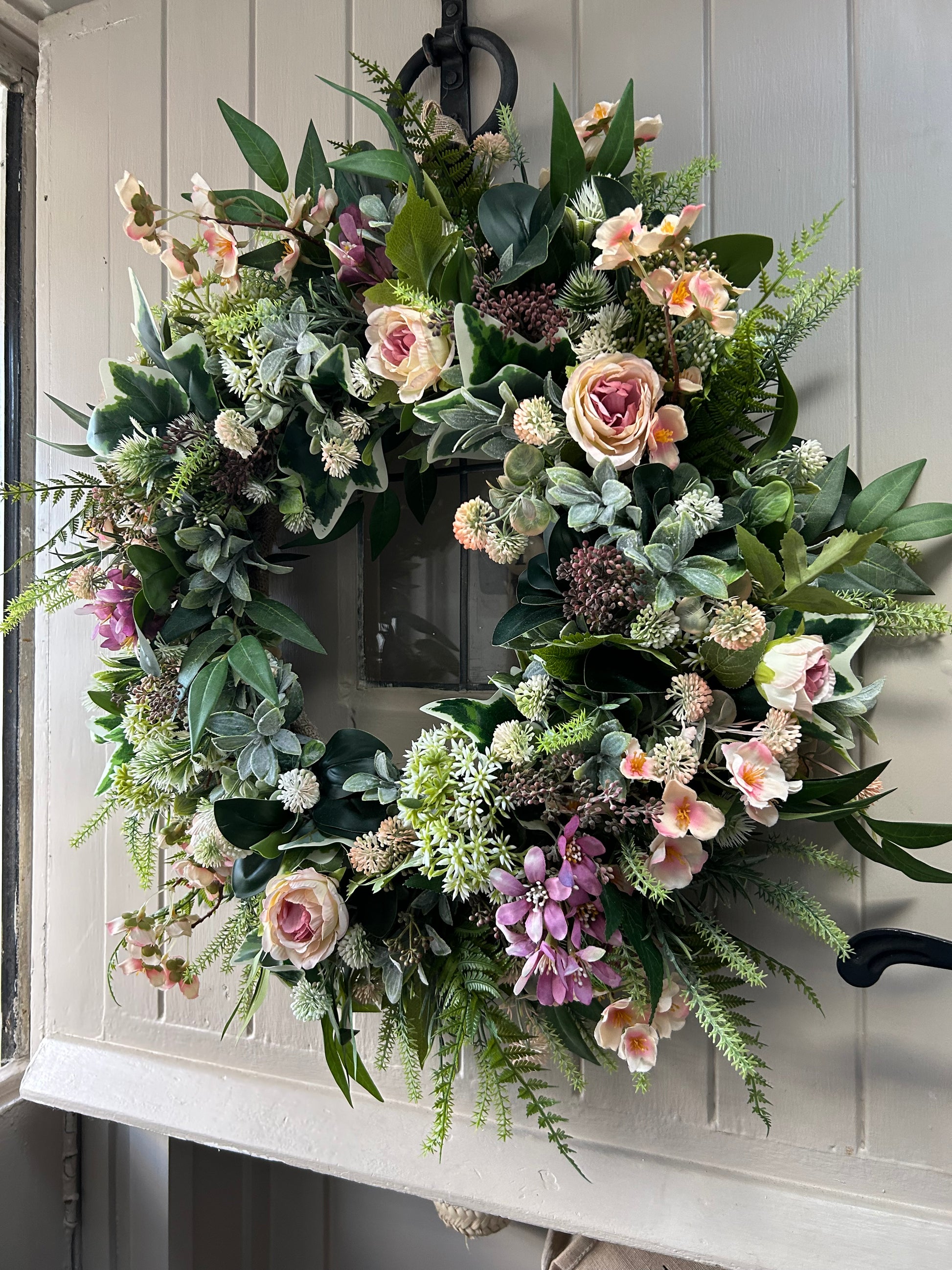 Add a touch of beauty to your home decor with this unique flower wreath that blooms all year round.The mix of berry’s, blossom and foliage give this a chic all year wreath