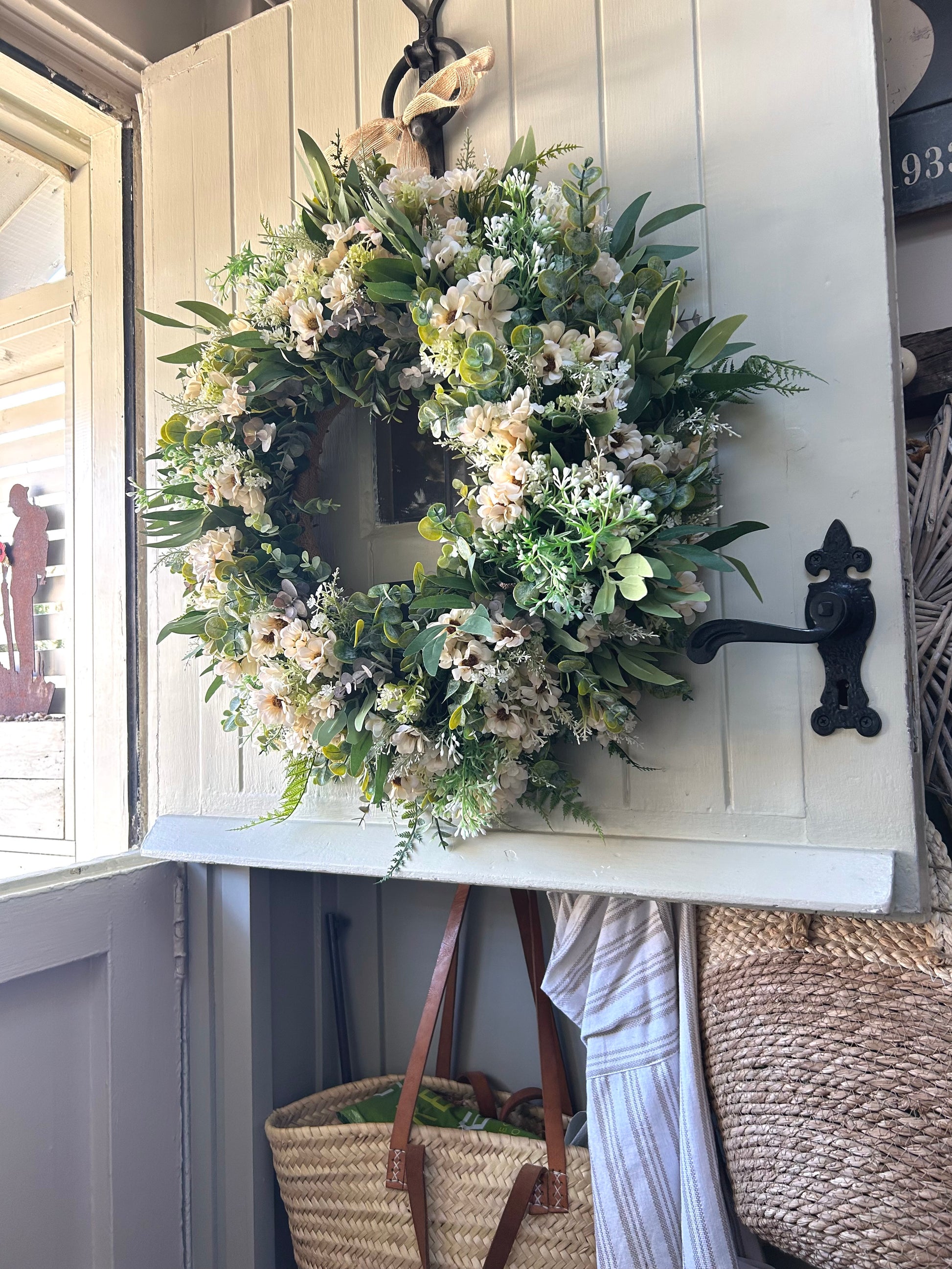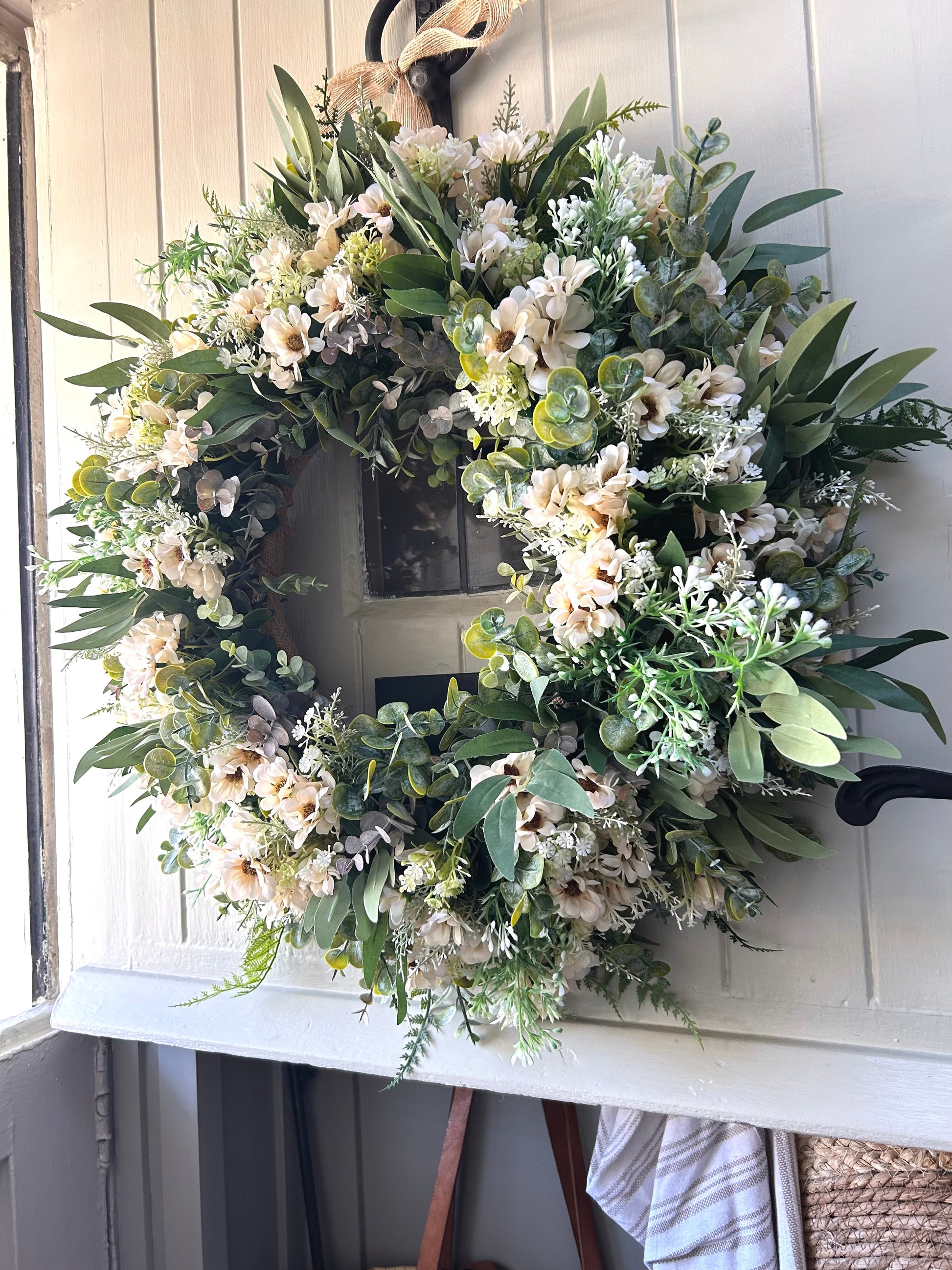 Add a touch of rustic charm to your door or wall with “SIENNA” a lifelike faux flower wreath. Crafted with intricate details, this handmade wreath captures a natural look and feel without any of the maintenance of a real wreath. A perfect addition to any country-style decor.