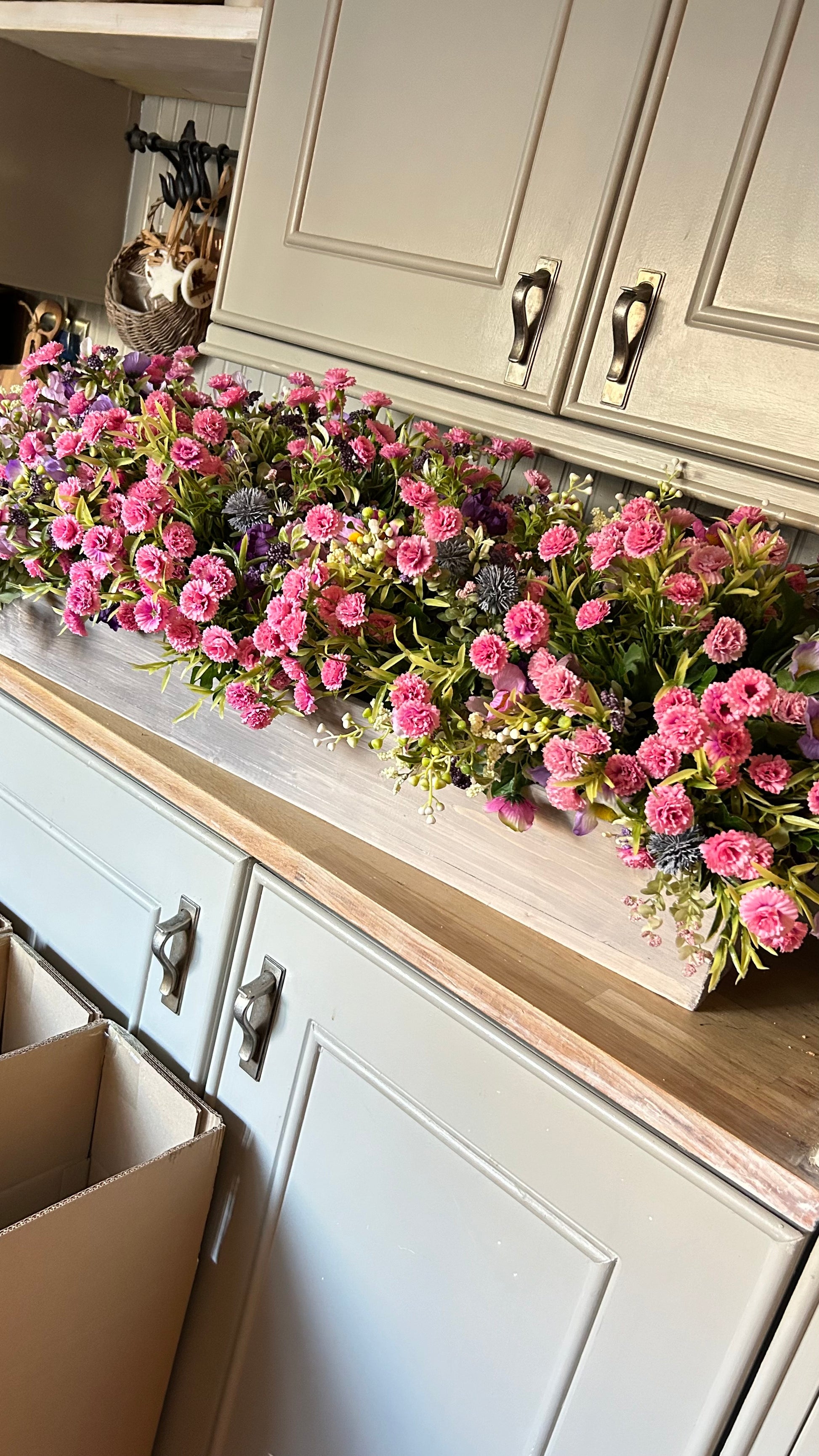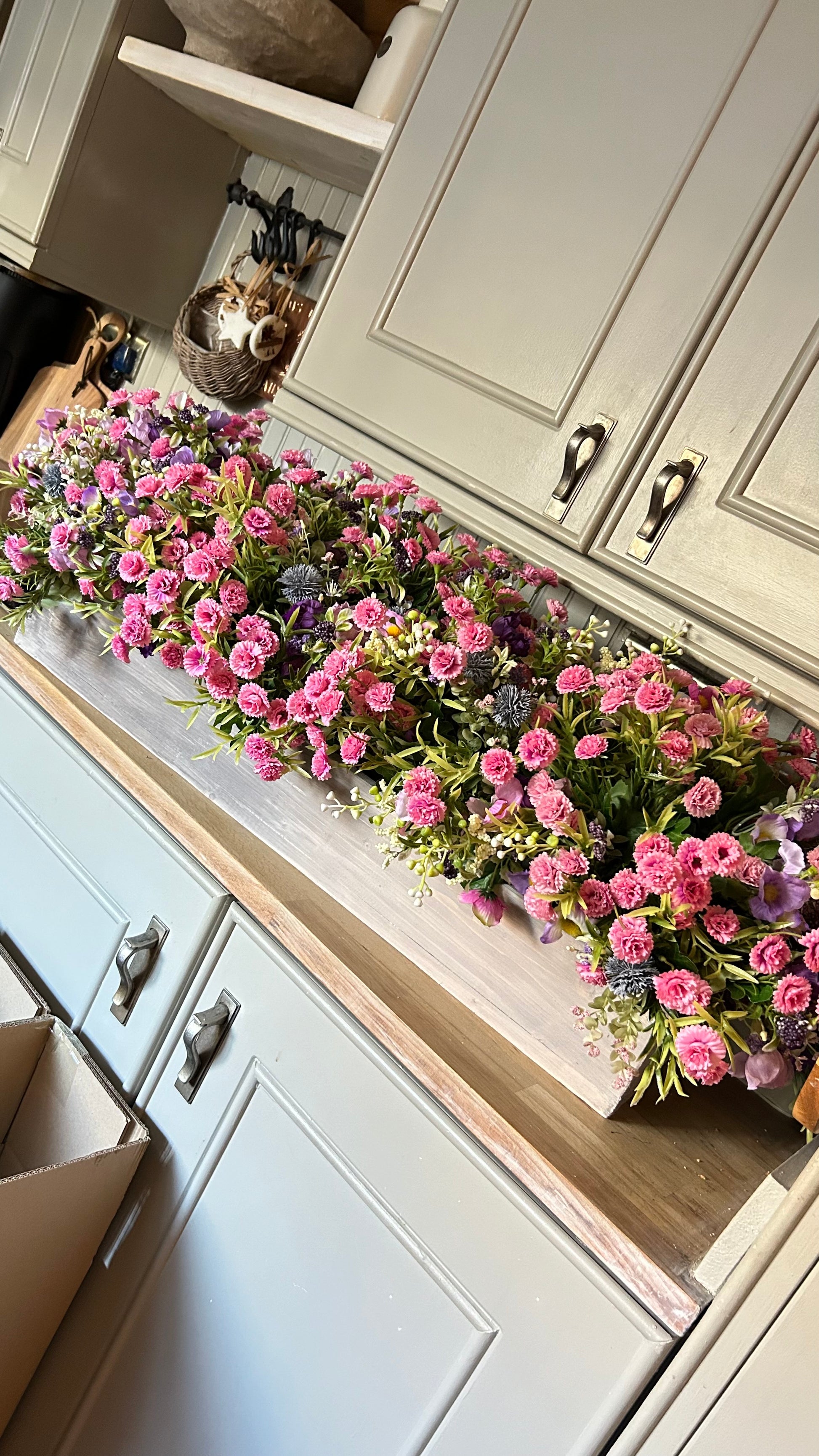 wooden (TROUGH FLOWER BOX) is crafted with sturdy wooden construction, made using reclaimed wood with a rustic finish to add an eye-catching display Our overlays of silk flowers will add vibrant colour and a lively atmosphere to any room.