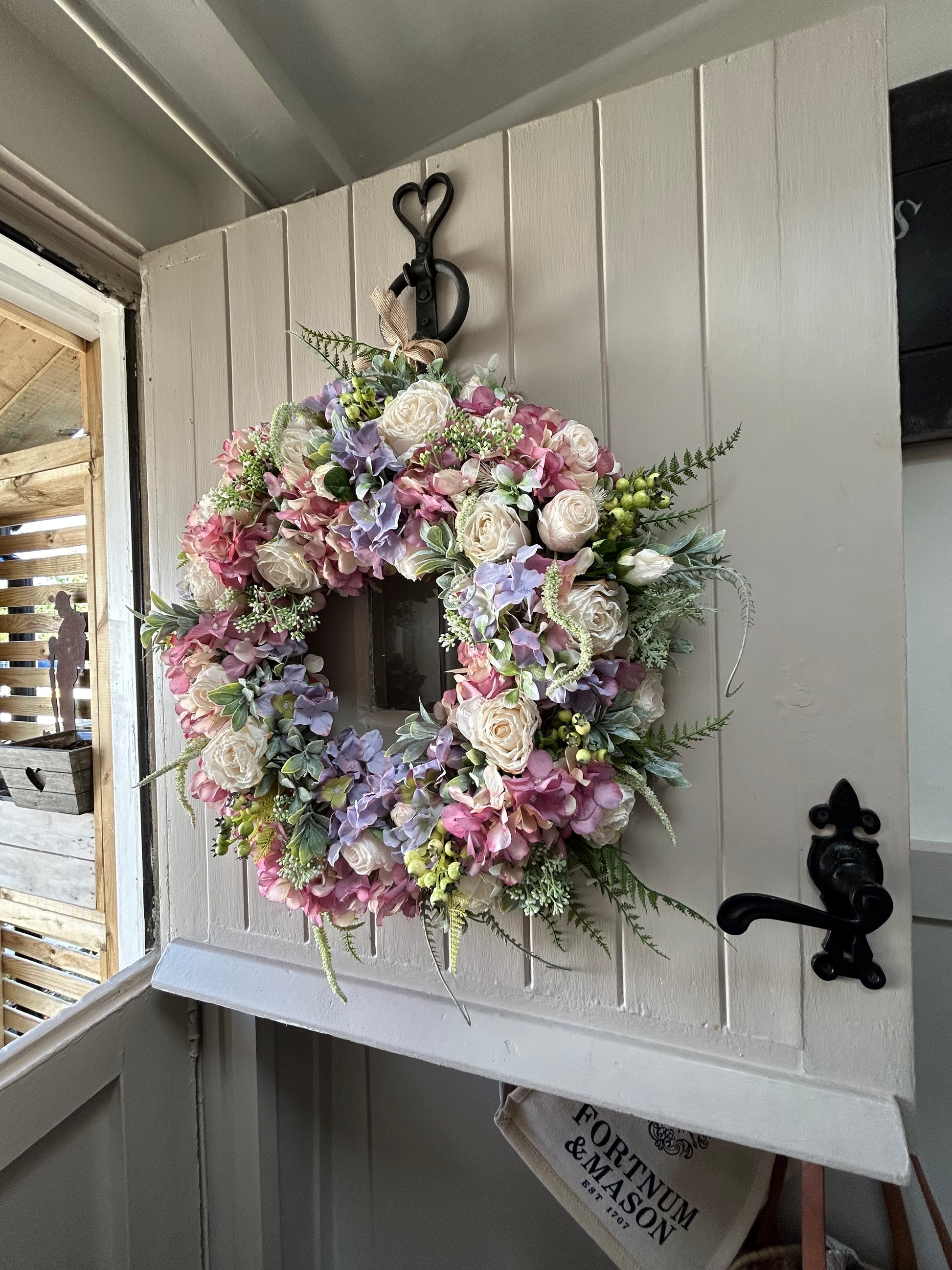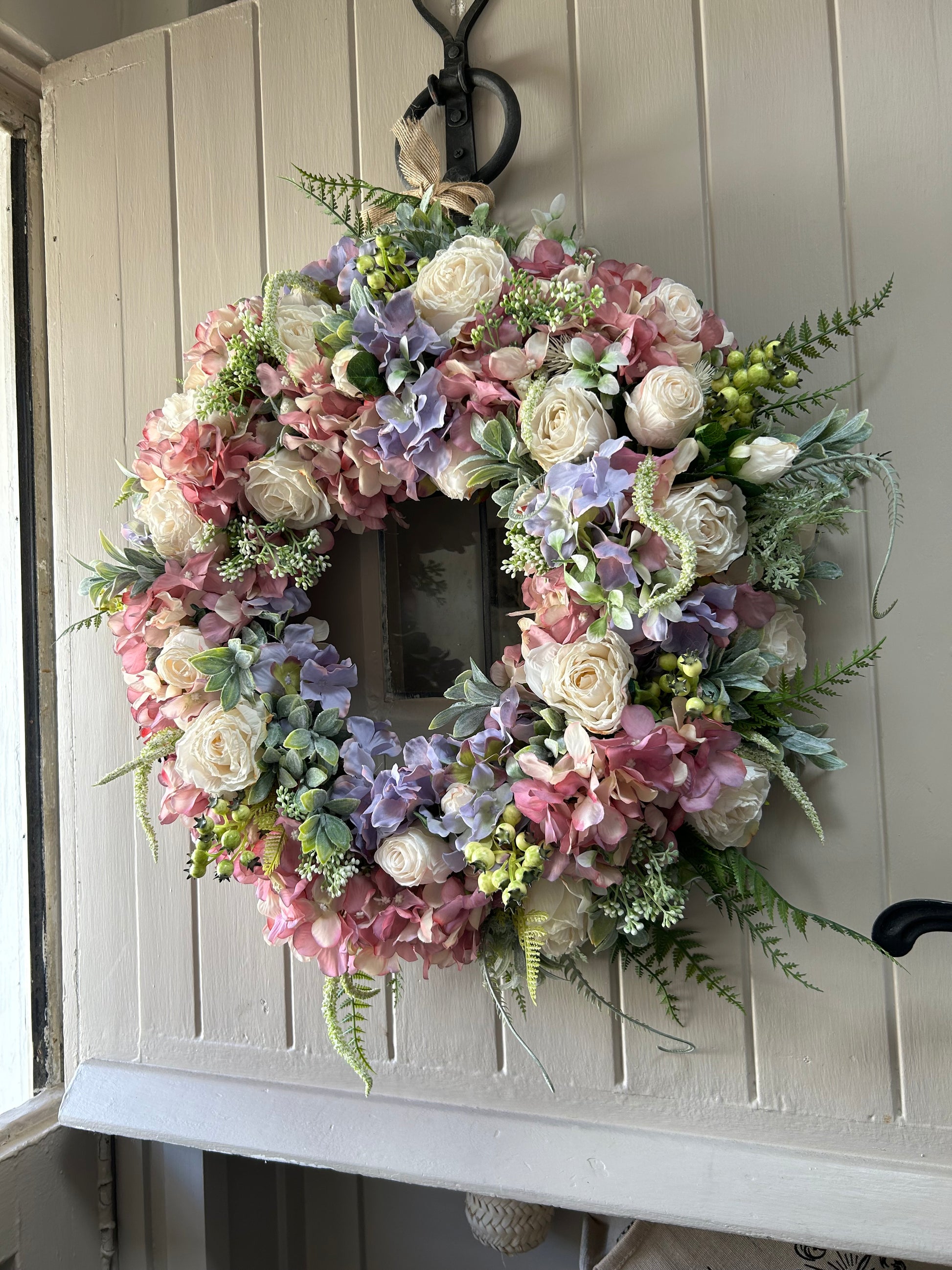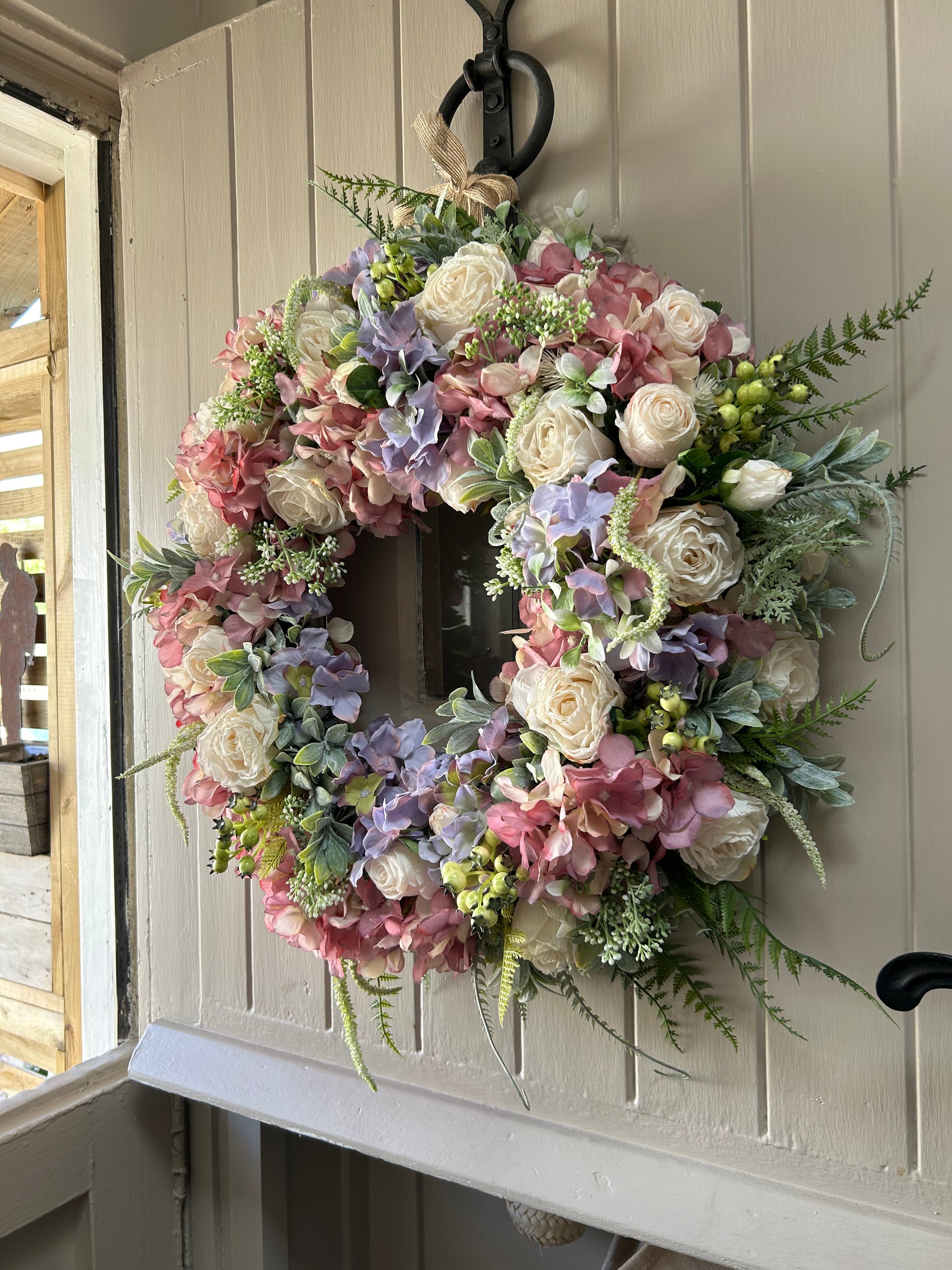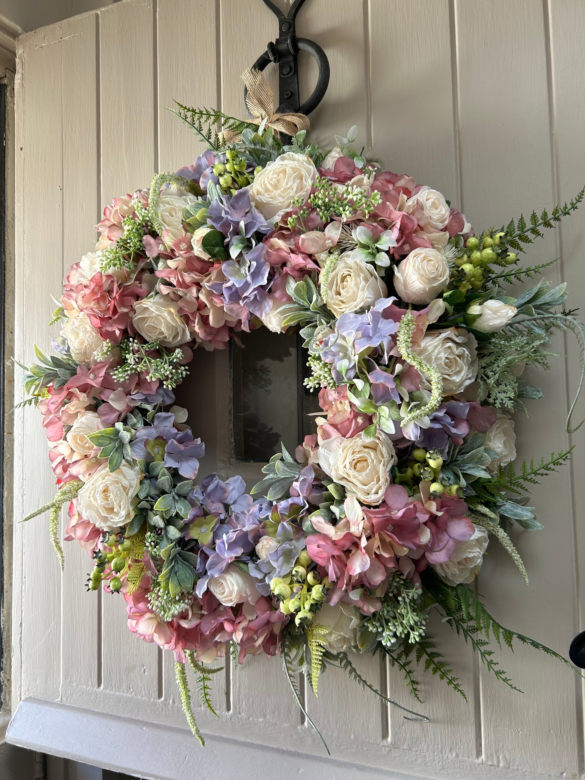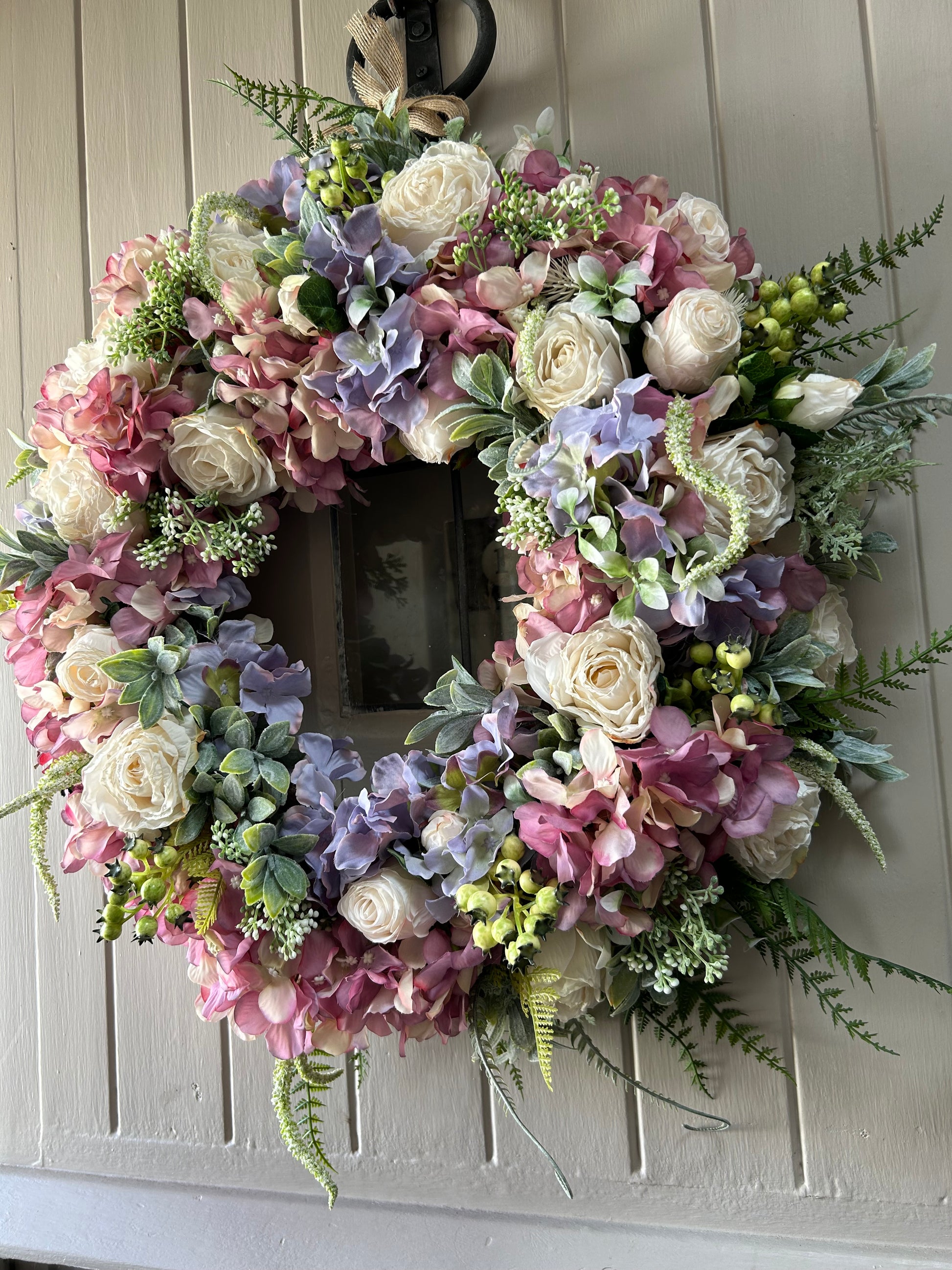 Introducing "SUZIE," a sophisticated full bloom artificial wreath. Crafted with hydrangea flowers dry touch roses and rananculus this wreath is chunky, lush, and weather-protected, ensuring a beautiful display that will last for years. Plus, free shipping with purchase. Add a touch of elegance and beauty to your home.