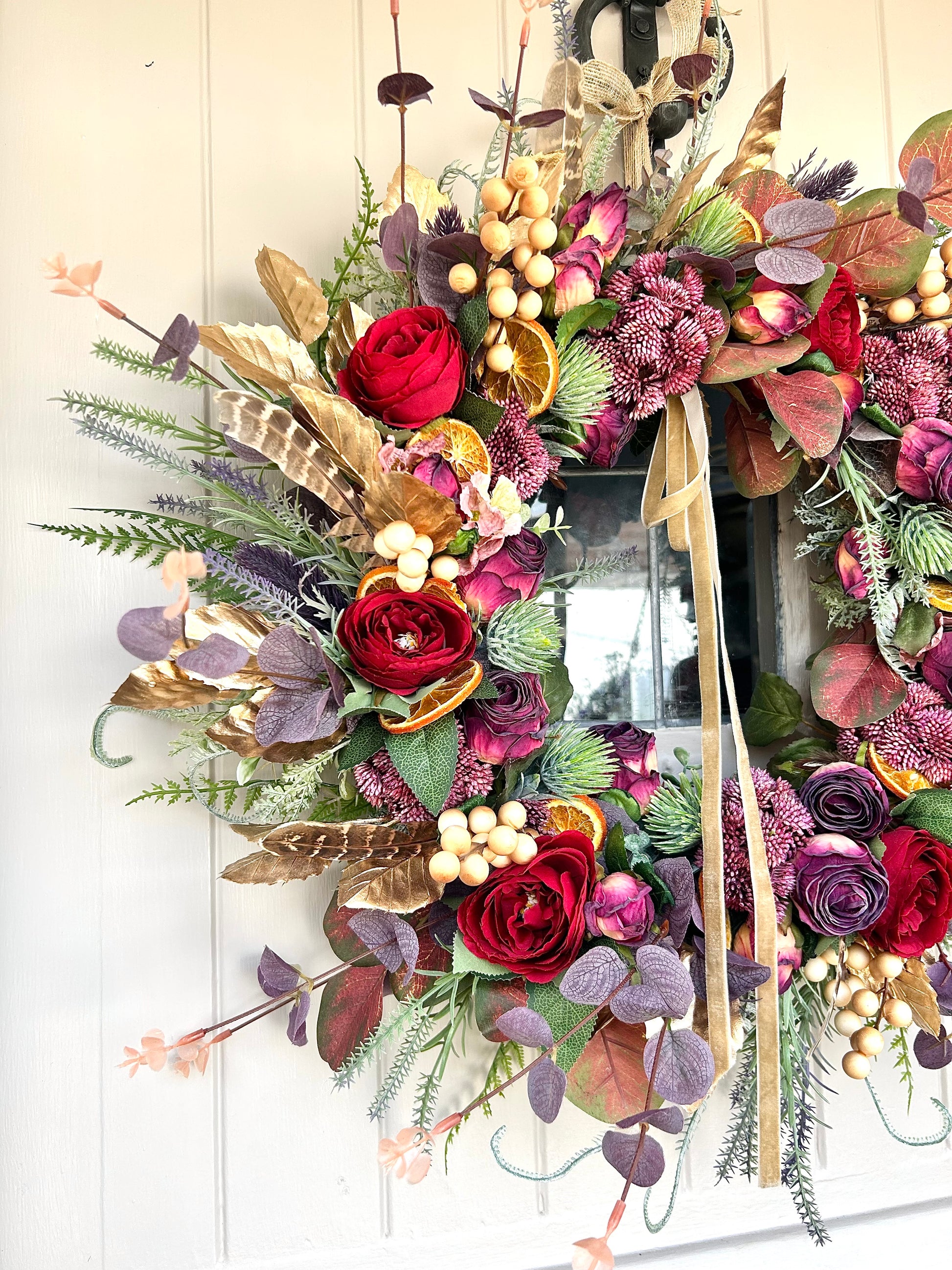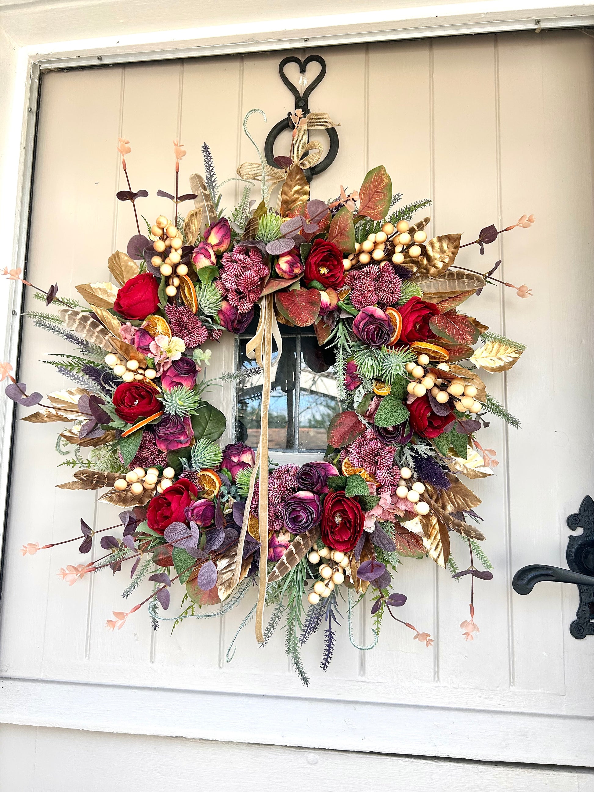 This exquisite “LADY DARCY” artificial autumn and winter wreath is the perfect addition to your holiday décor. With its bold-colored feathers, dry touch roses, peonies, and oranges, it will add a luxurious, regal look to your home. Perfect for winter or Christmas celebrations, this free P&P wreath is guaranteed to add a festive touch.