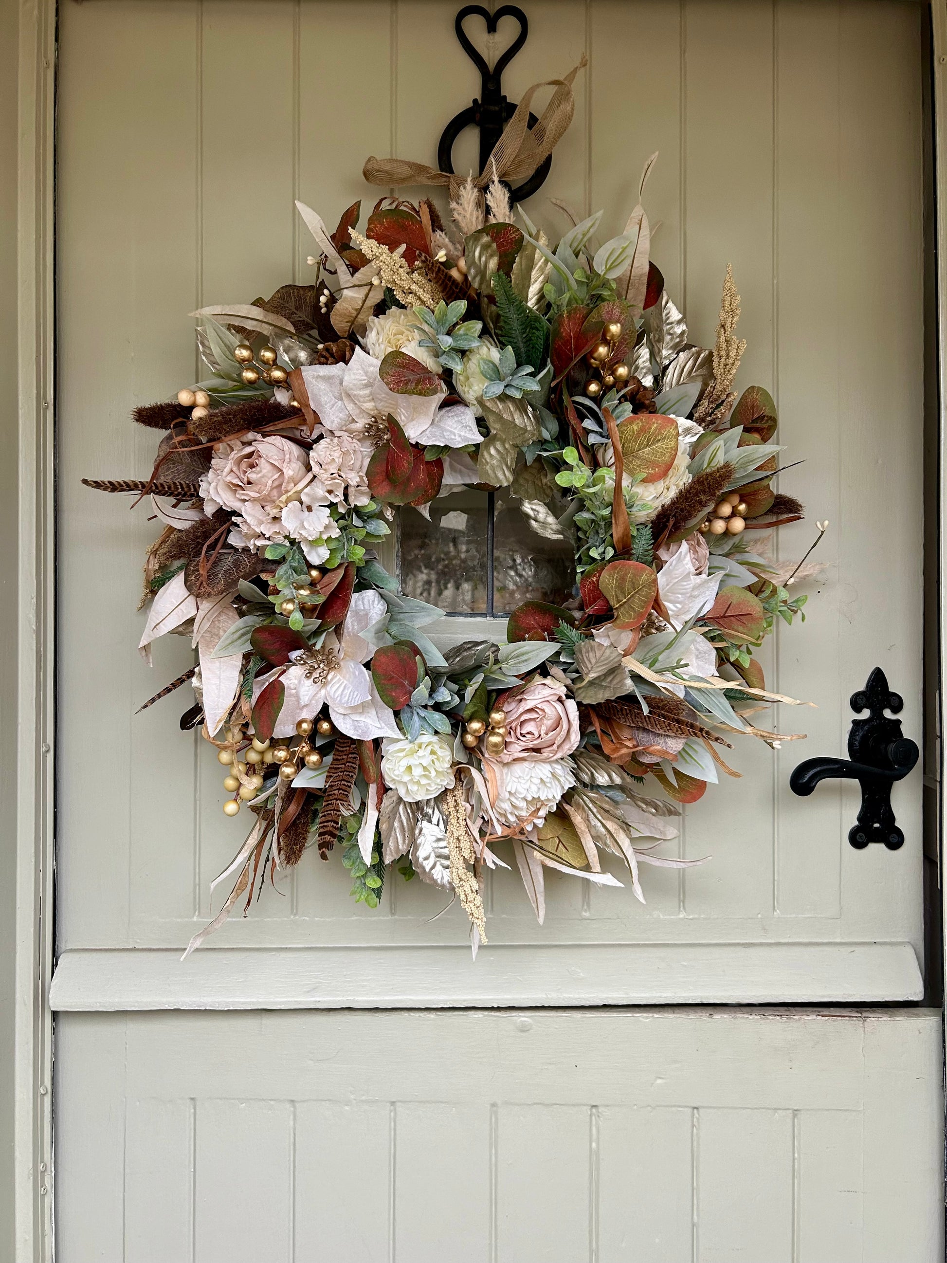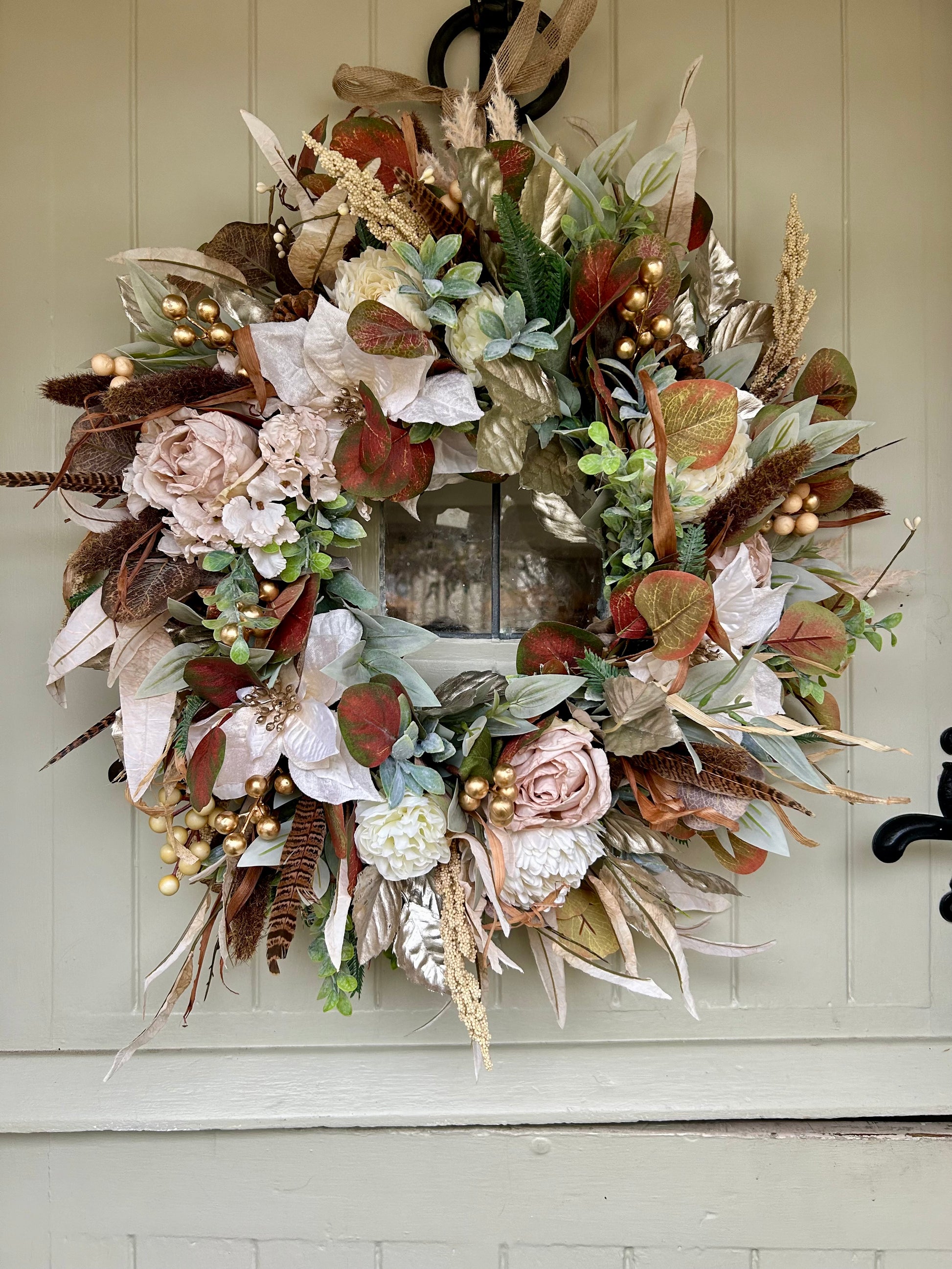 Introducing a sophisticated winter bloom artificial wreath. Crafted dahlias and weather-protected, ensuring a beautiful display that will last for years. Plus, free shipping with purchase. Add a touch of elegance and beauty to your home.