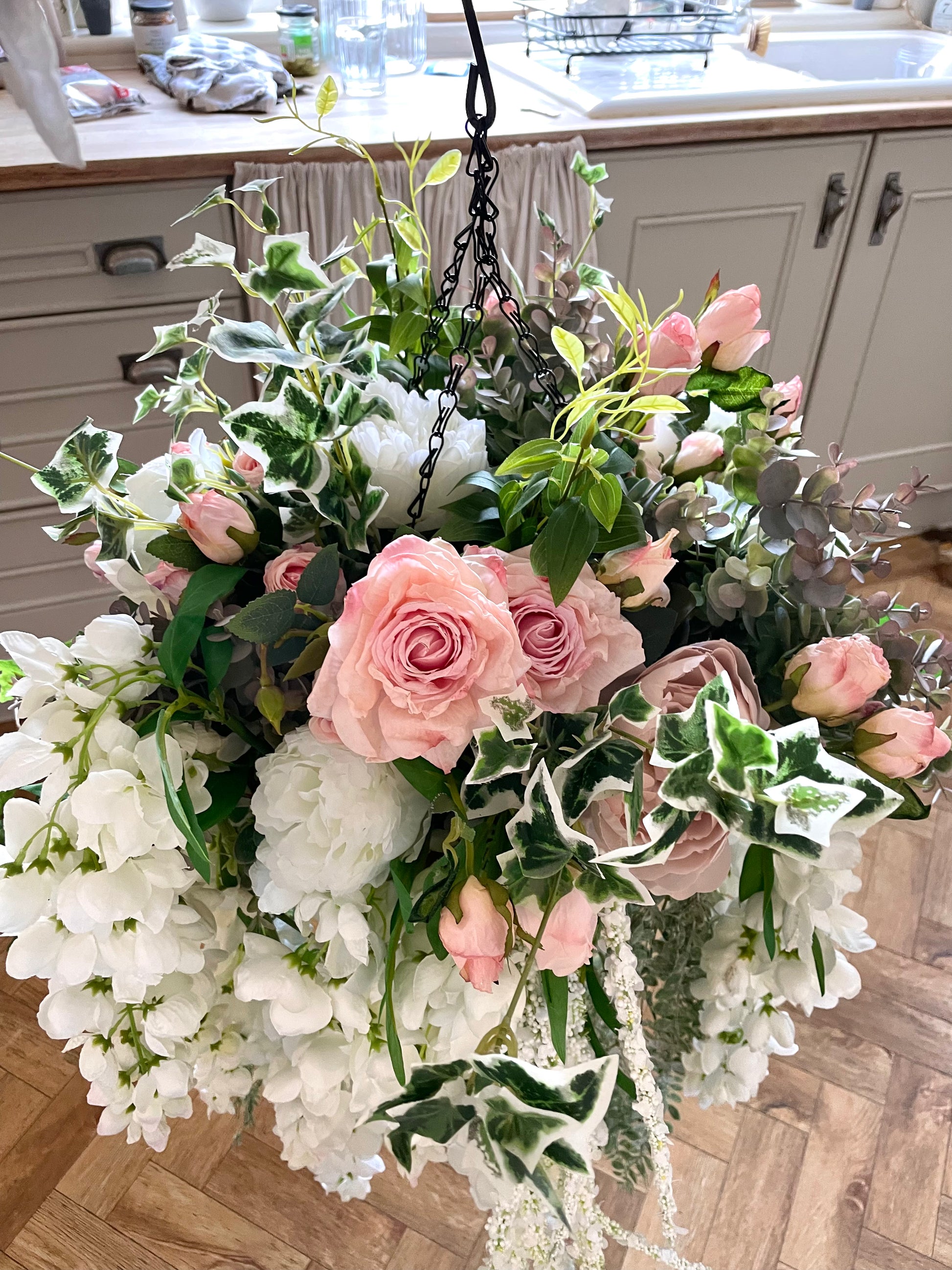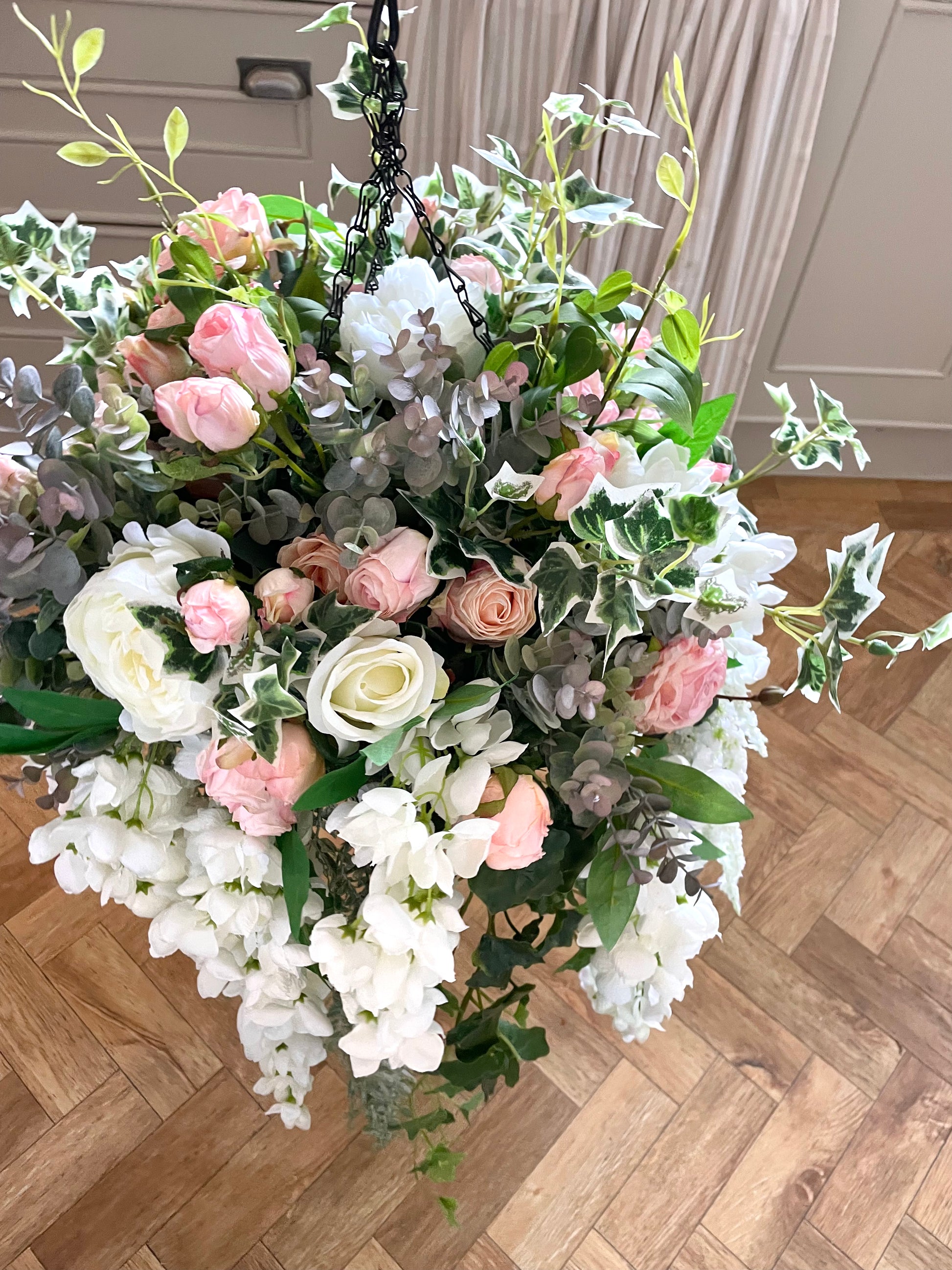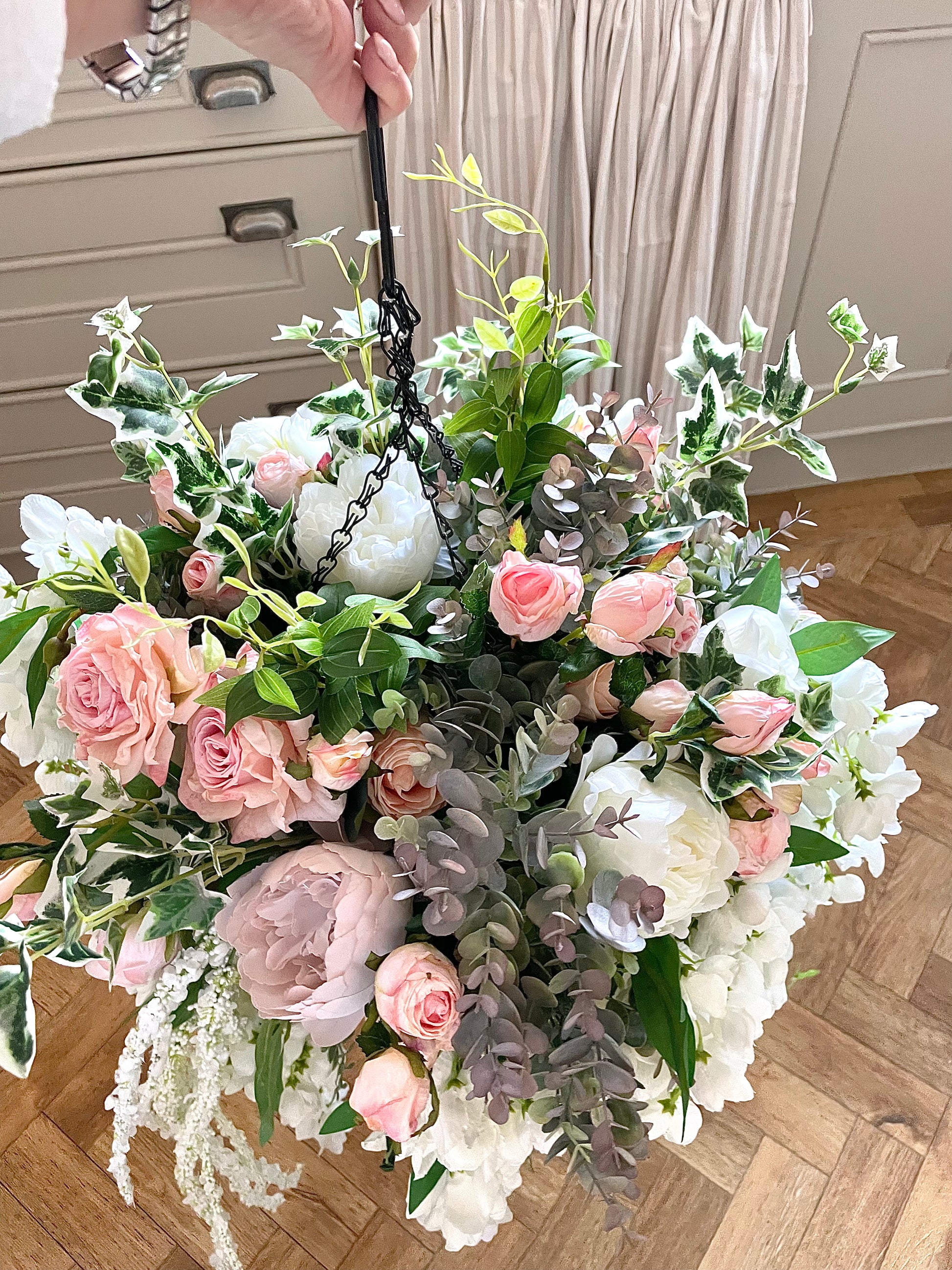 This Pink Rose and Ivy Artificial Hanging Basket brings a luxurious, natural touch to your home or garden. Expertly crafted using realistic, dry-touch roses and ivy, it makes a stunning statement piece. Best of all, it requires no maintenance and looks breathtakingly beautiful year-round.